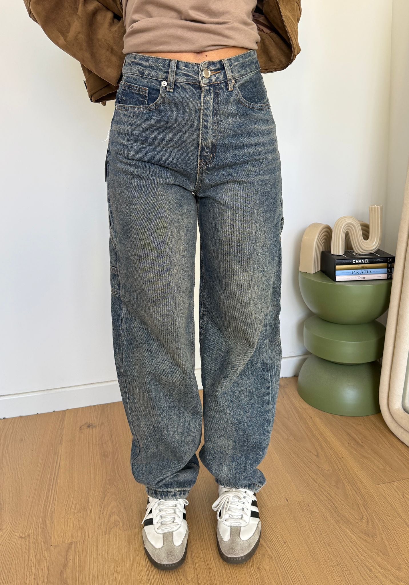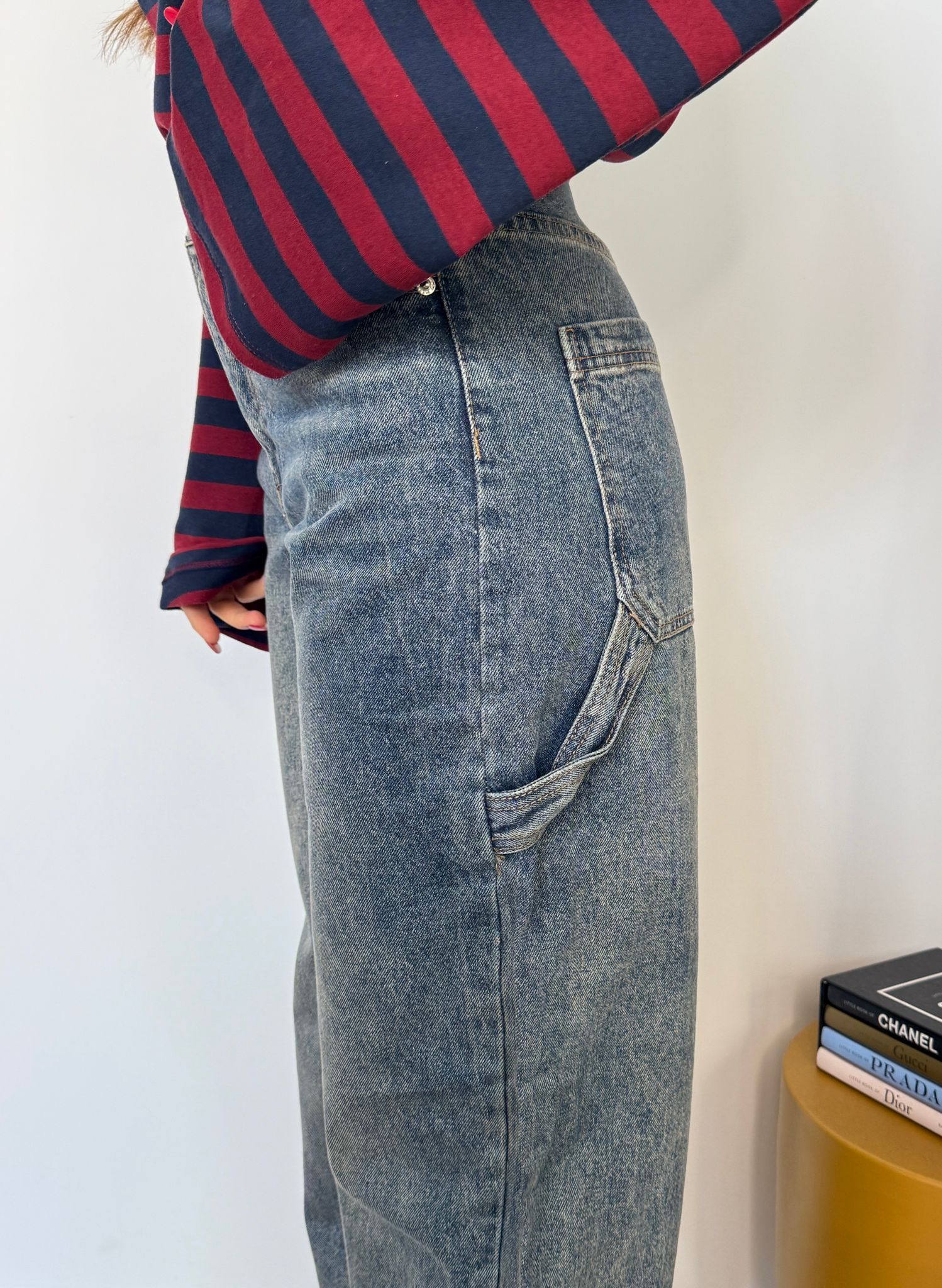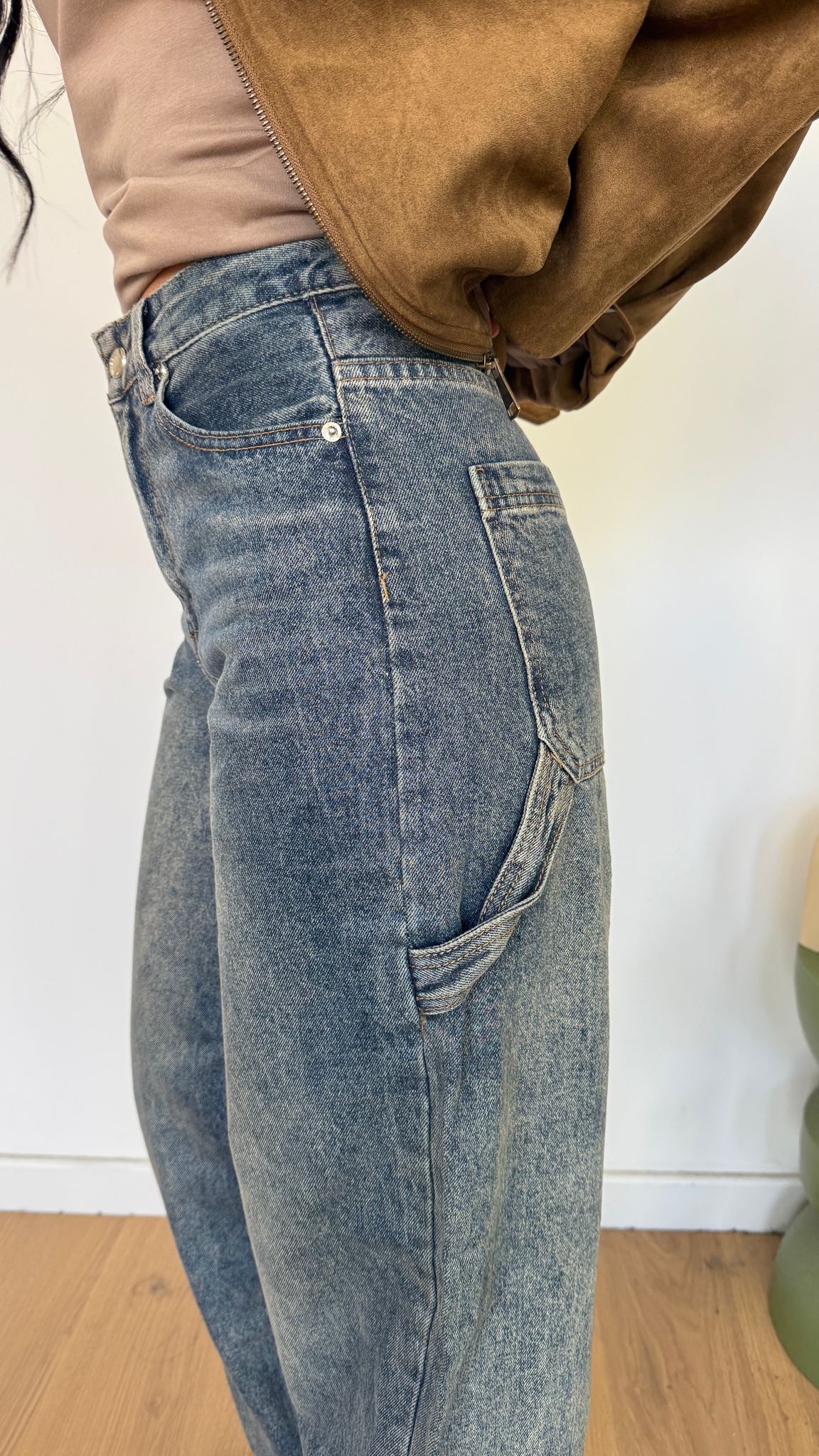 Jeans da donna in denim modello baggy carpenter in tela fissa non elasticizzato e veste regolarmente la propria taglia e la modella indossa taglia XS