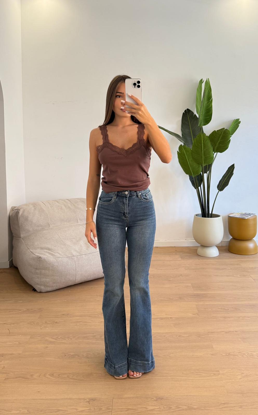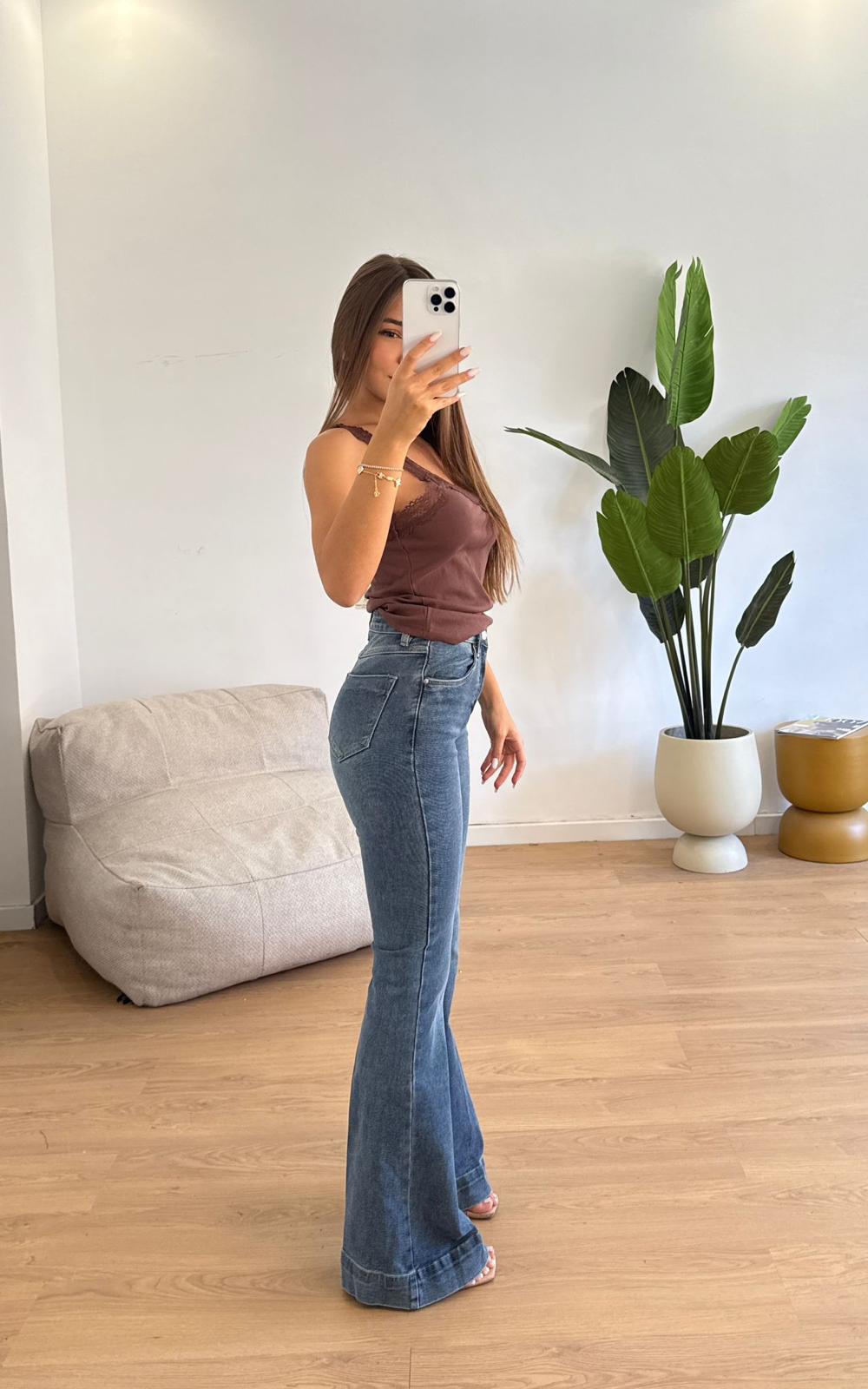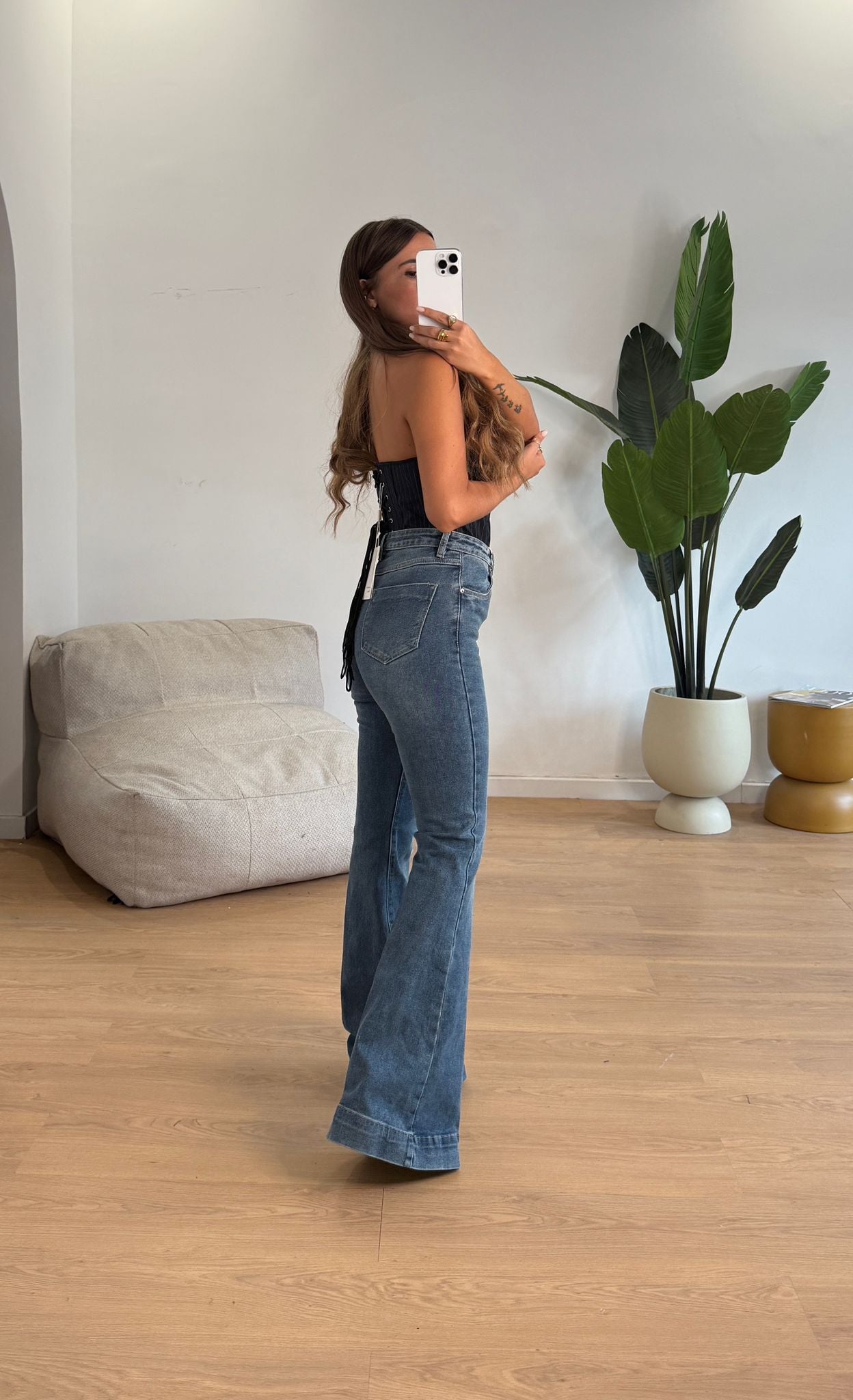 Jeans da donna in denim a zampa tessuto elasticizzato e veste regolarmente la propria taglia e L modella indossa taglia XS