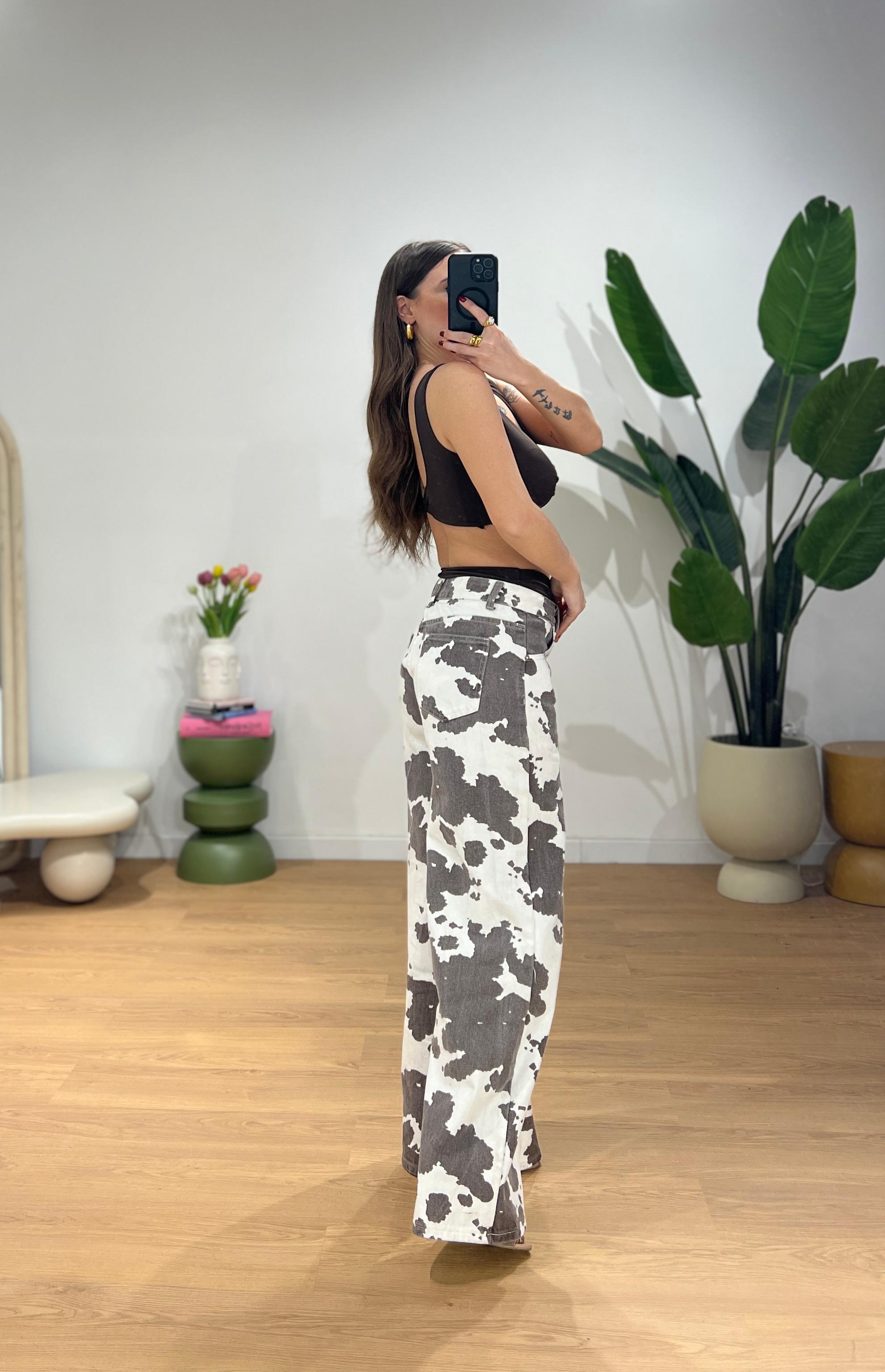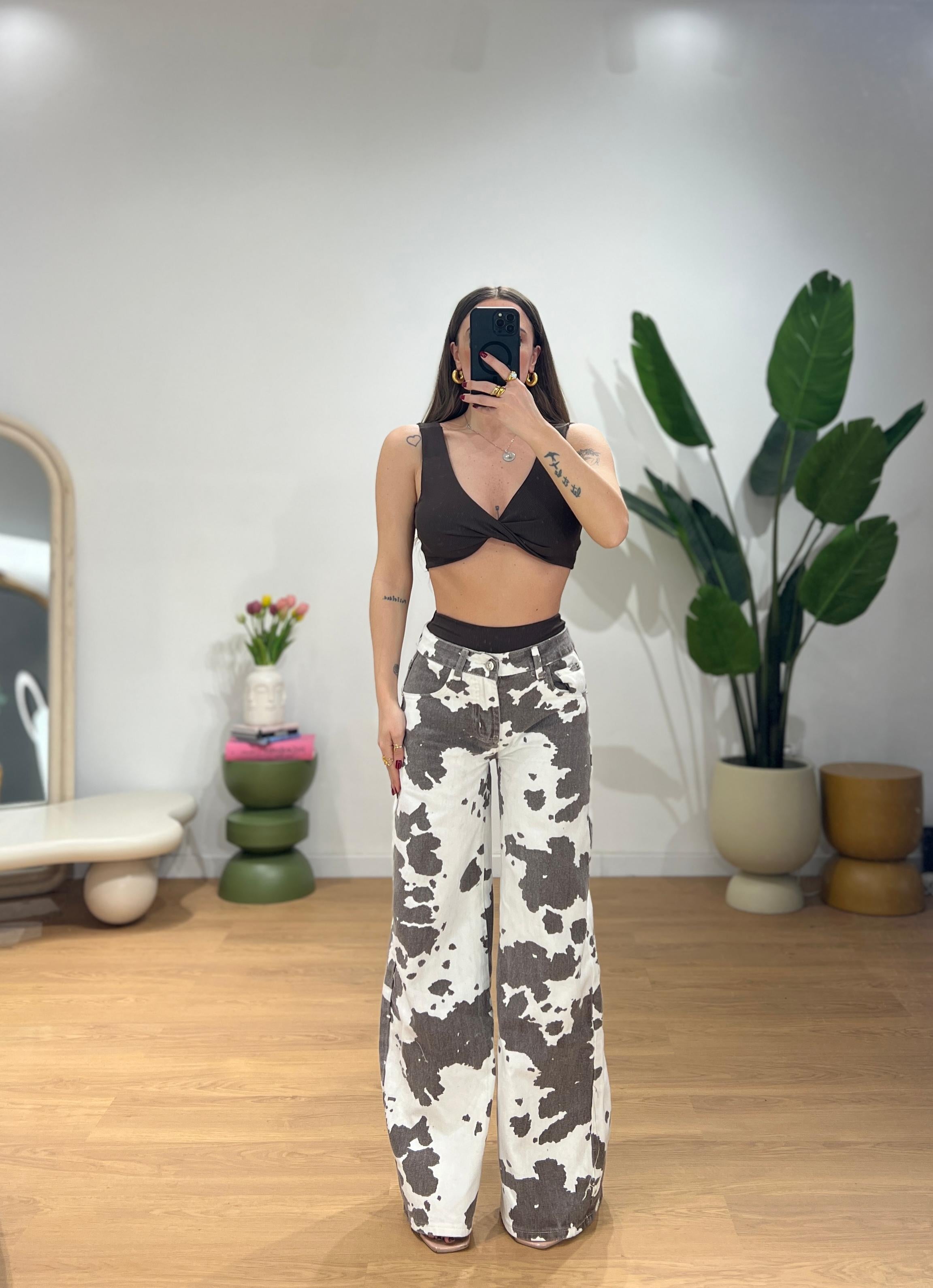 Jeans da donna modello wide leg fantasia muccata in tela fissa non elasticizzato e veste regolarmente la propria taglia e giusy indossa taglia S