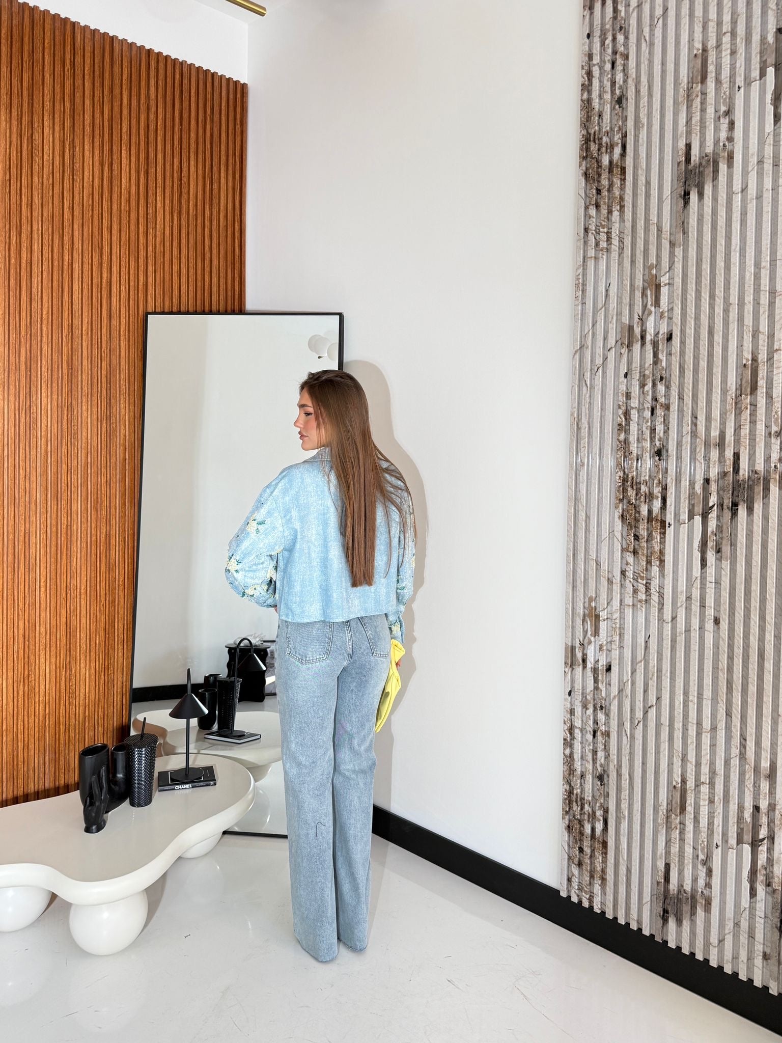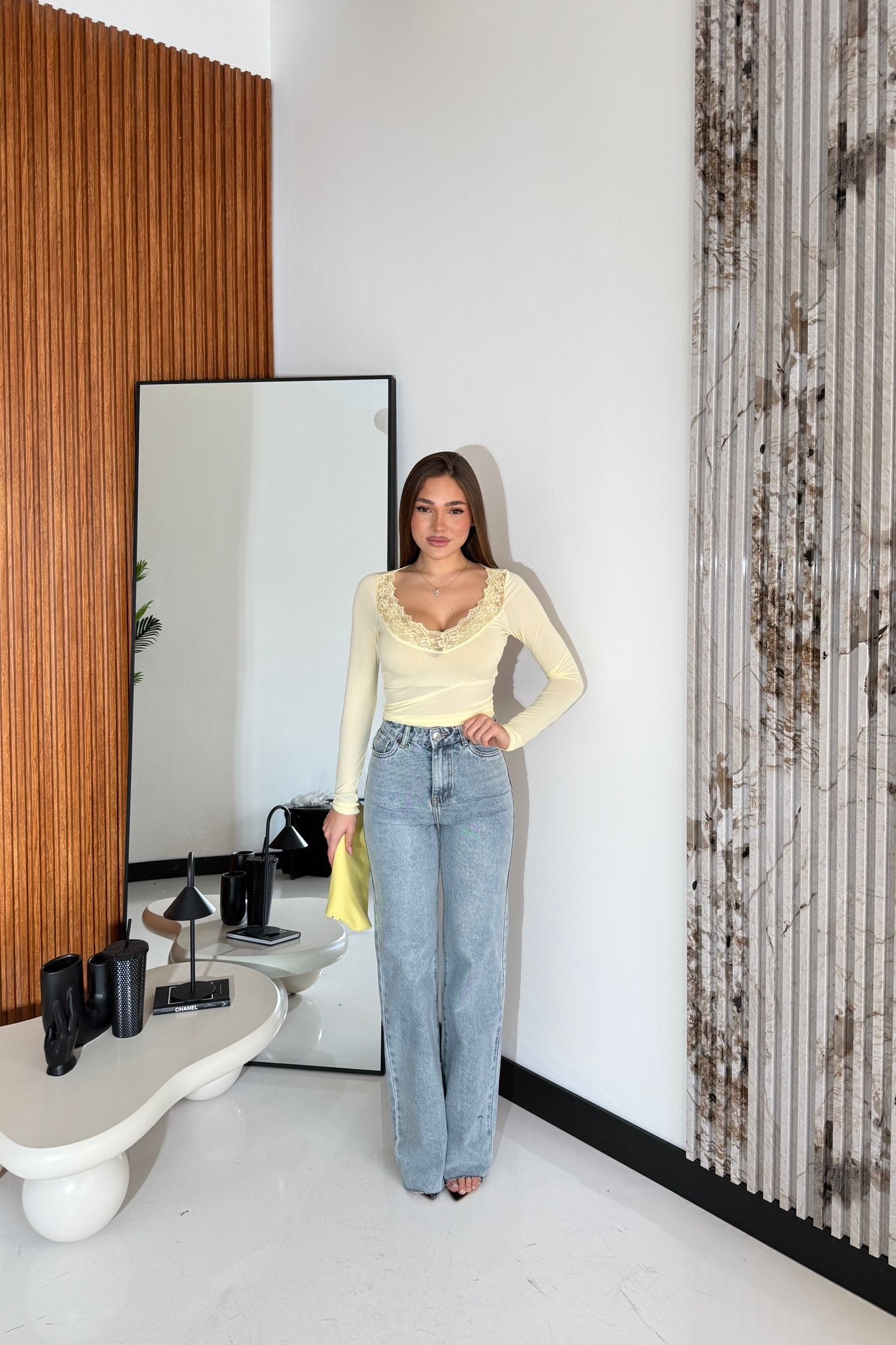 Jeans da donna in denim chiaro, modello wide leg, sfrangiato sul finale. Tela fissa, veste regolarmente la propria taglia, la modella indossa una taglia M per un effetto più morbido ed è alta 1,65cm e pesa 52/53kg.