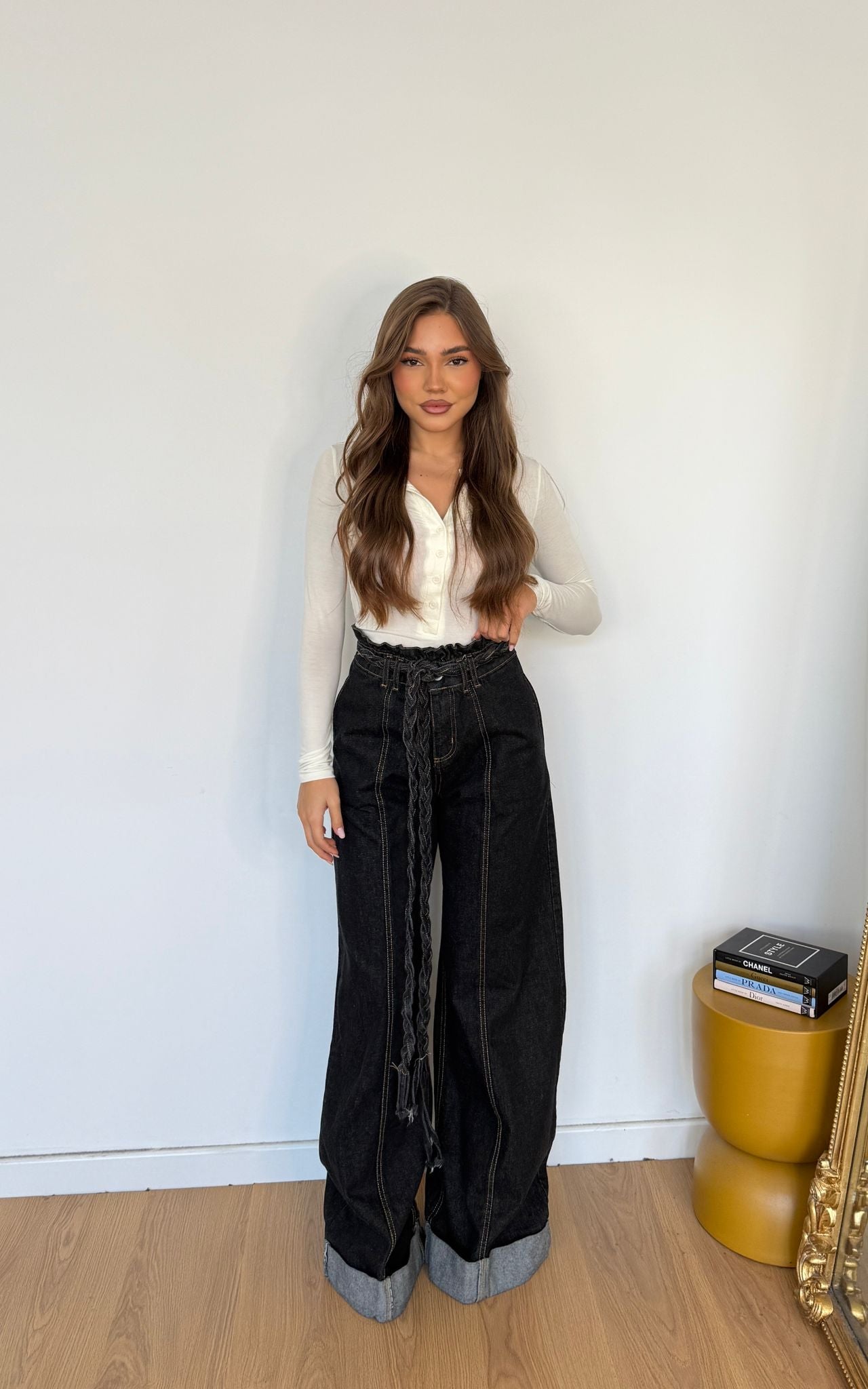 Jeans da donna in denim con piegone fisso sul finale e cinturino compreso, il jeans è in tela fissa non elasticizzato e veste regolarmente la propria taglia e la modella indossa taglia S