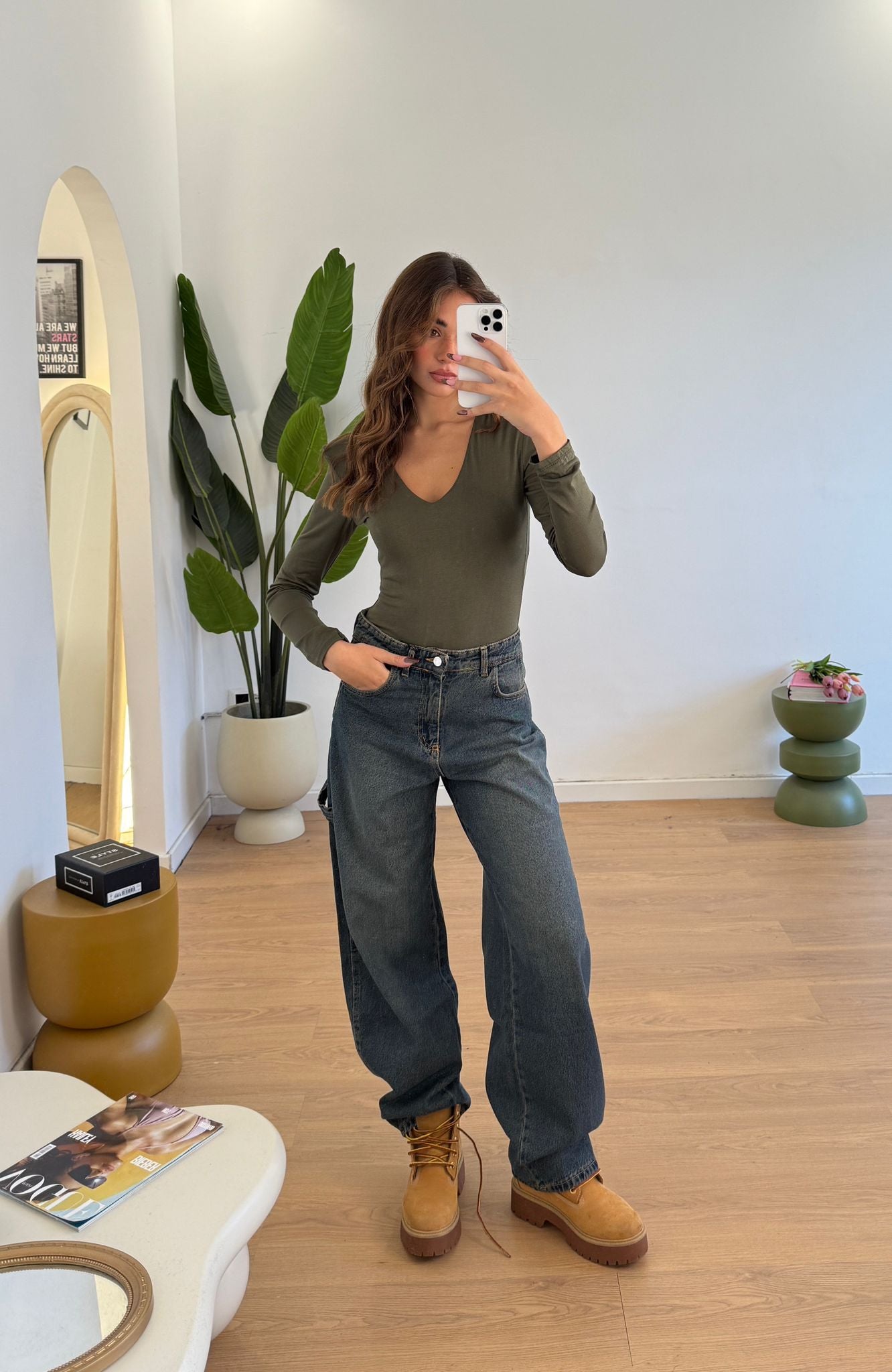 Jeans da donna in denim, tela fissa modello gamba larga. Veste regolarmente la propria taglia, la modella indossa taglia XS.