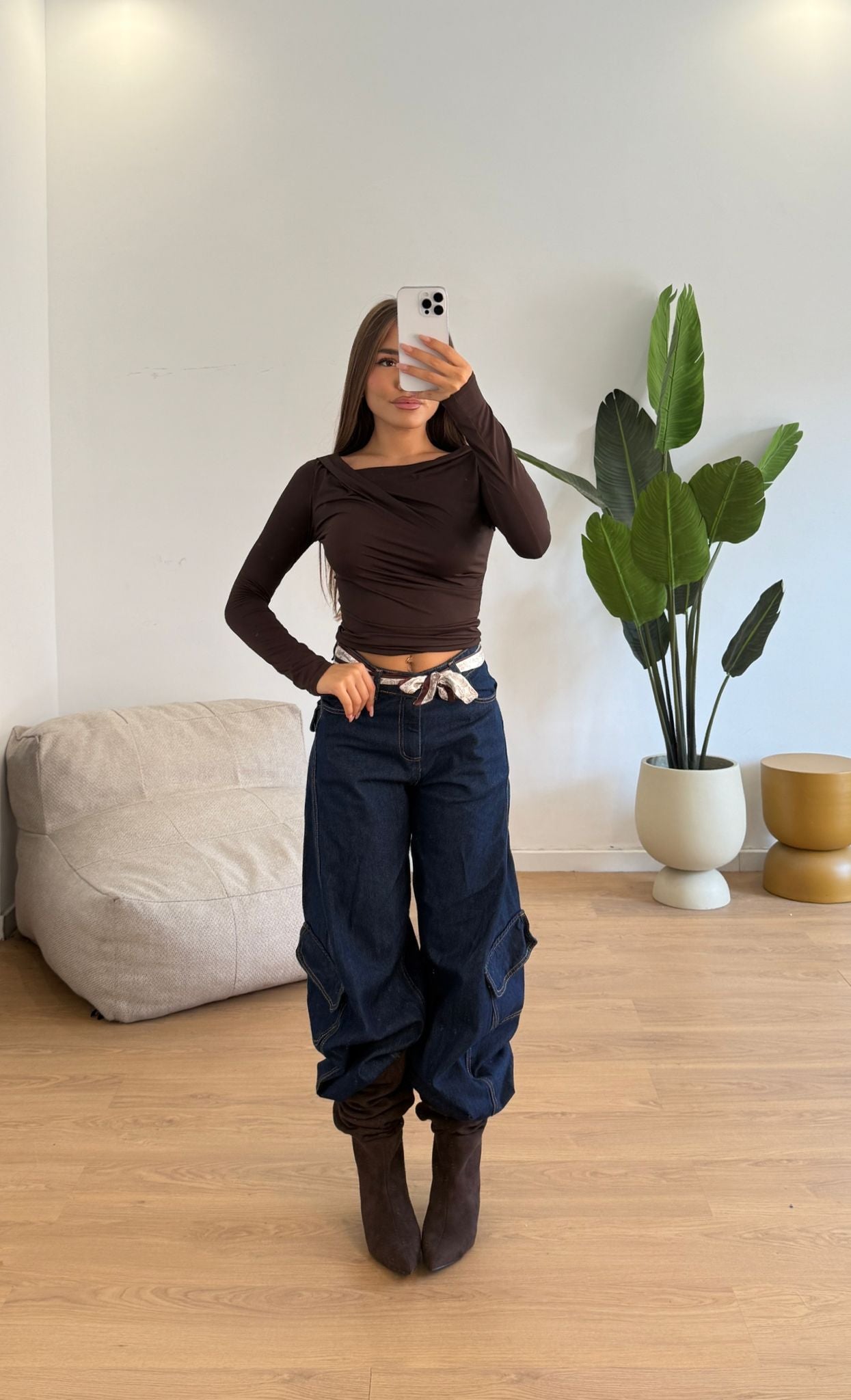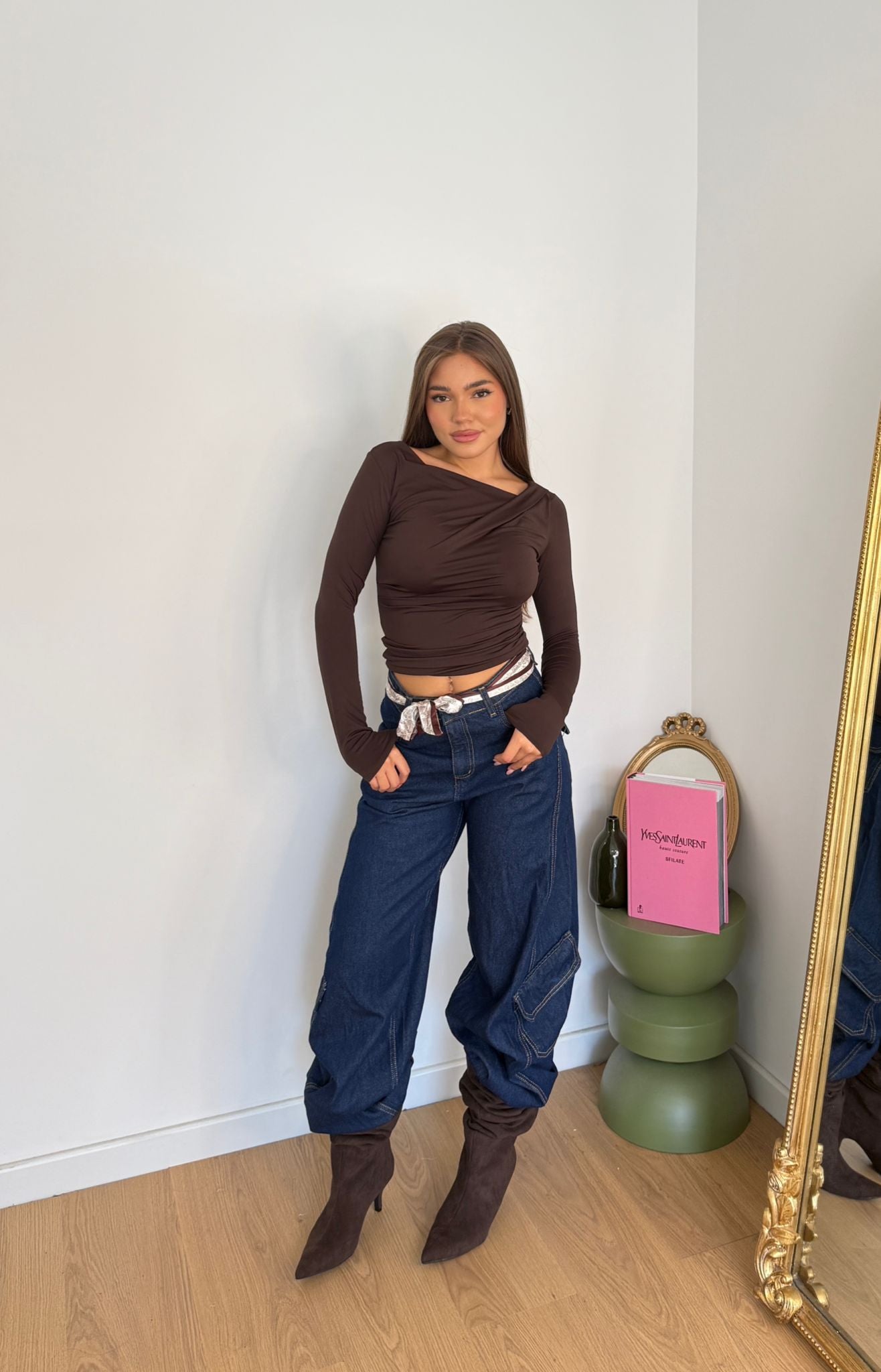Pantalone ballon, effetto morbido, vestirà una taglia regola.