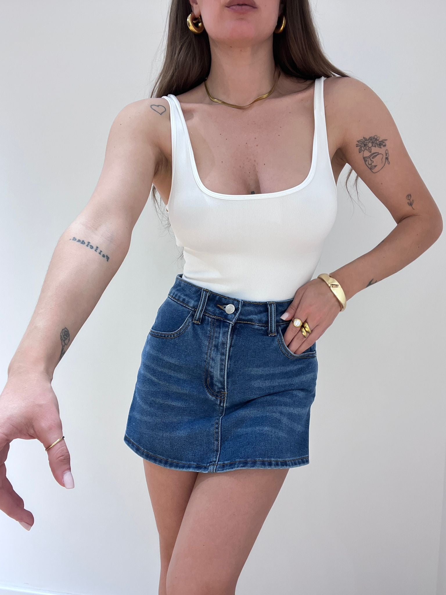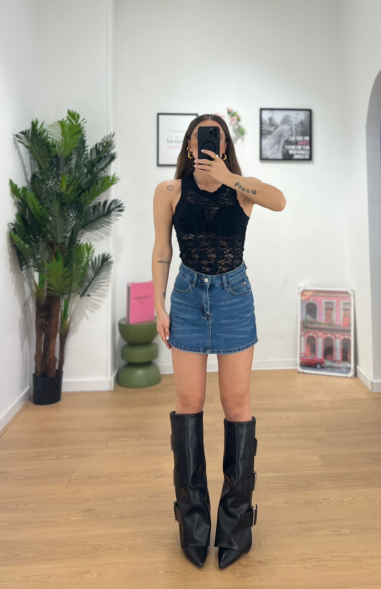 Pantagonna da donna in denim tessuto elasticizzato ma veste regolarmente la propria taglia e Giusy indossa taglia XS