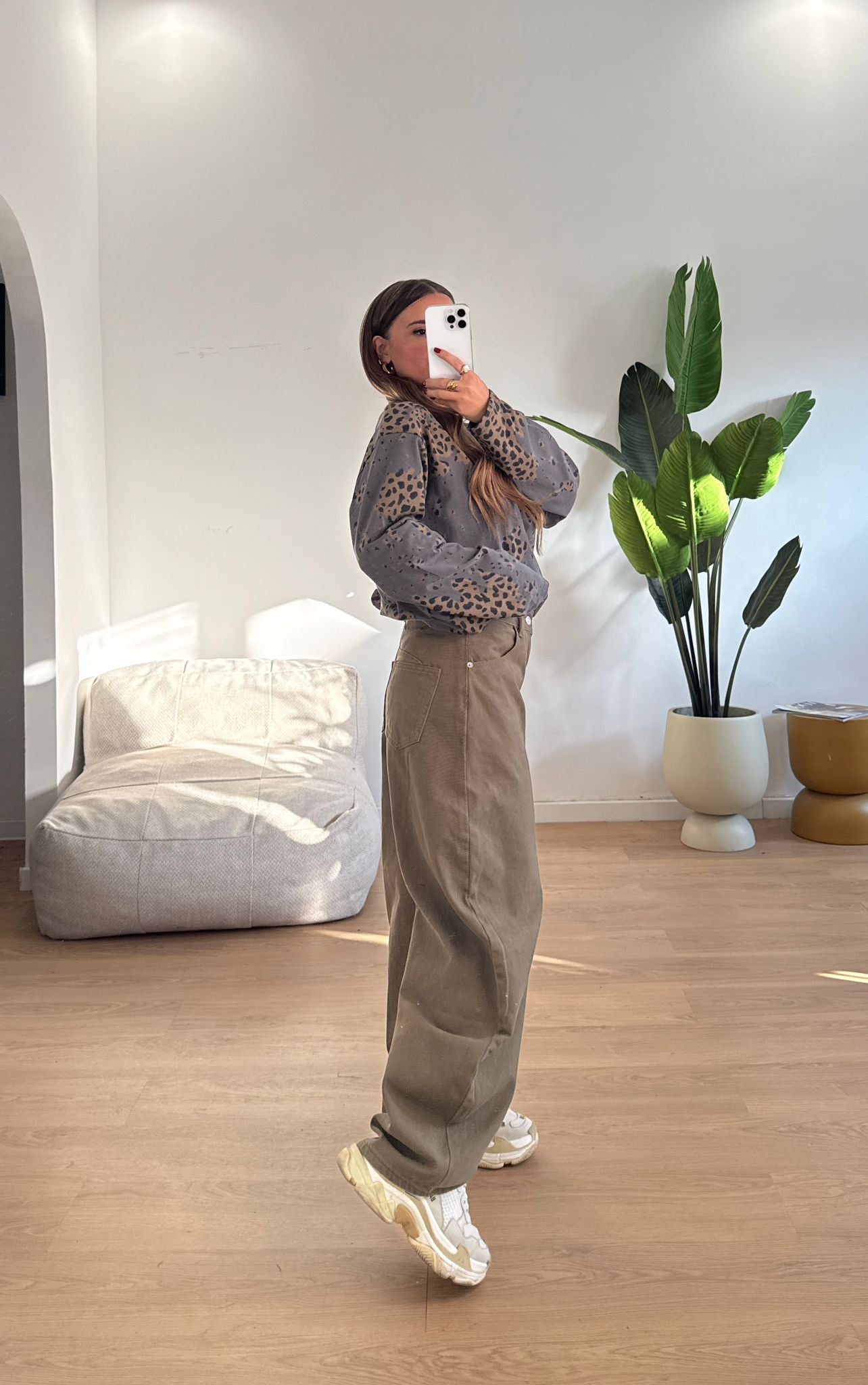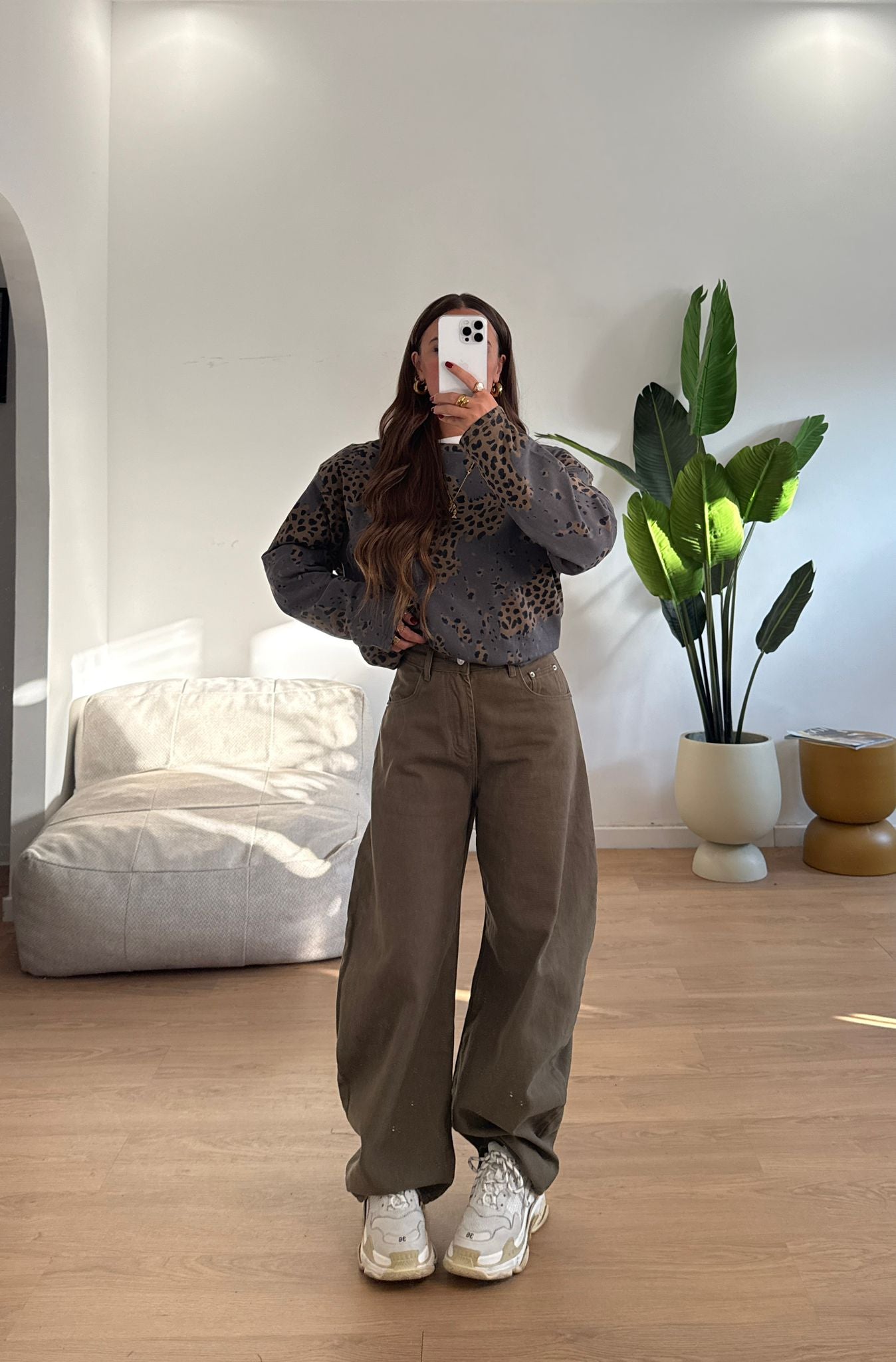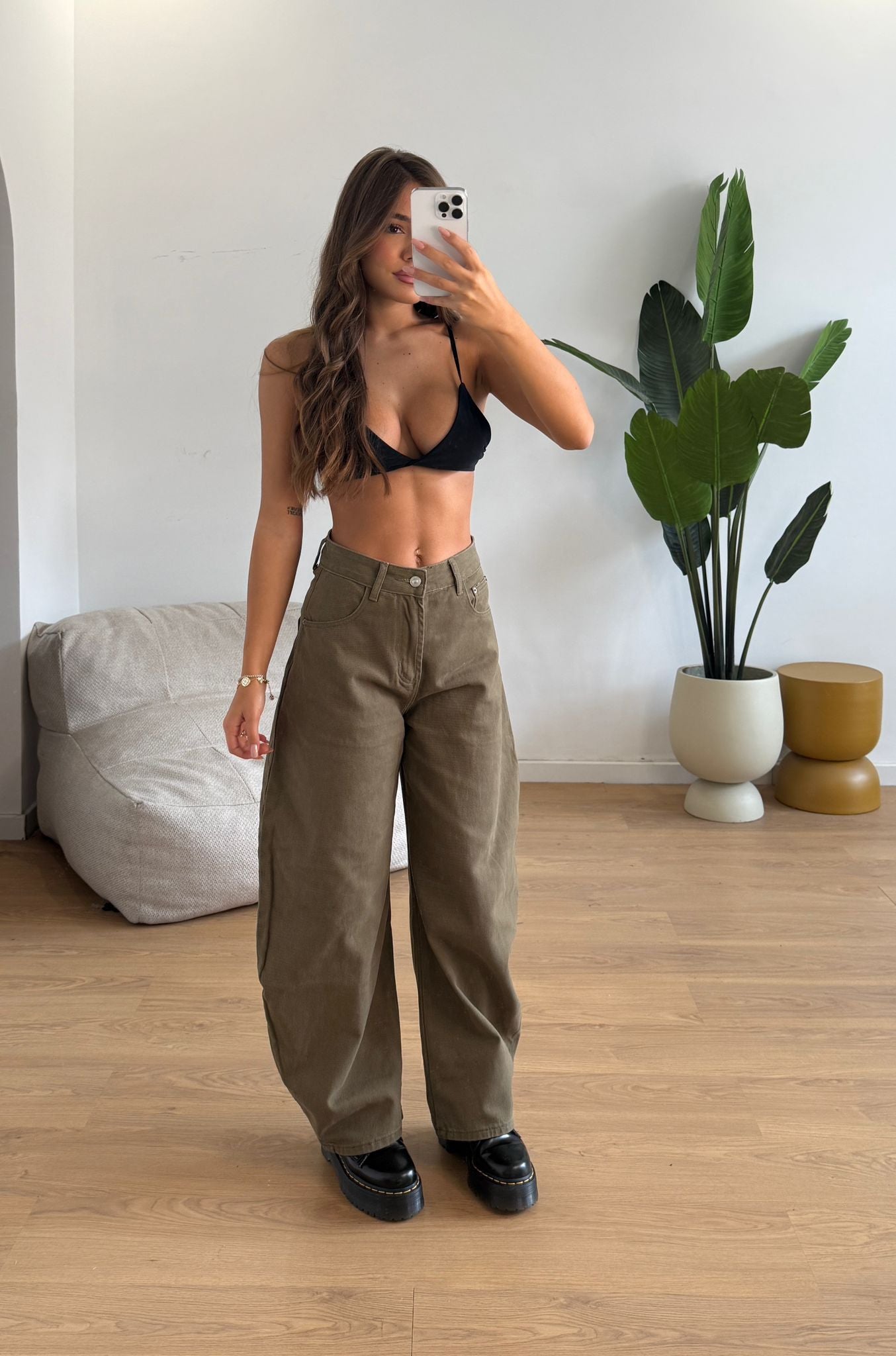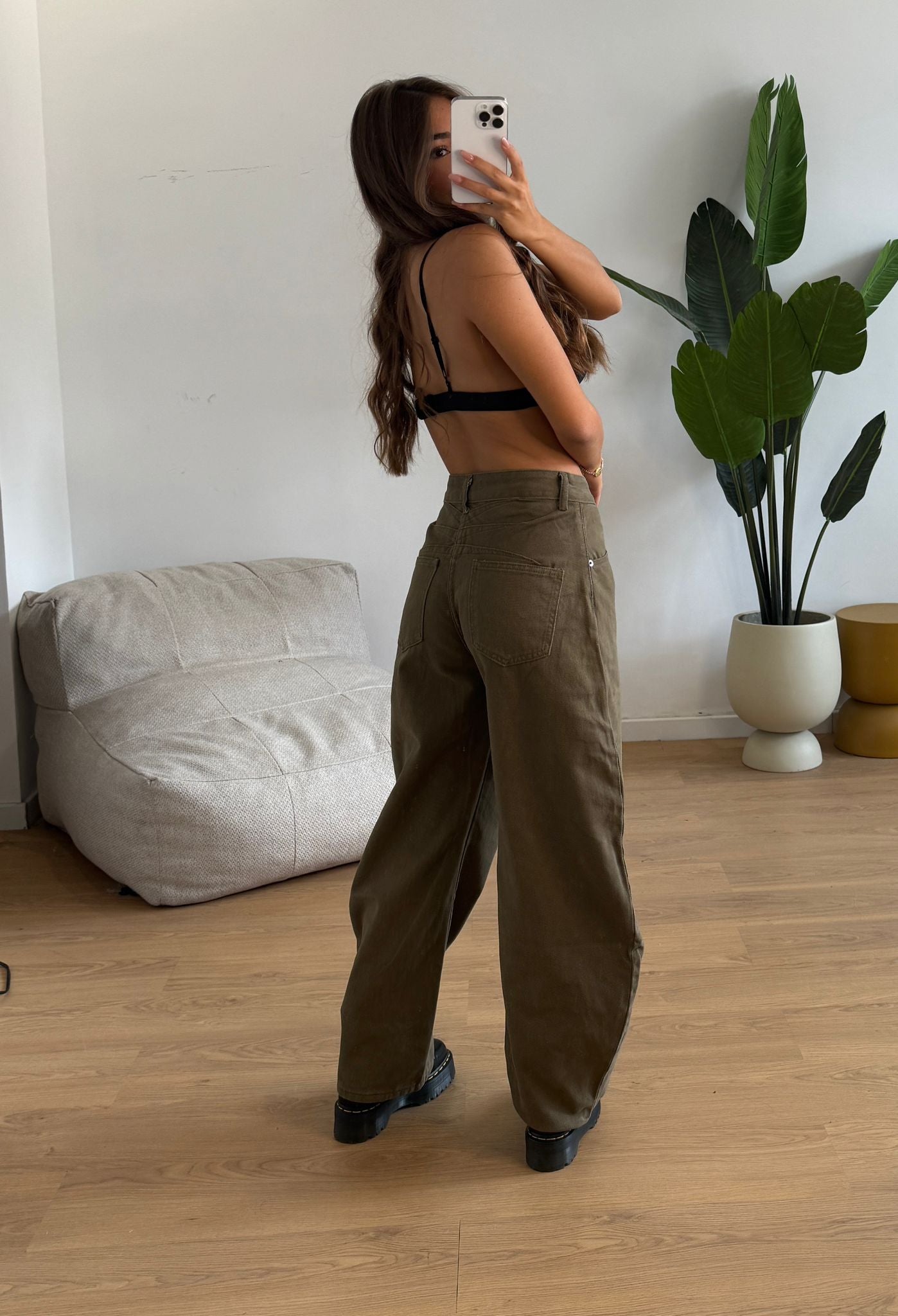Pantalone da donna in tela fissa, non elasticizzato. Modello balloon fit, veste regolarmente la propria taglia, in foto indossa taglia S.