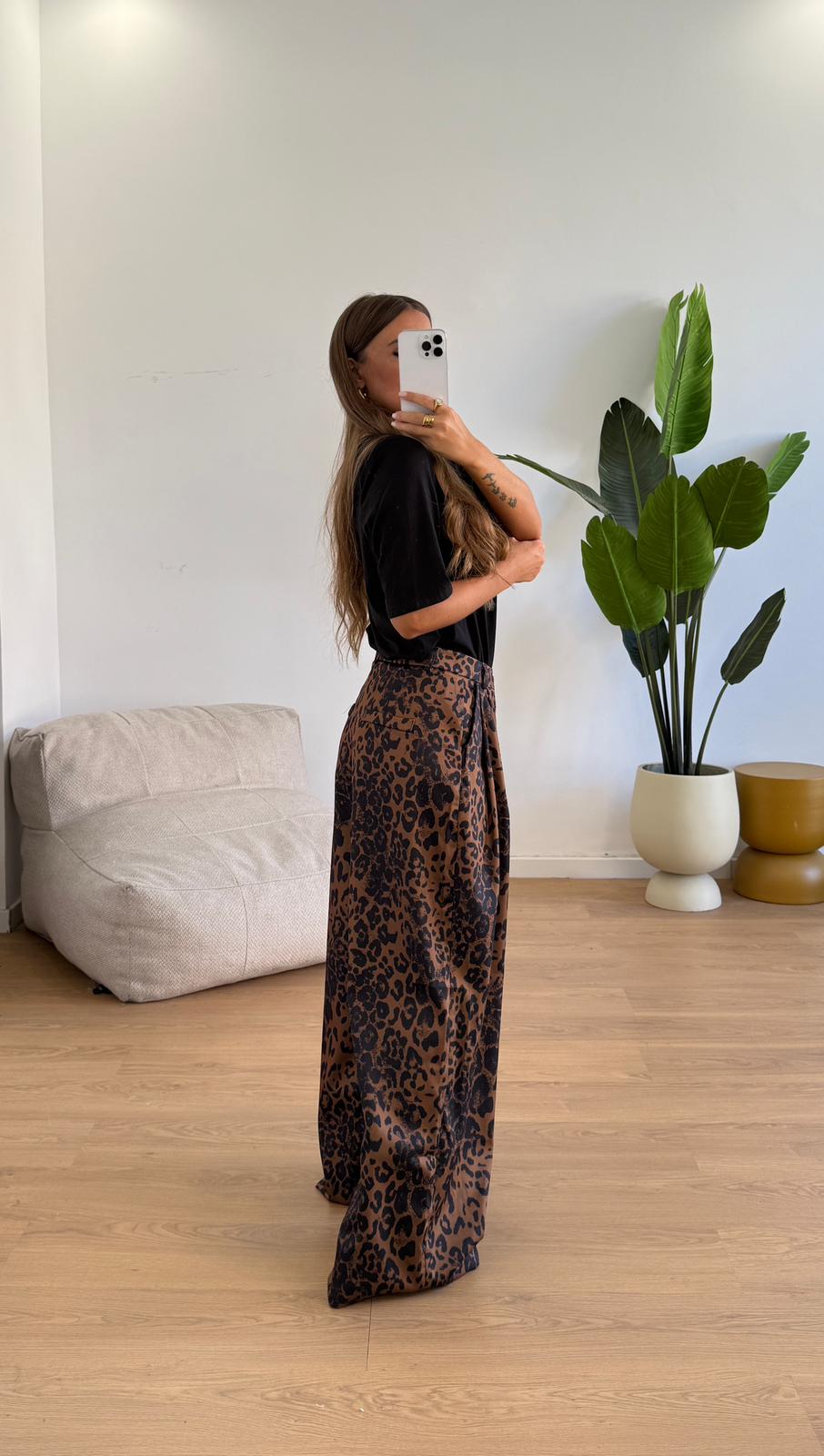 Pantalone da donna effetto seta fantasia animalier e veste regolarmente la propria taglia e la modella indossa taglia S