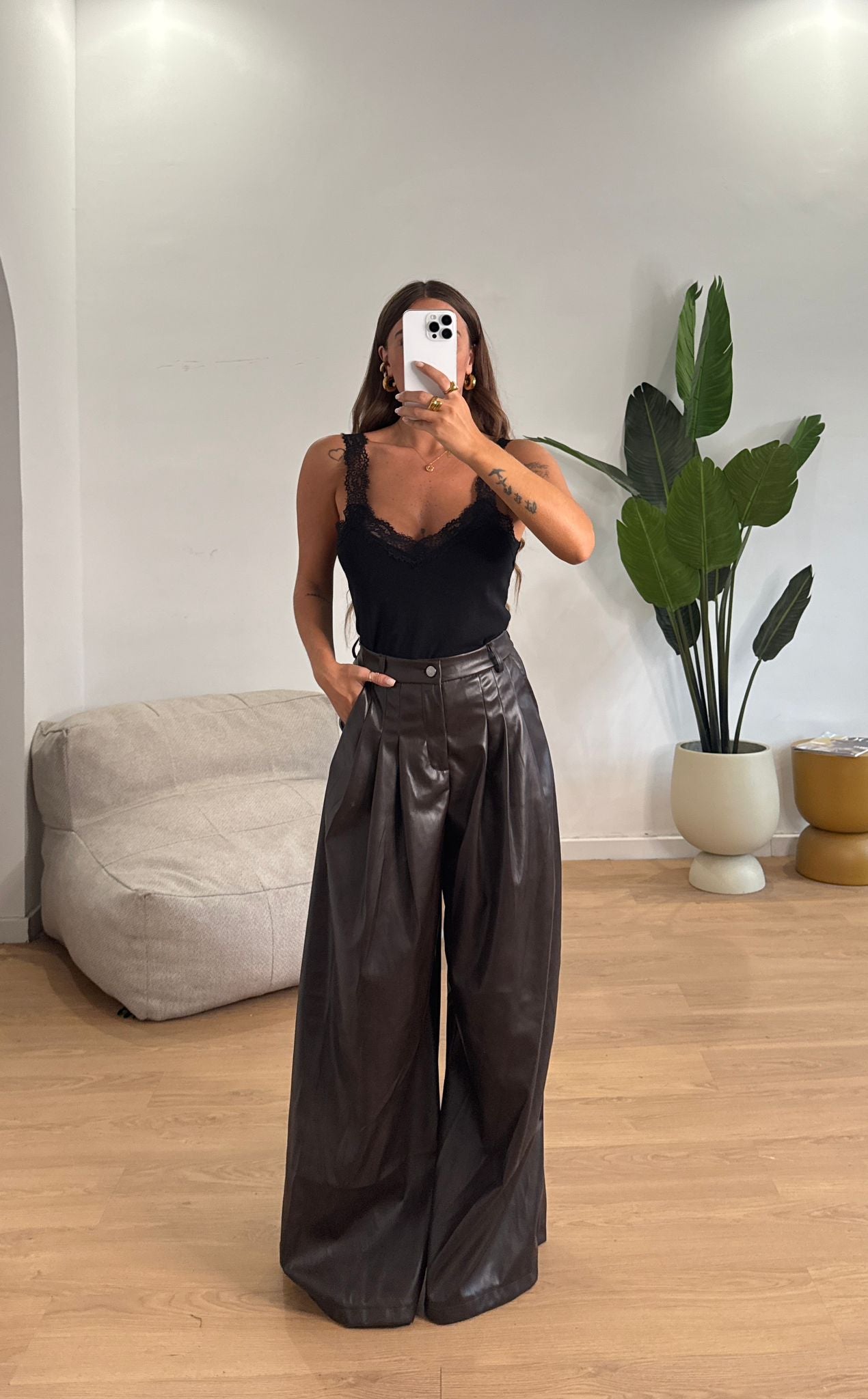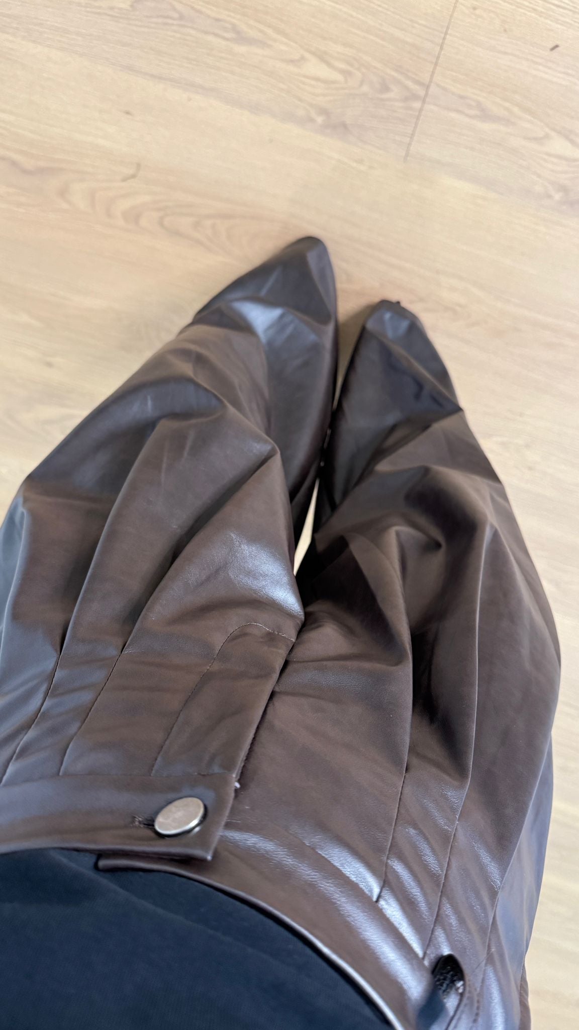Pantalone da donna in ecopelle, top quality e veste regolarmente la propria taglia e la modella indossa taglia S