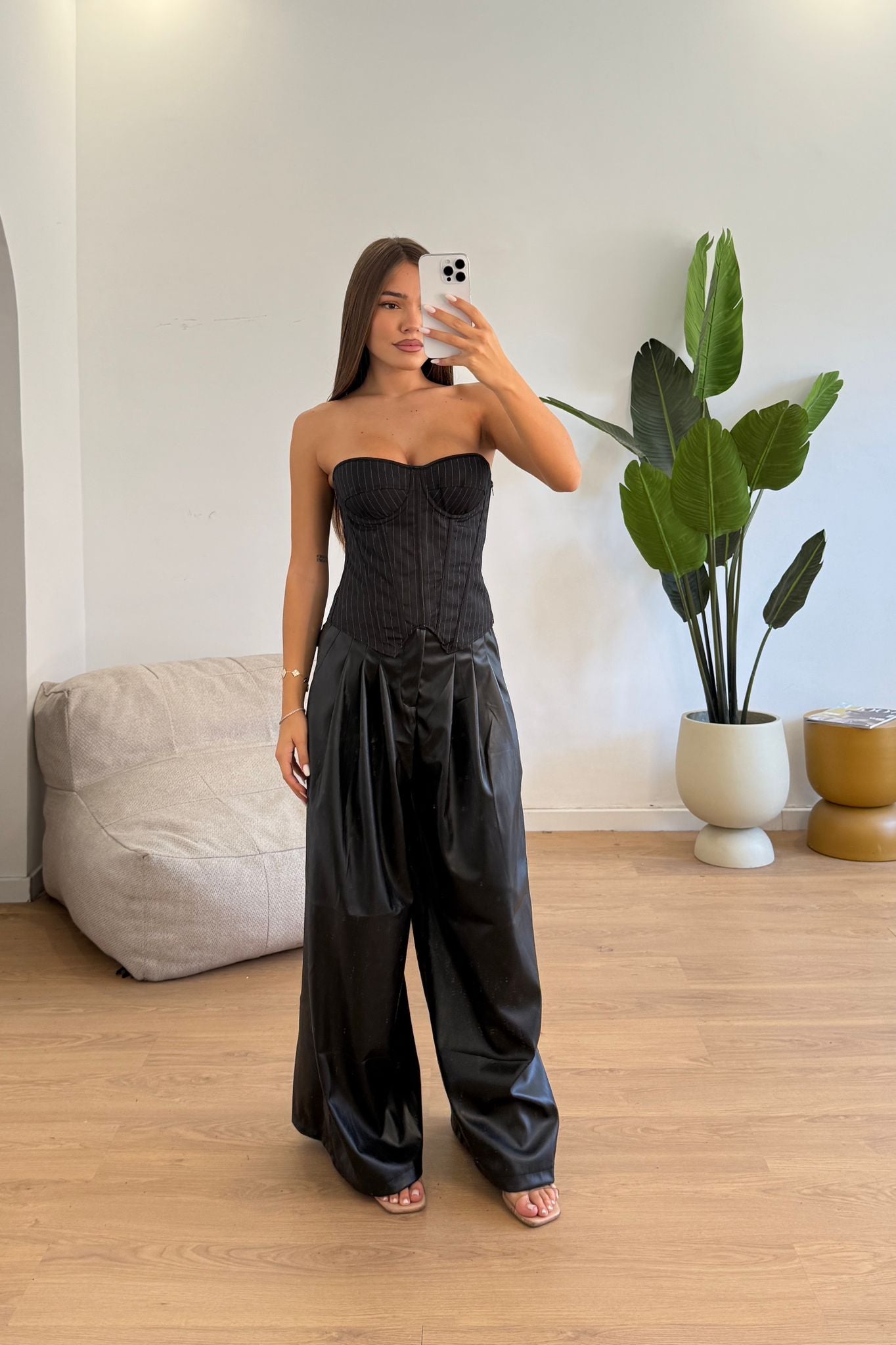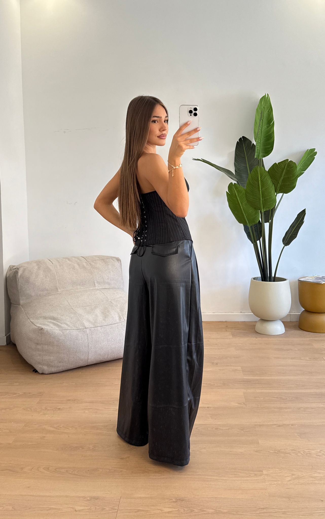 Pantalone da donna in ecopelle, top quality e veste regolarmente la propria taglia e la modella indossa taglia S