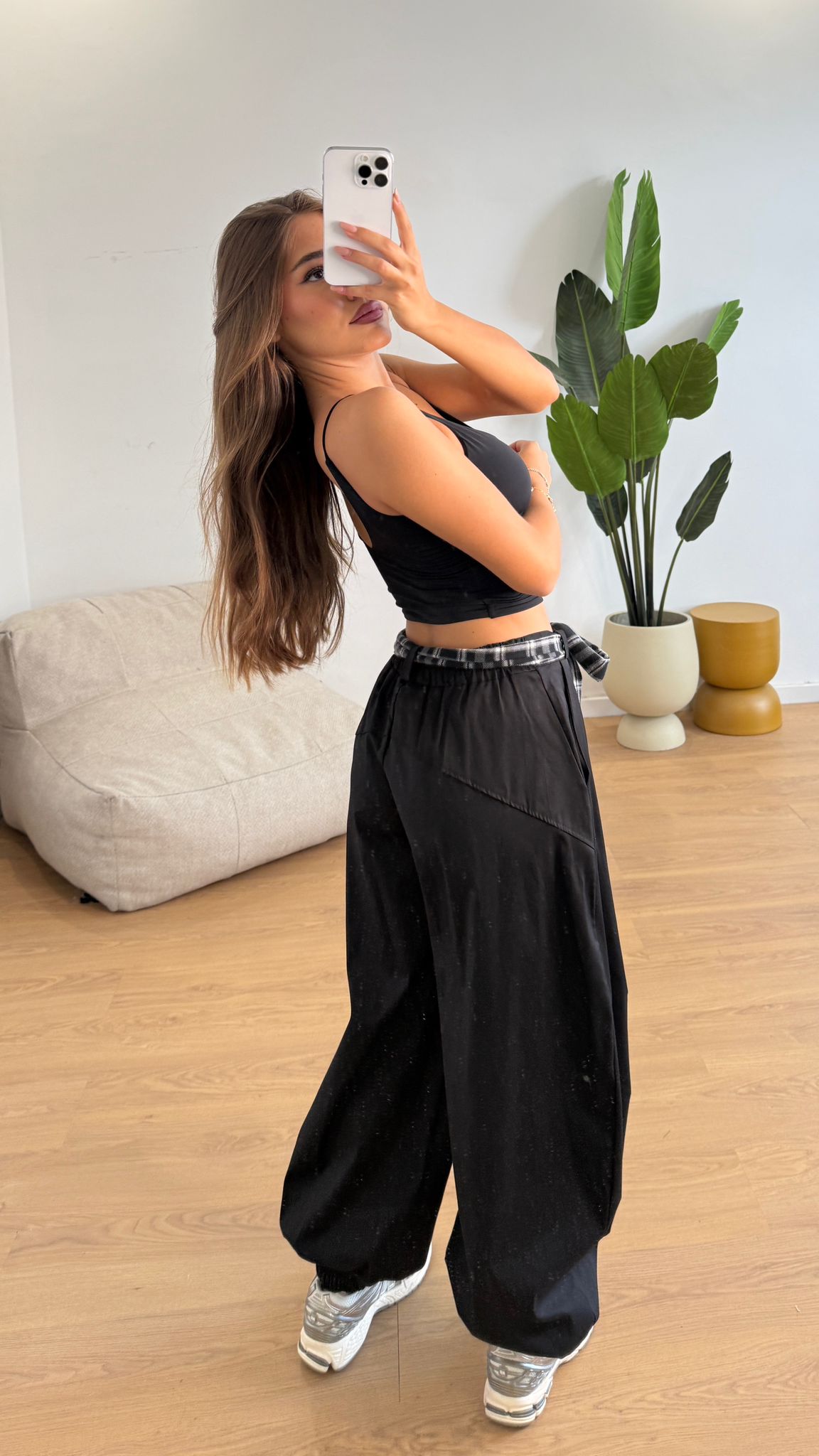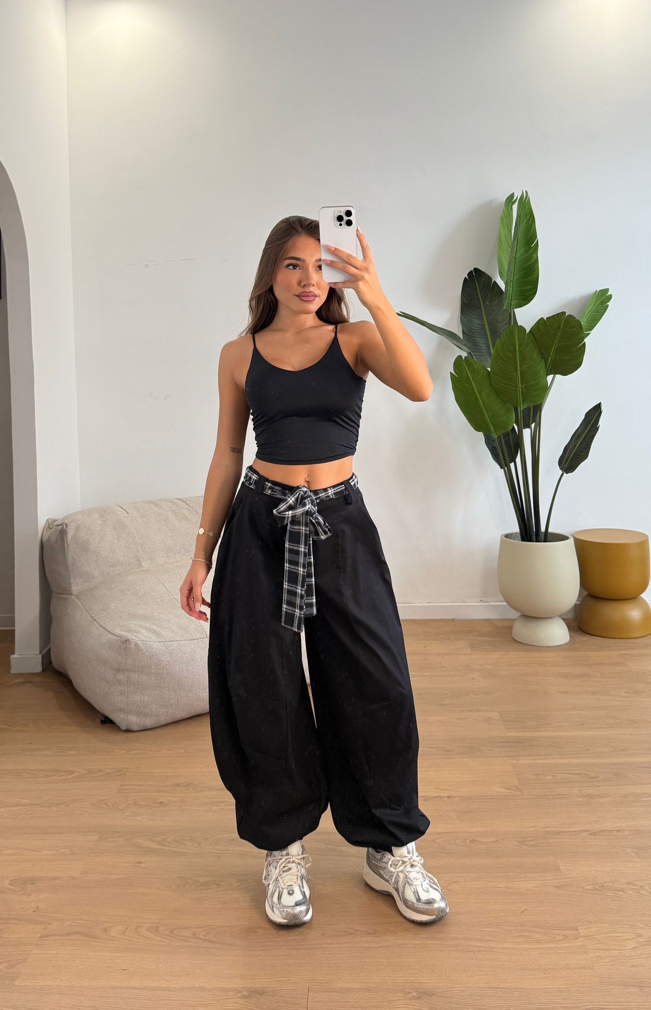Pantalone da donna modello balloon fit con elastico sul retro in vita e alla caviglia. Taglia unica, veste bene fino ad una taglia 44.