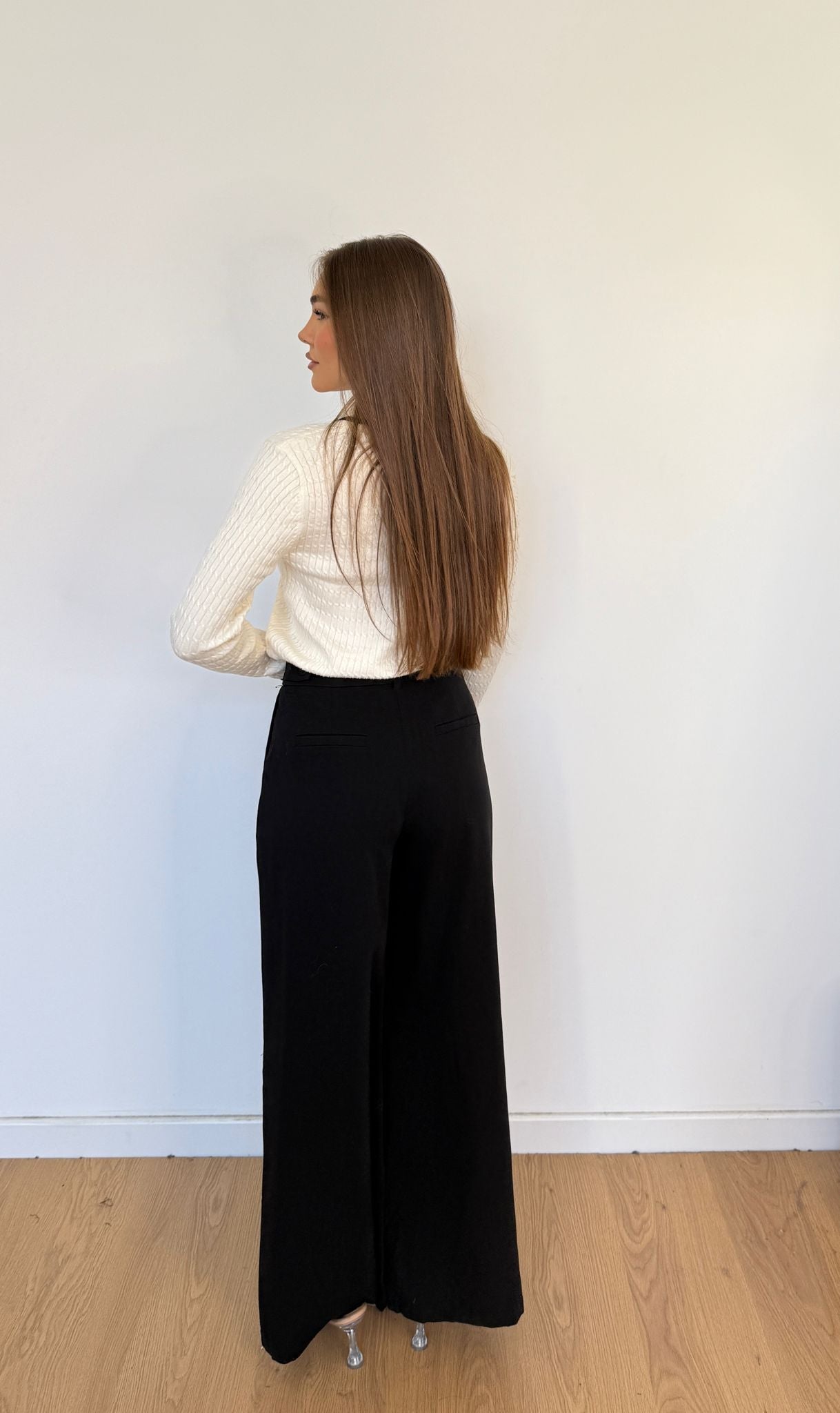 Pantalone da donna gamba larga in cotone e veste regolarmente la propria taglia e la modella indossa taglia S