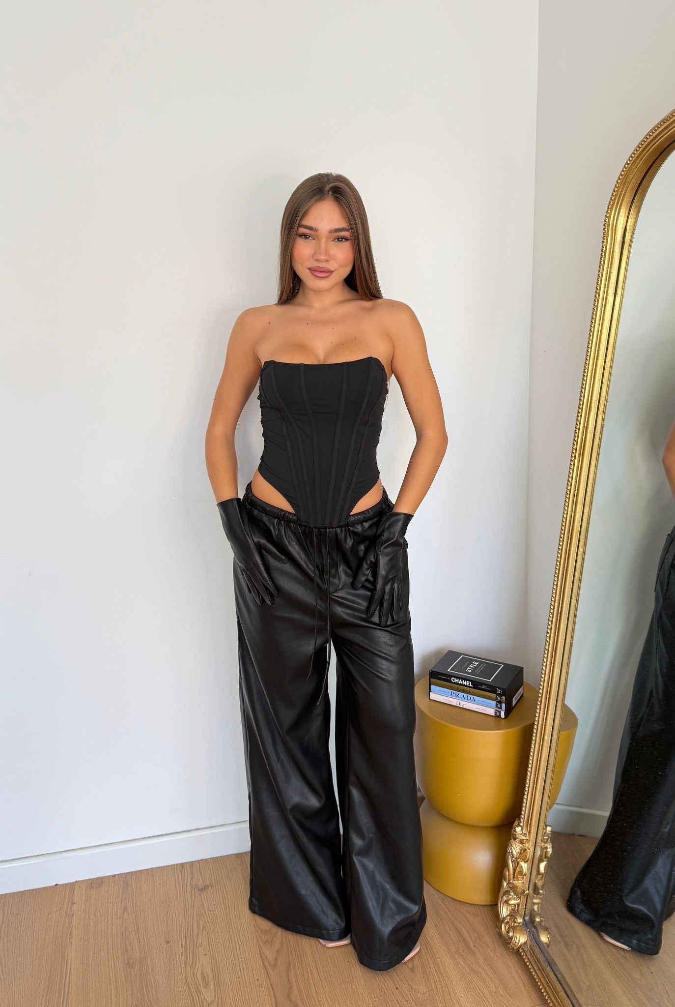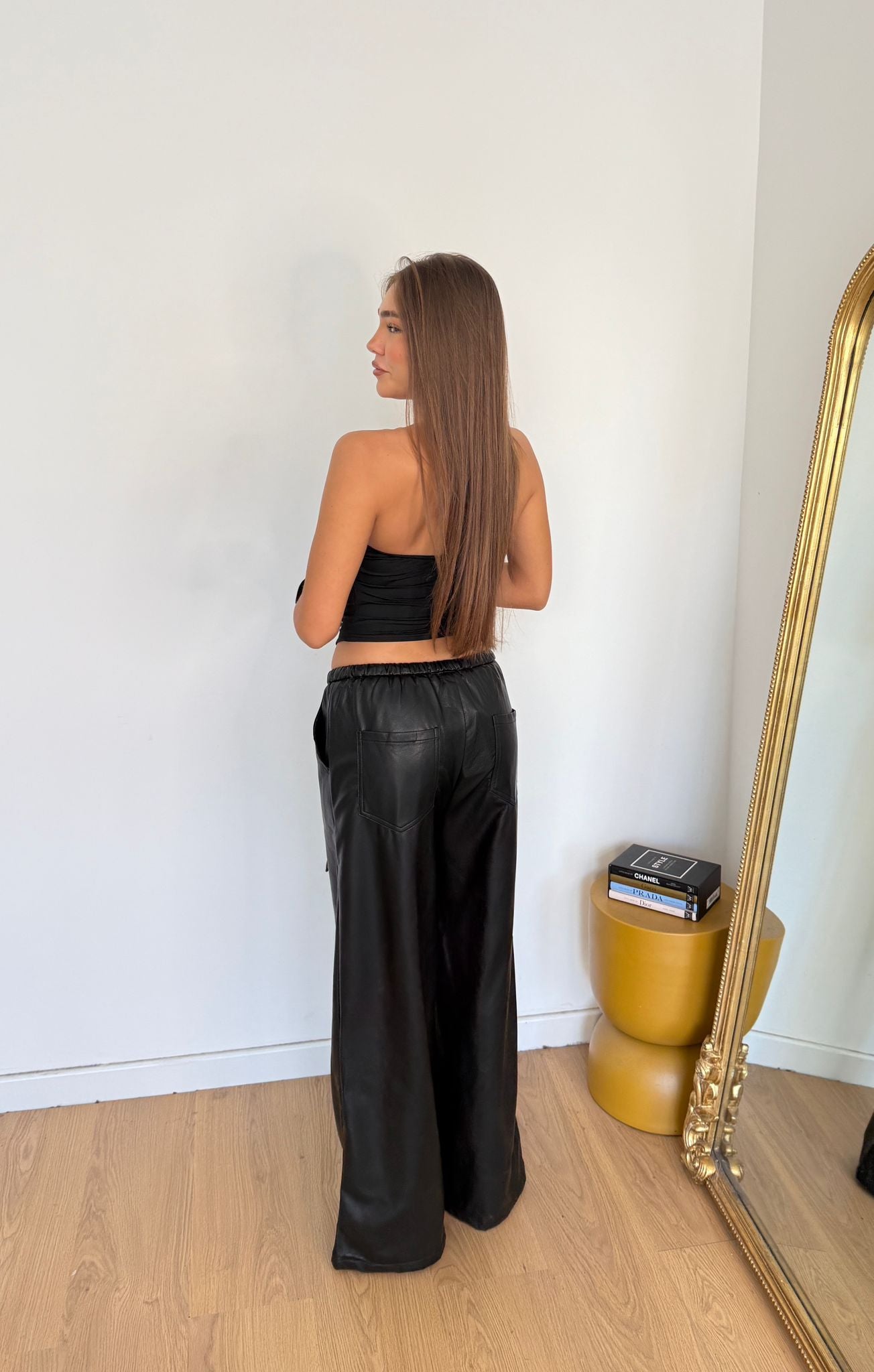 Pantalone da donna in ecopelle con elastico e laccio regolabile in vita e veste regolarmente la propria taglia e la modella indossa taglia S
