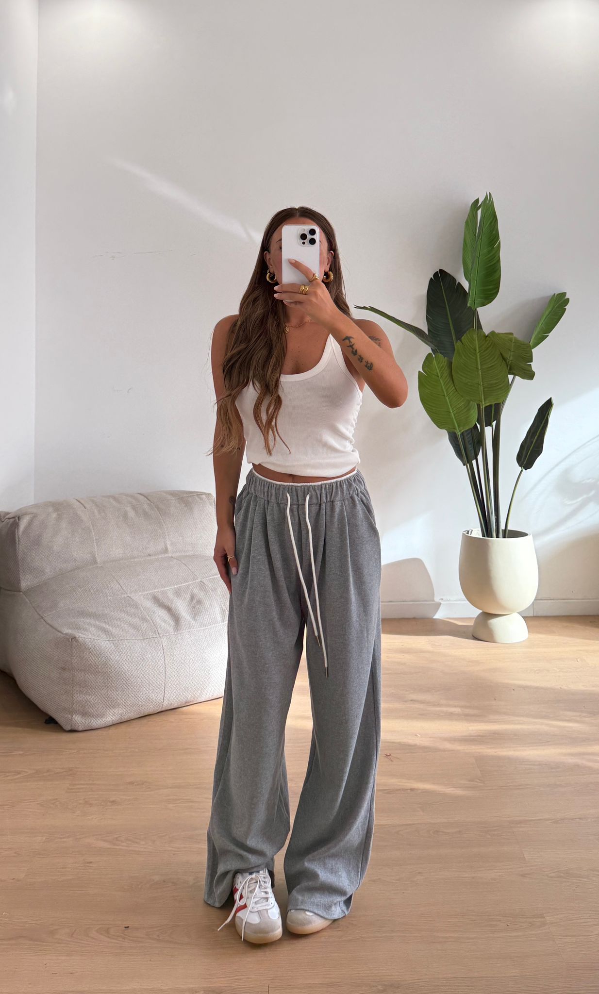 Pantatuta da donna gamba larga con elastico in vita interno e laccio regolabile e veste regolarmente la propria taglia e la modella indossa taglia S