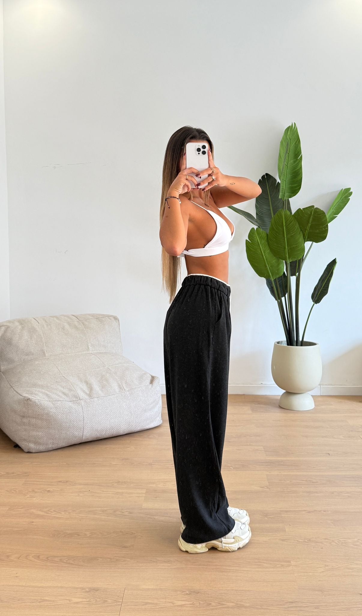 Pantatuta da donna gamba larga con elastico in vita interno e laccio regolabile e veste regolarmente la propria taglia e la modella indossa taglia S