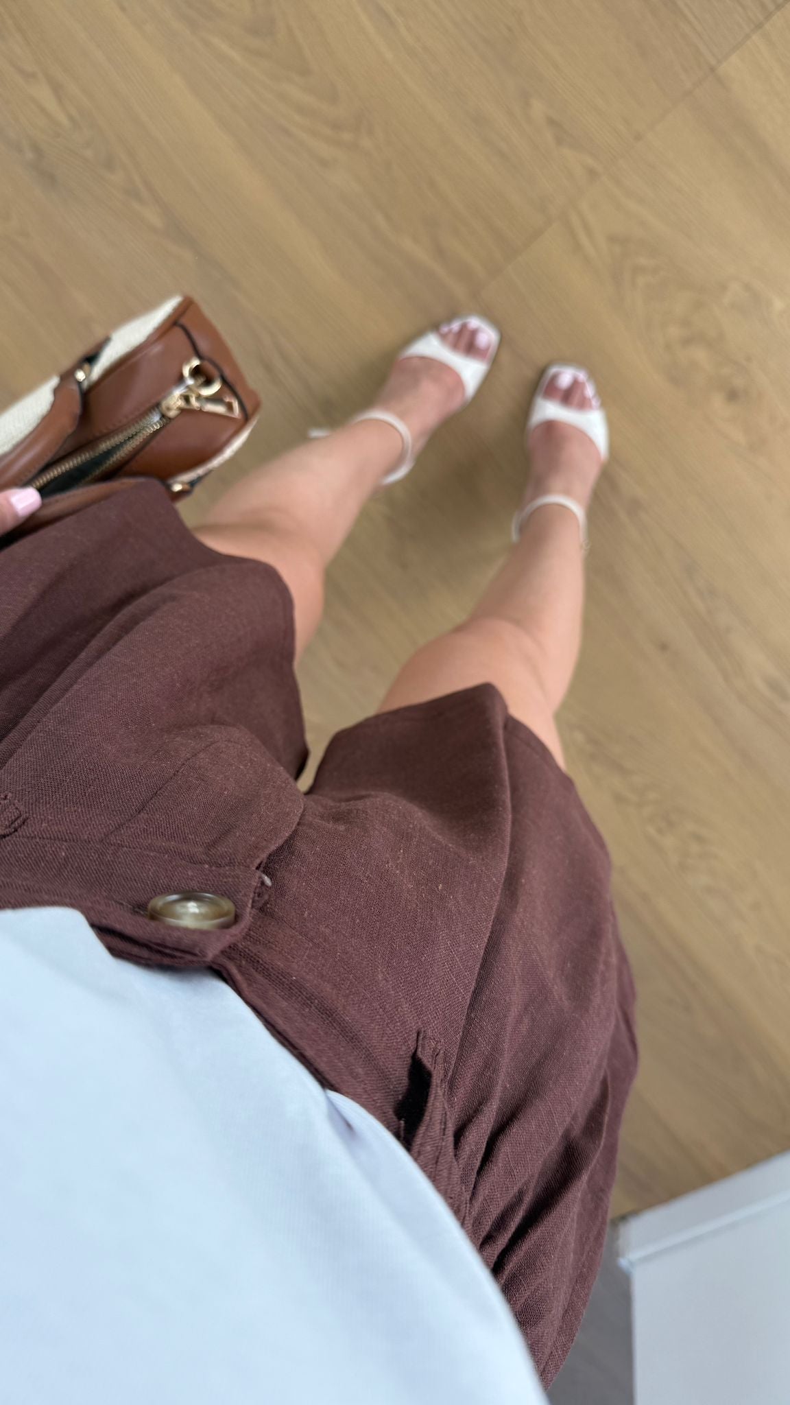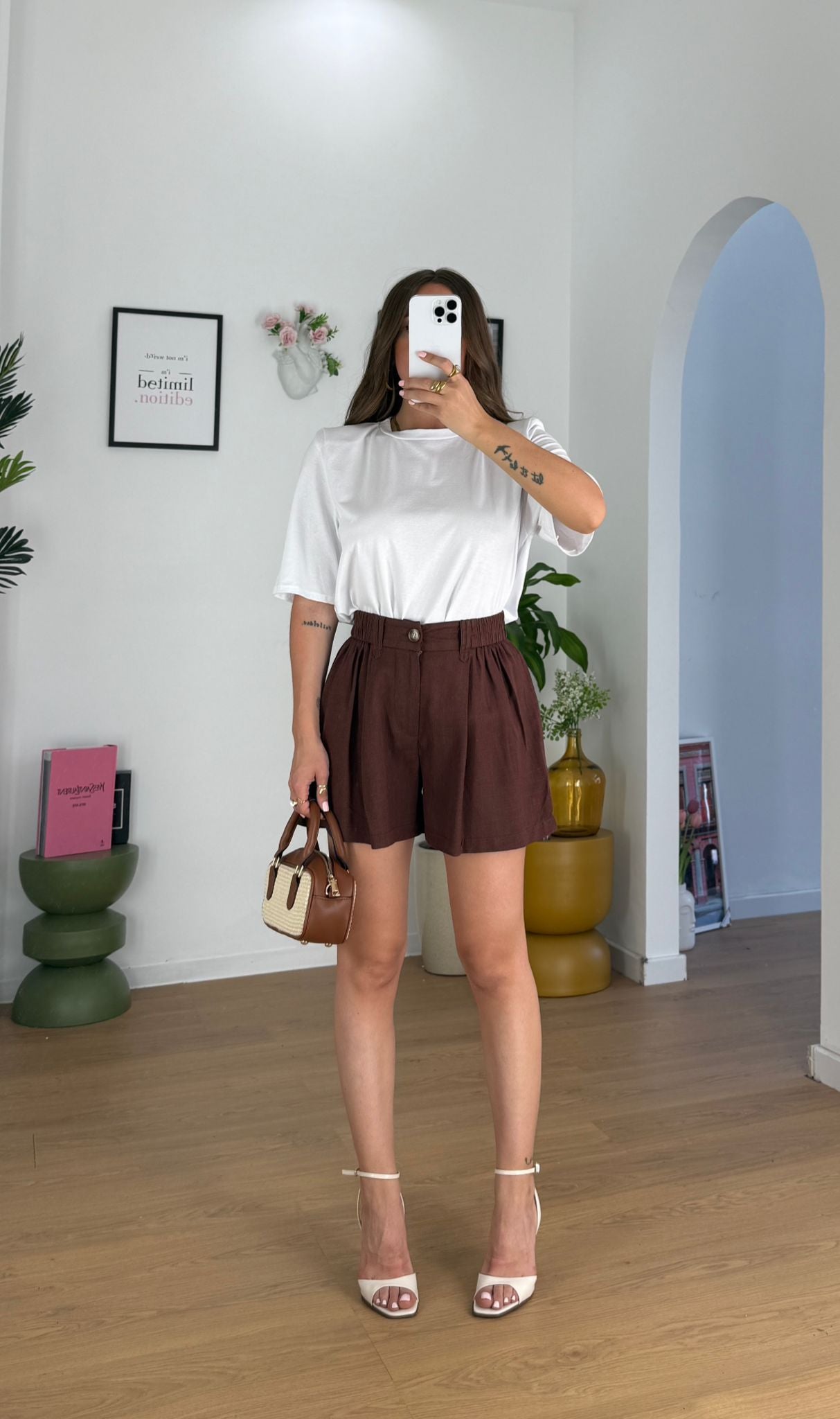 Shorts da donna in misto Lino con elastico in vita sul retro, veste regolarmente la propria taglia e Giusy indossa taglia S
