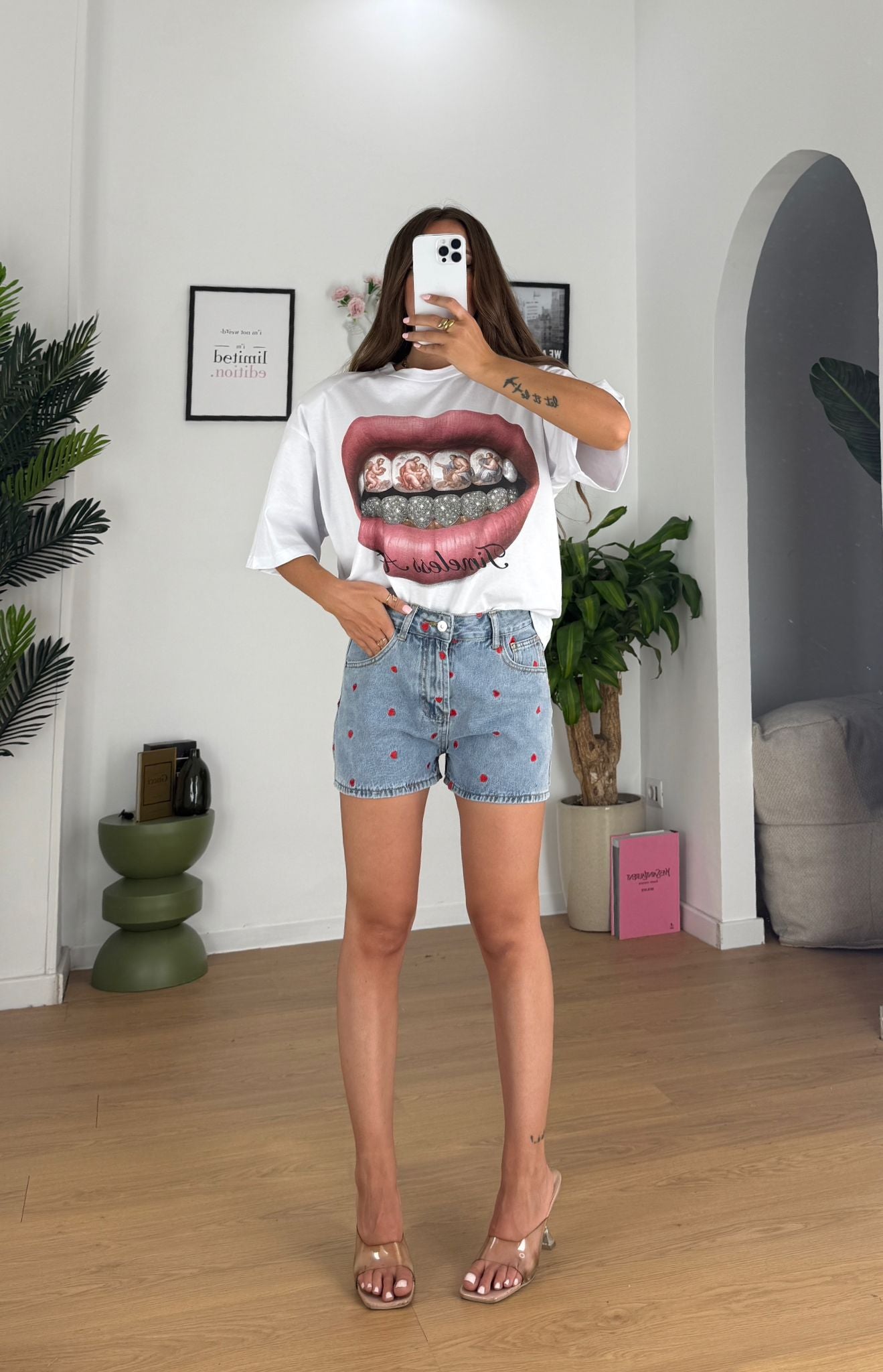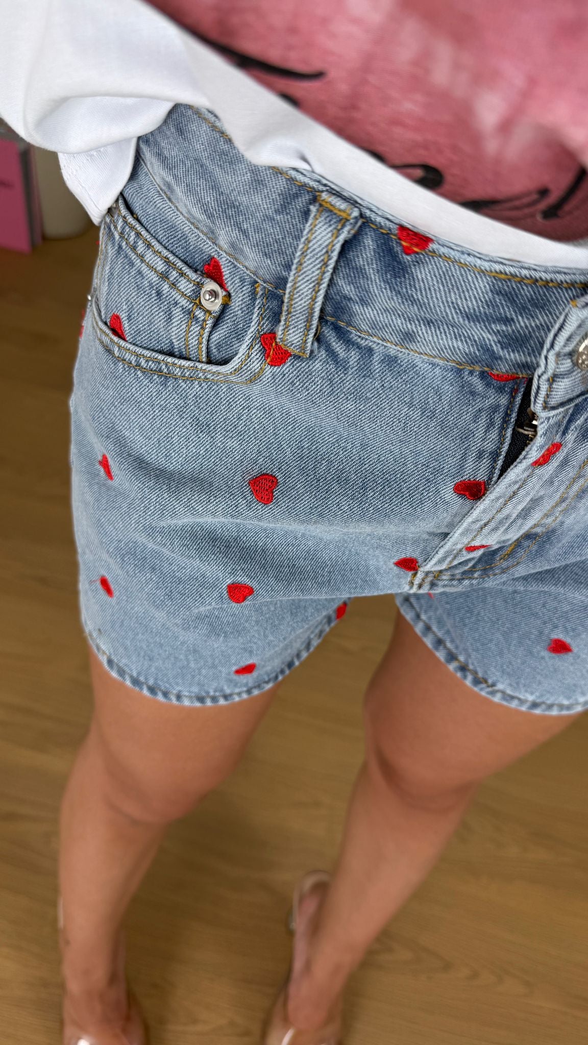 Shorts da donna in denim chiaro con applicazioni cuoricini cuciti, veste regolarmente la propria taglia e Giusy indossa taglia S