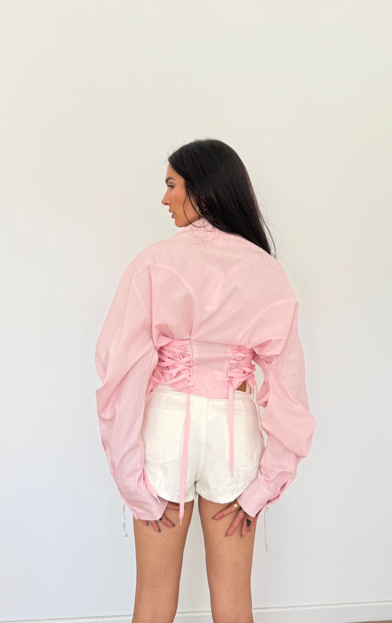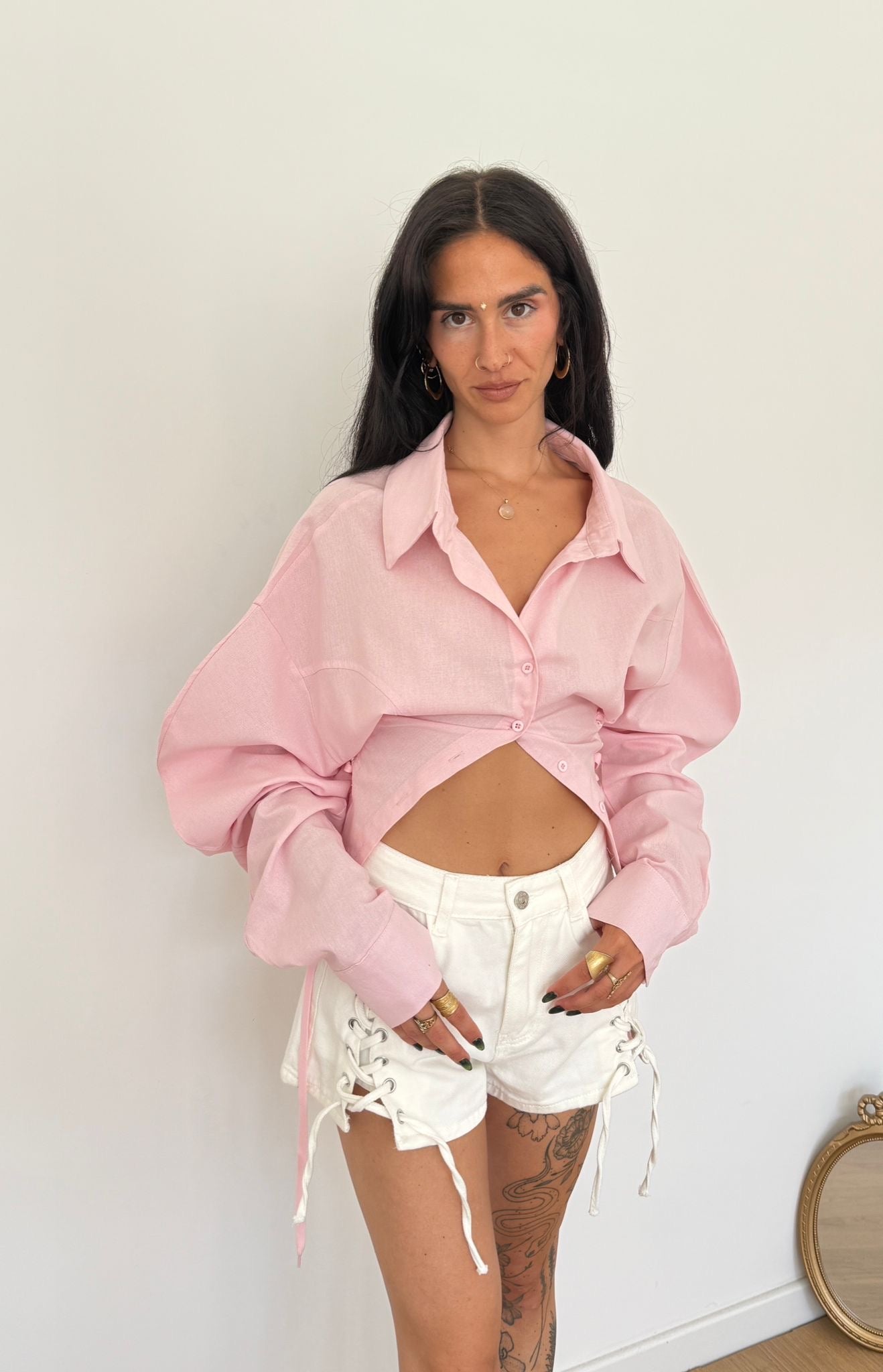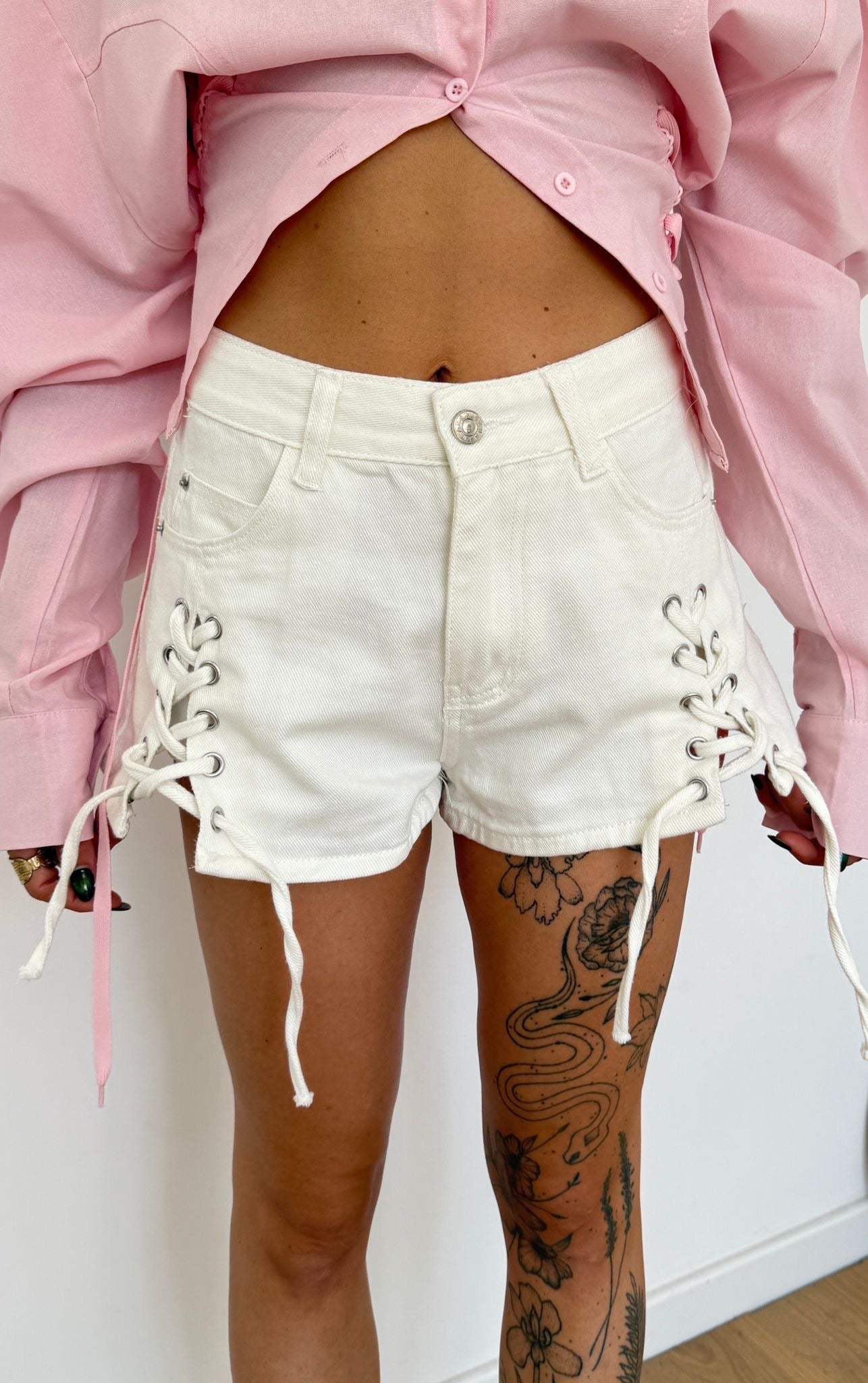 Shorts da donna in tela fissa, non elasticizzato, con intreccio sul davanti. La modella indossa taglia S e veste regolarmente la propria taglia.