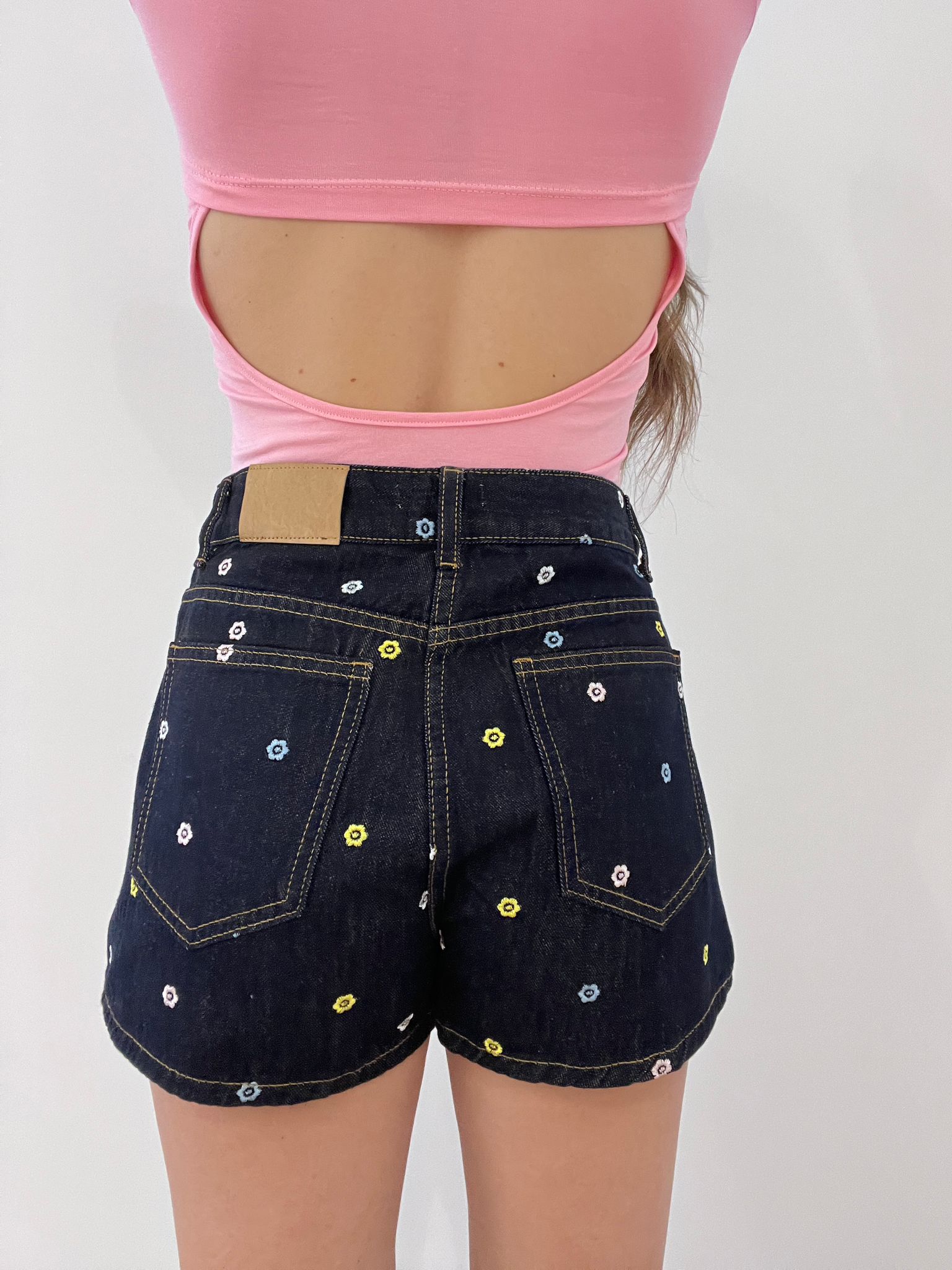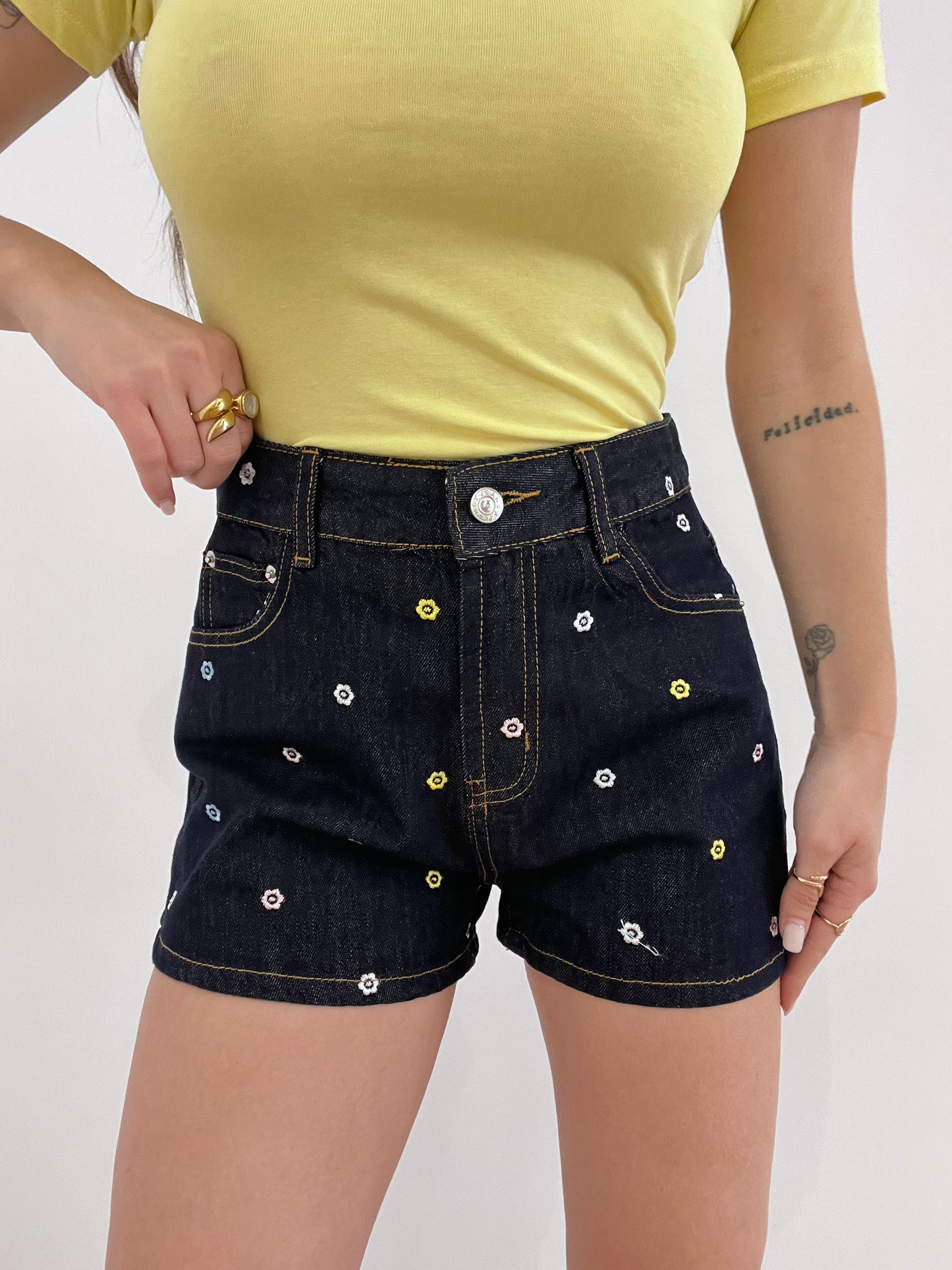 Shorts da donna in denim scuro con fantasia fiori cuciti tessuto in tela rigida e veste regolarmente la propria taglia e Giusy indossa taglia S