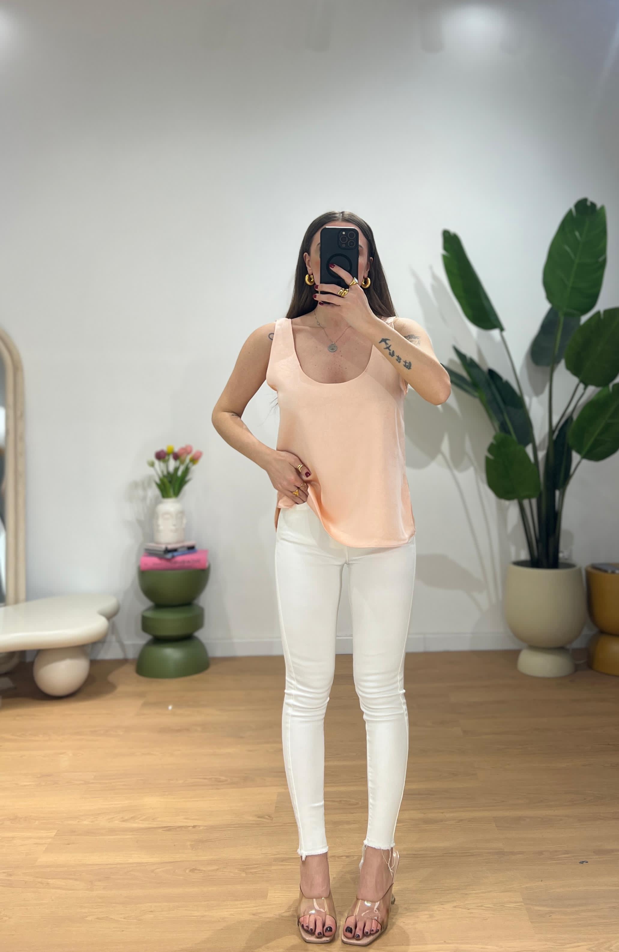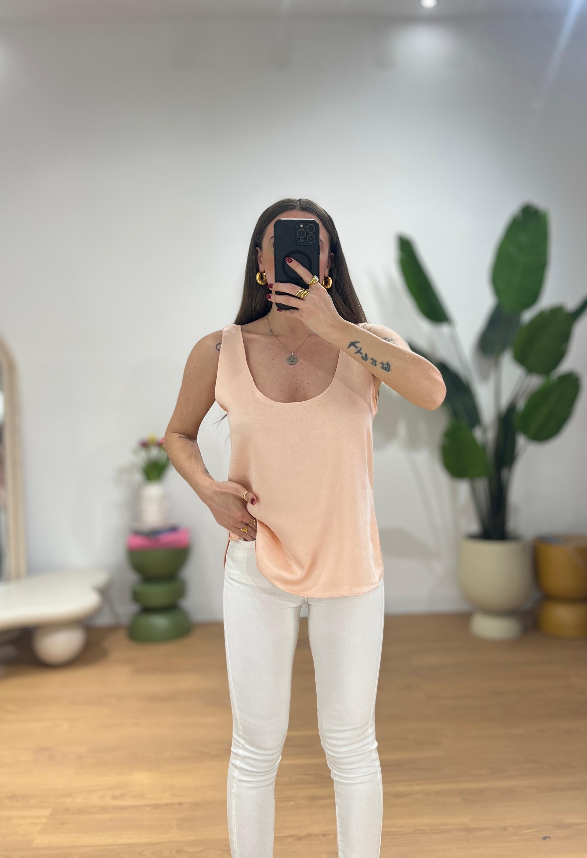 Canotta dal taglio dritto e morbido, leggermente svasata sul fondo, con spallina doppia e scollo rotondo non troppo profondo. Giusy indossa la taglia S.