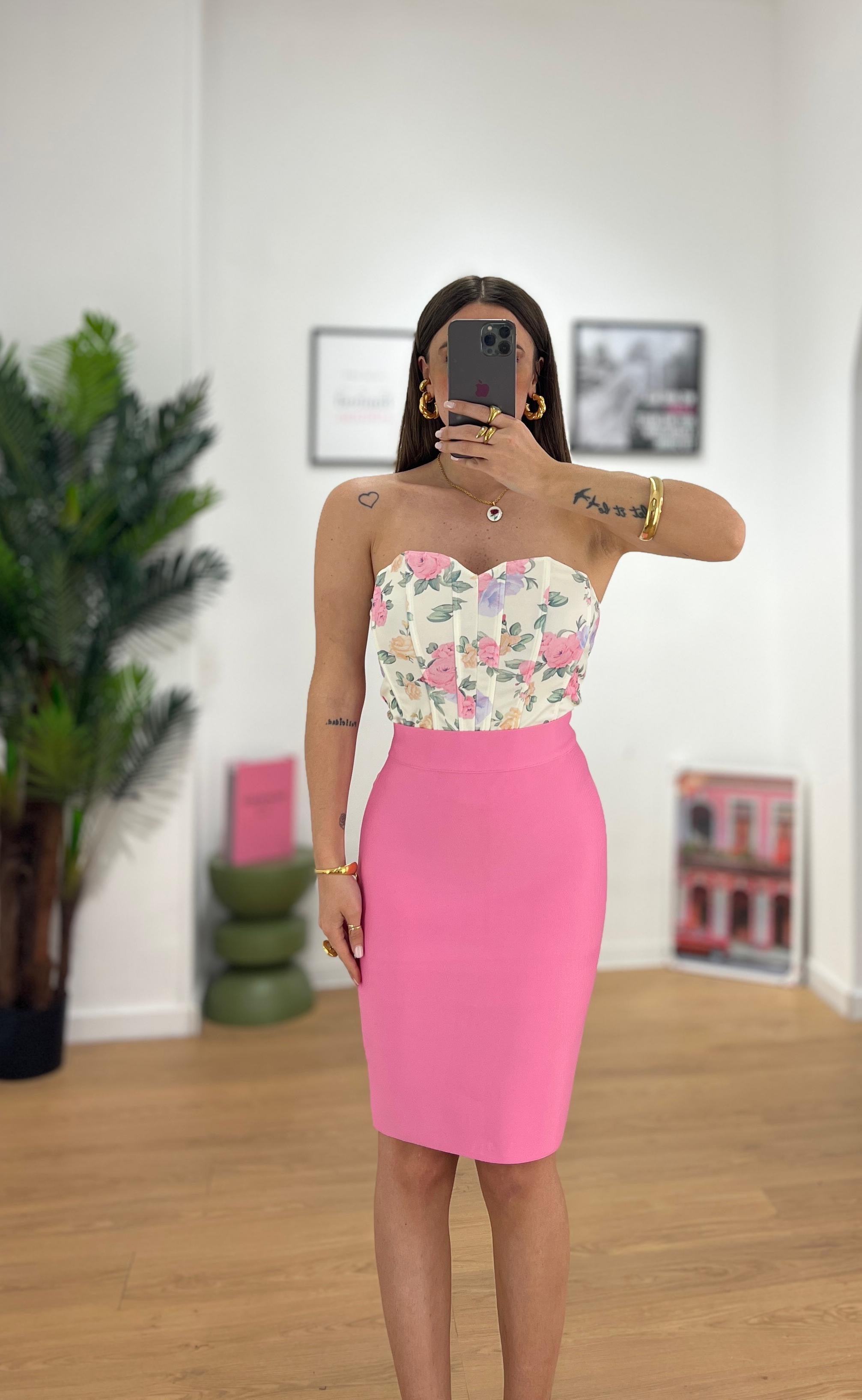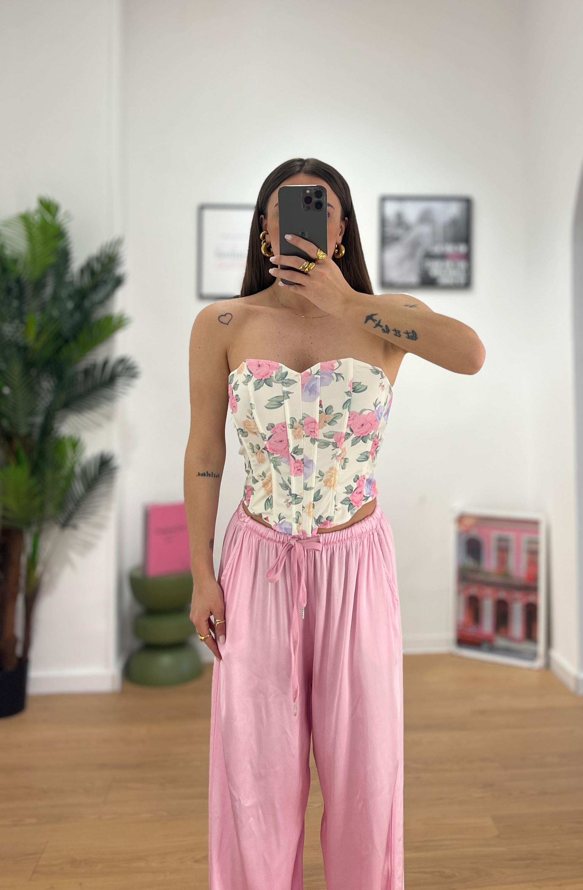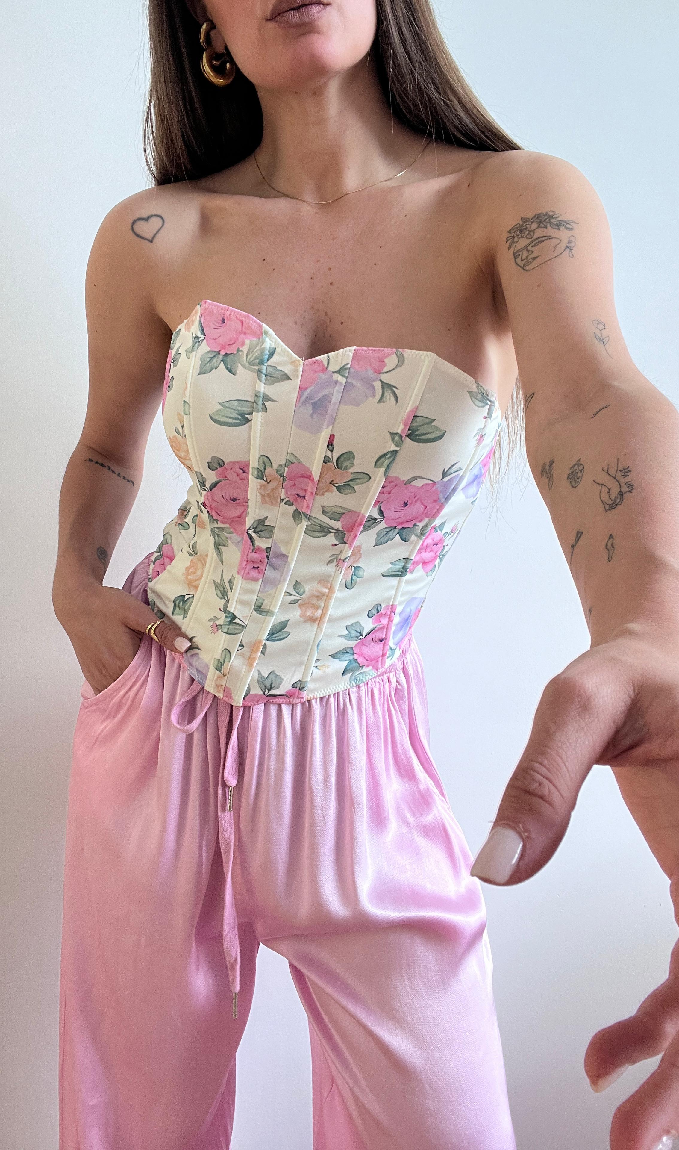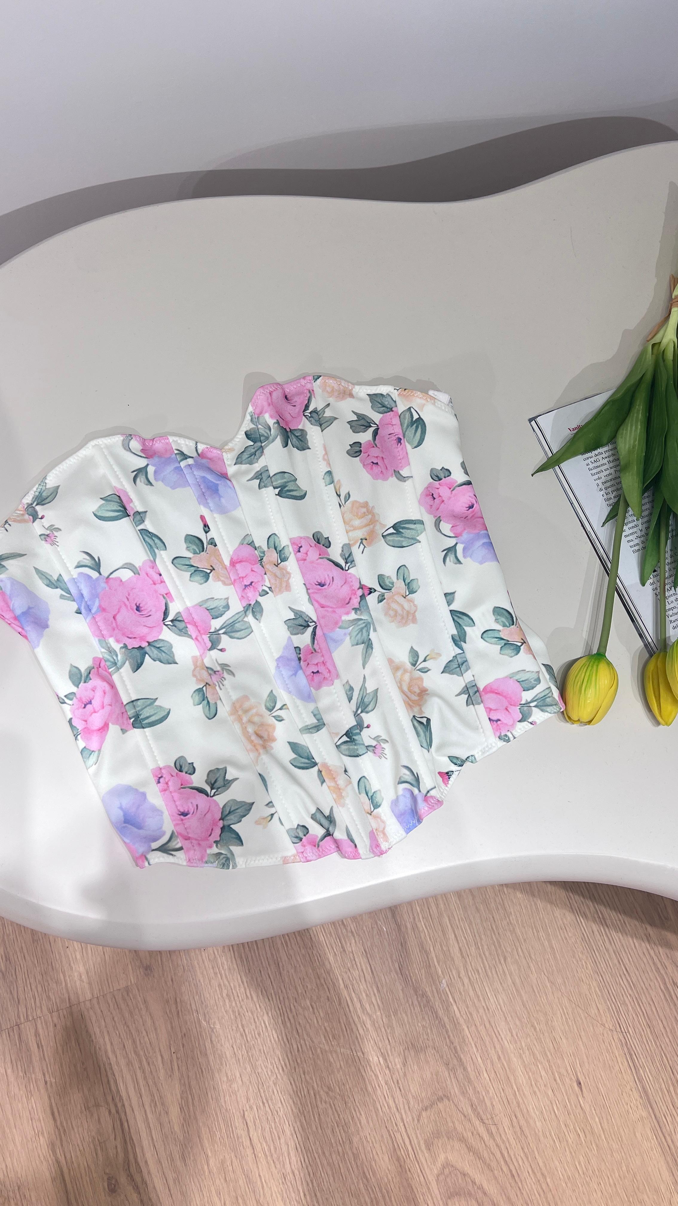 Corpetto da donna fantasia a fiori con stecchette, tessuto elasticizzato e chiusura sul retro da reggiseno ma veste regolarmente la propria taglia e giusy indossa taglia S/M