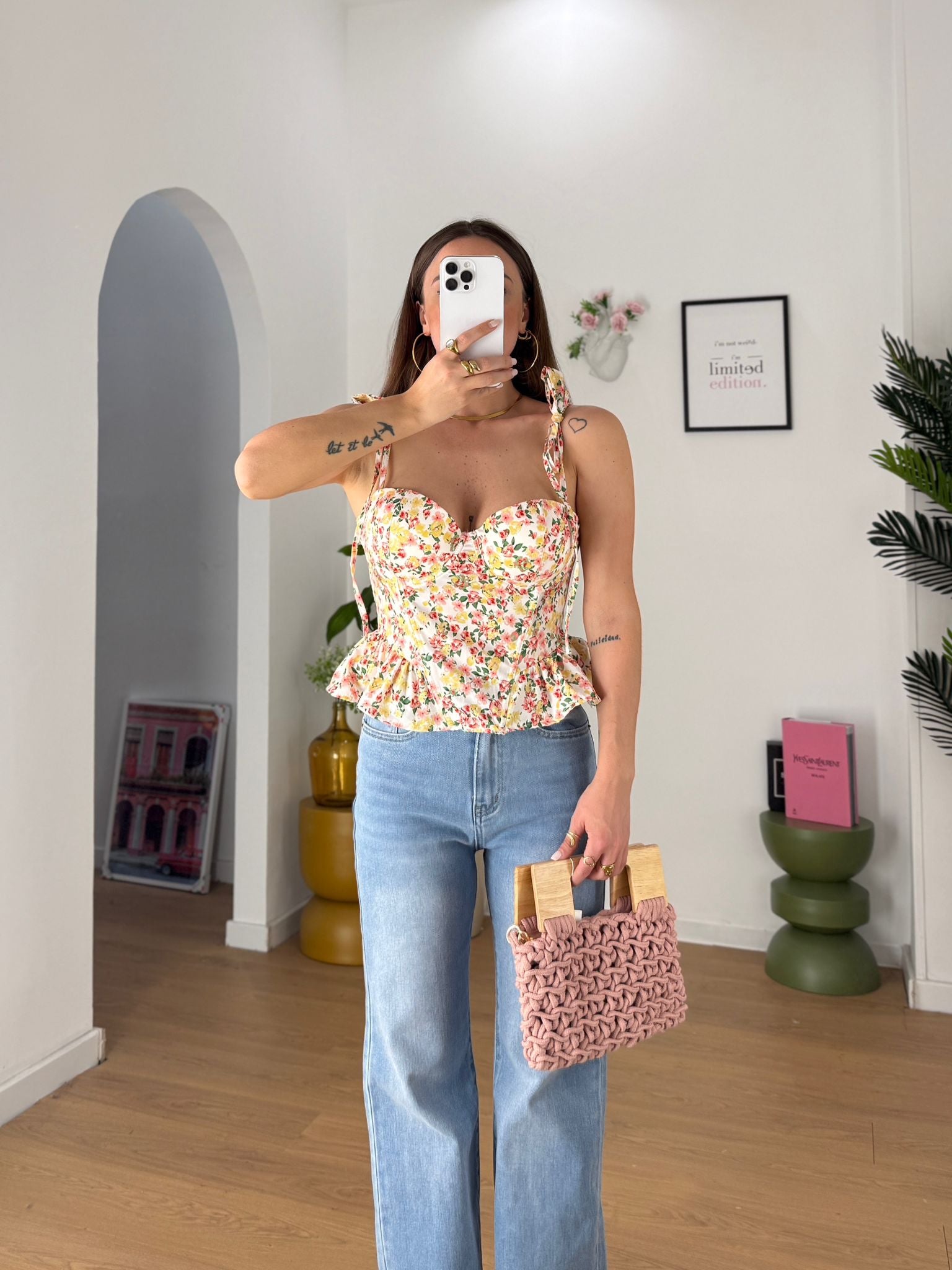 Corpetto da donna a fantasia fiori con coppe imbottite e bretelle con lacci regolabili, veste regolarmente la propria taglia e Giusy indossa taglia S/M