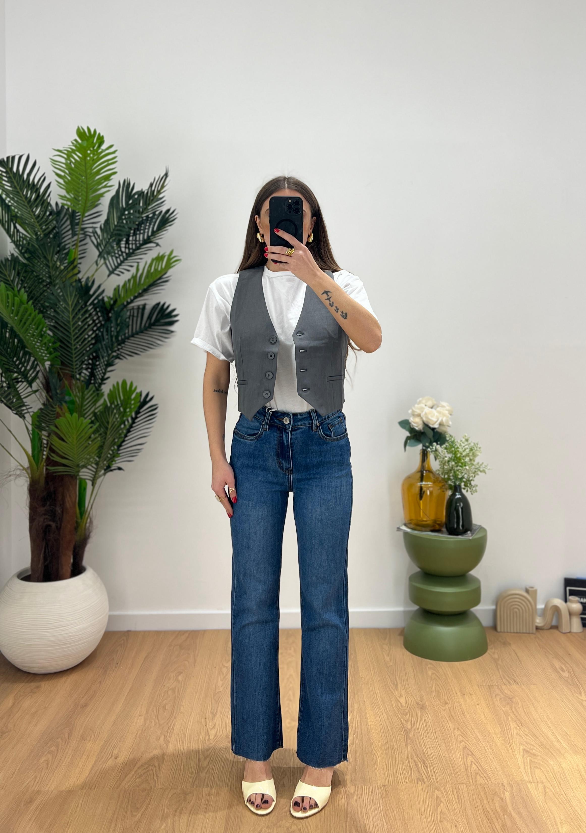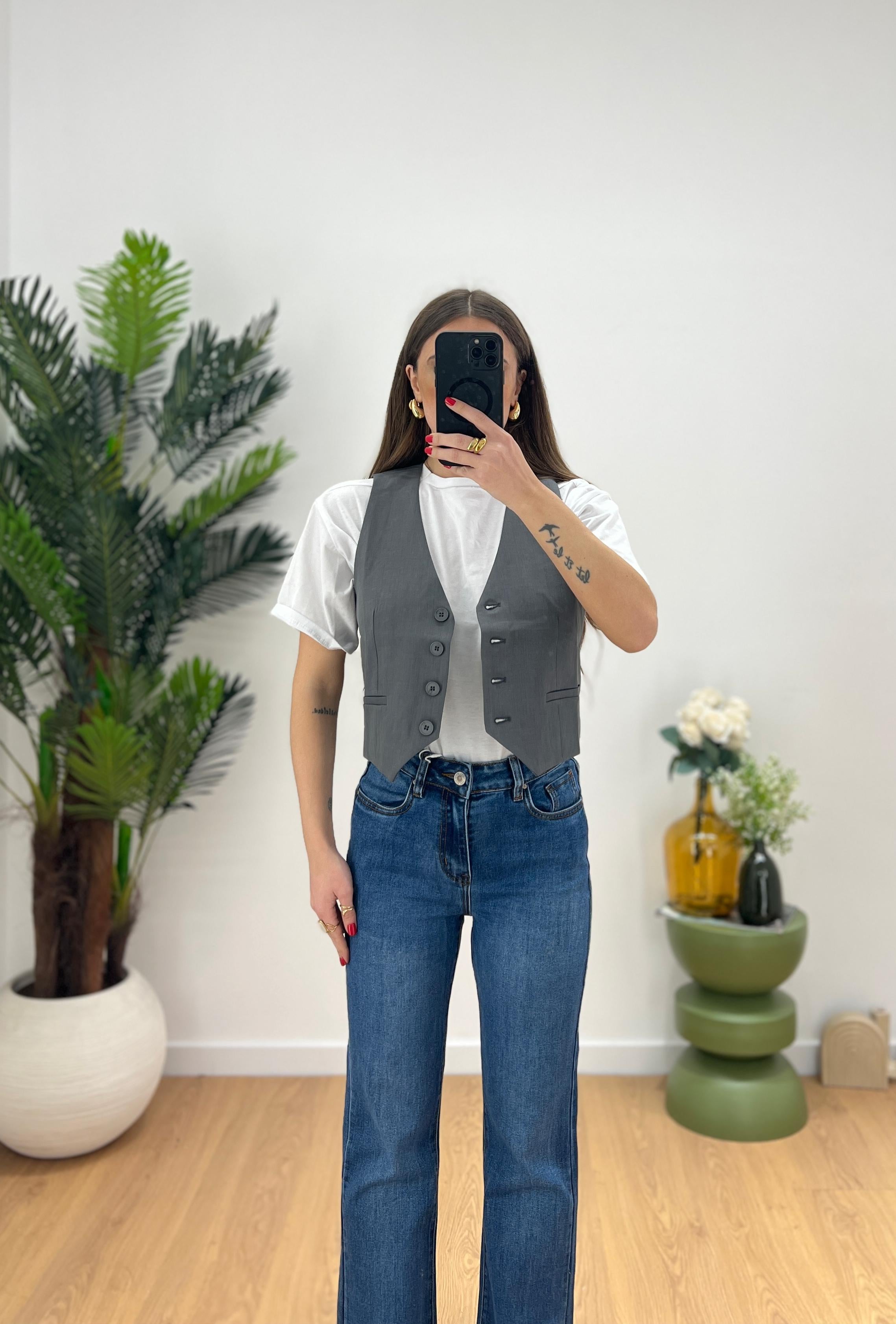Gilet da donna con chiusura bottoncini sul davanti, veste regolarmente la propria taglia e Giusy indossa taglia S