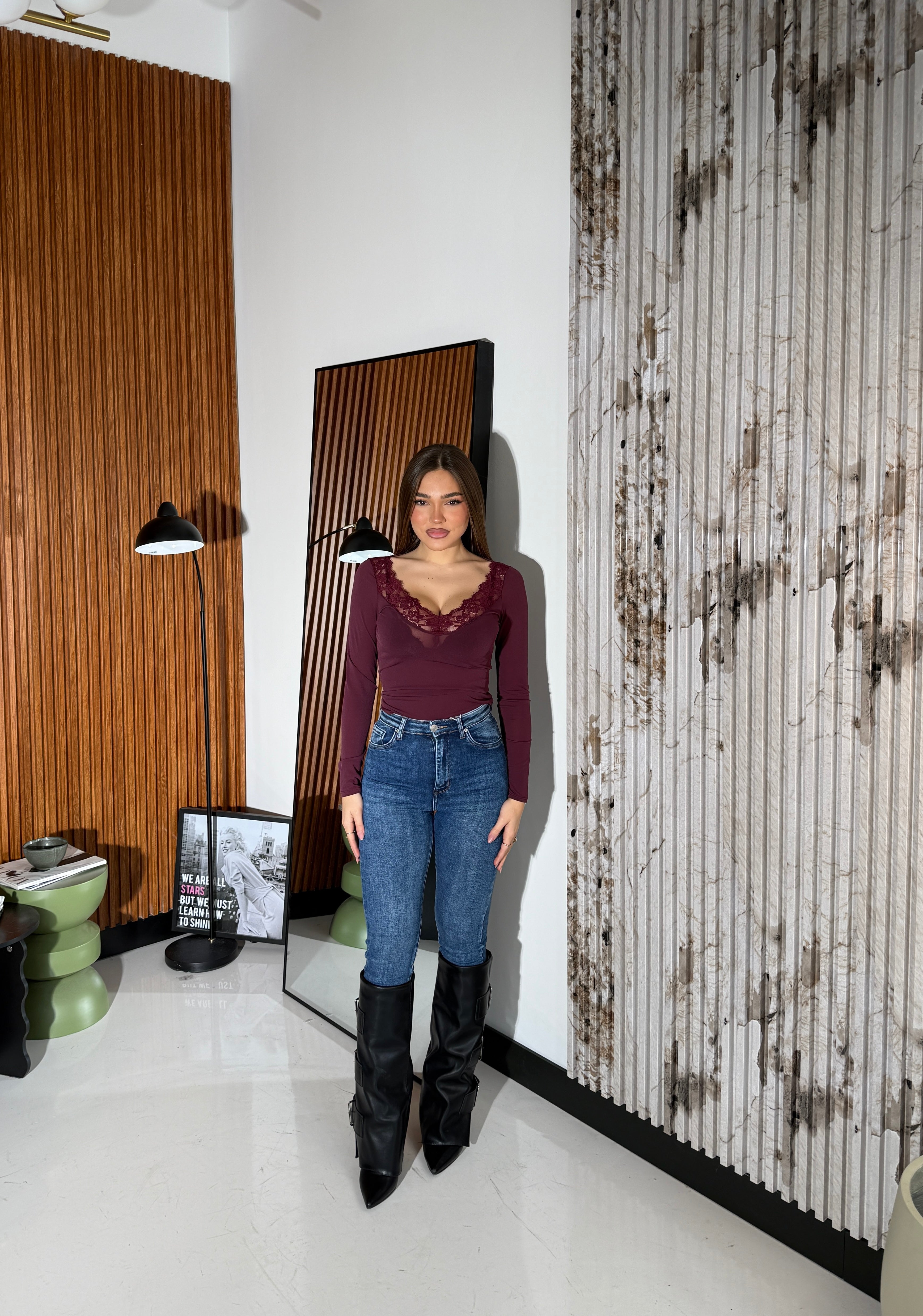 Maglia da donna semi-velata, con particolarità pizzo con scollo a V sul davanti, lunghezza basic ed è un tessuto elasticizzato e vestirà bene fino ad una taglia M/L. La modella è alta 1,65m e pesa 52/53kg