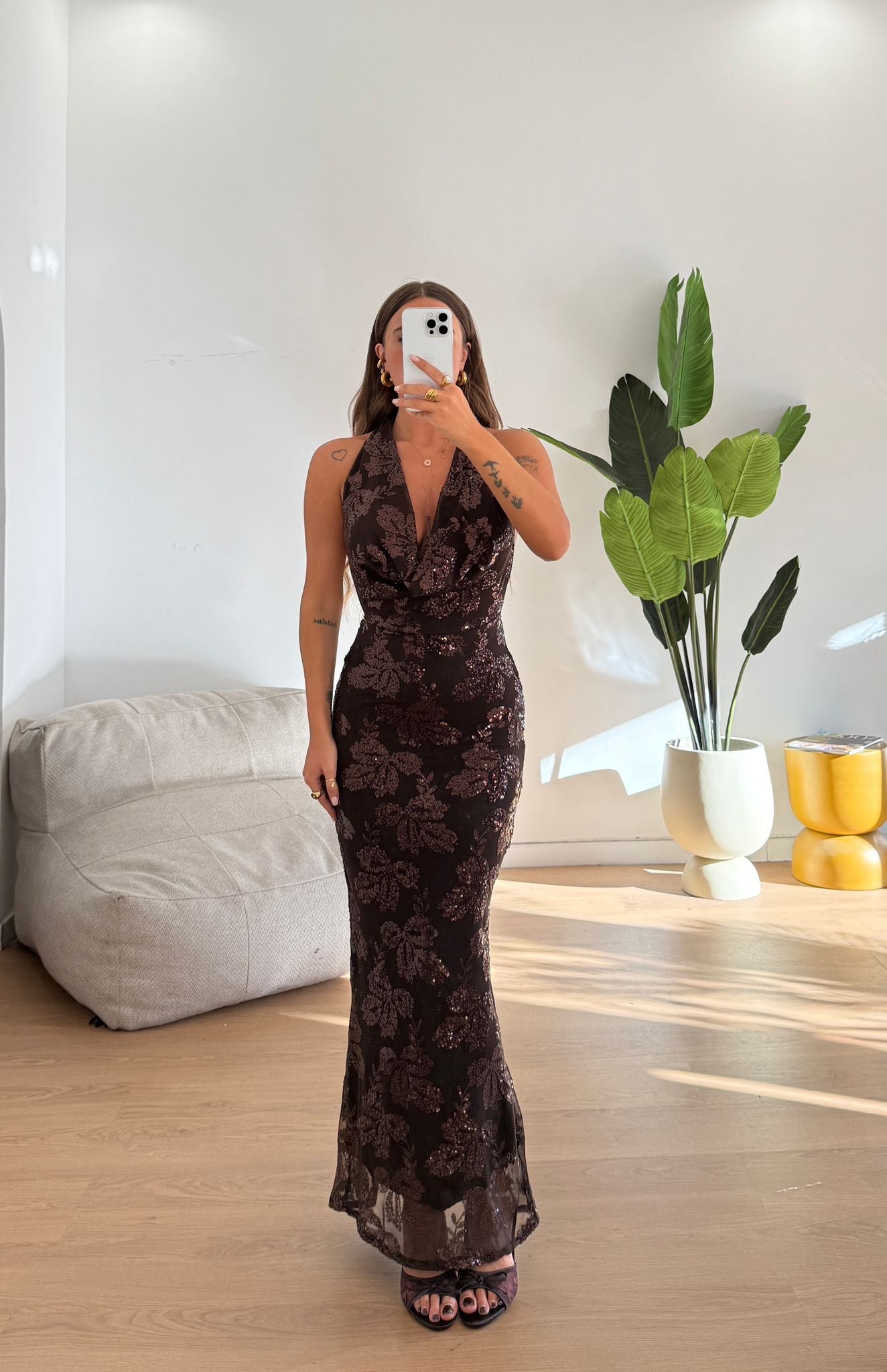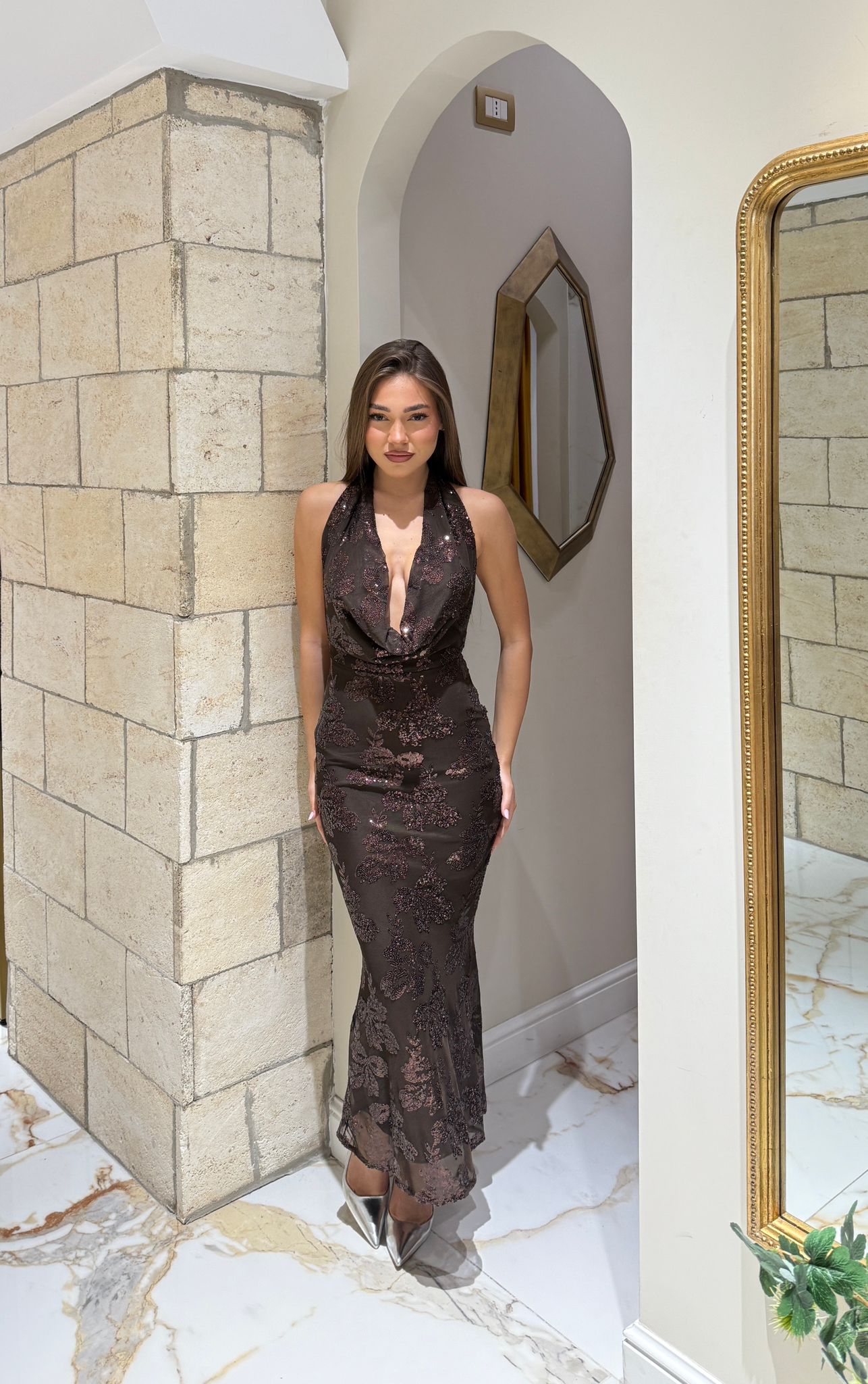 Abito da donna con applicazioni paillettes, scollo morbido sul davanti e schiena scoperta, vestirà bene fino ad una M.