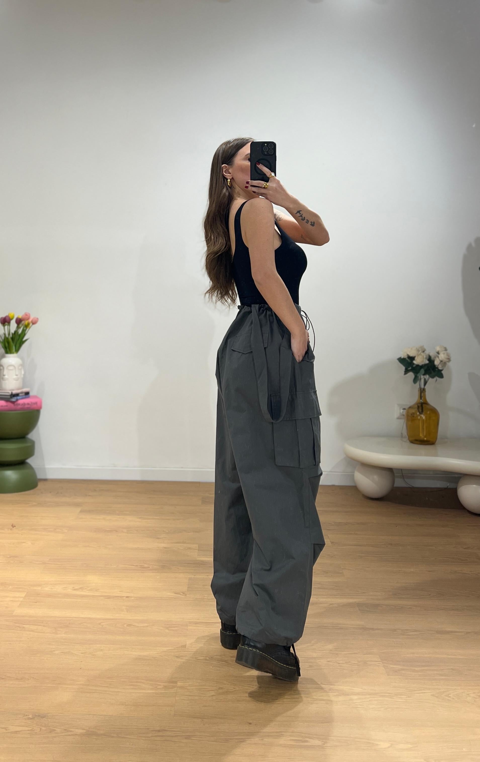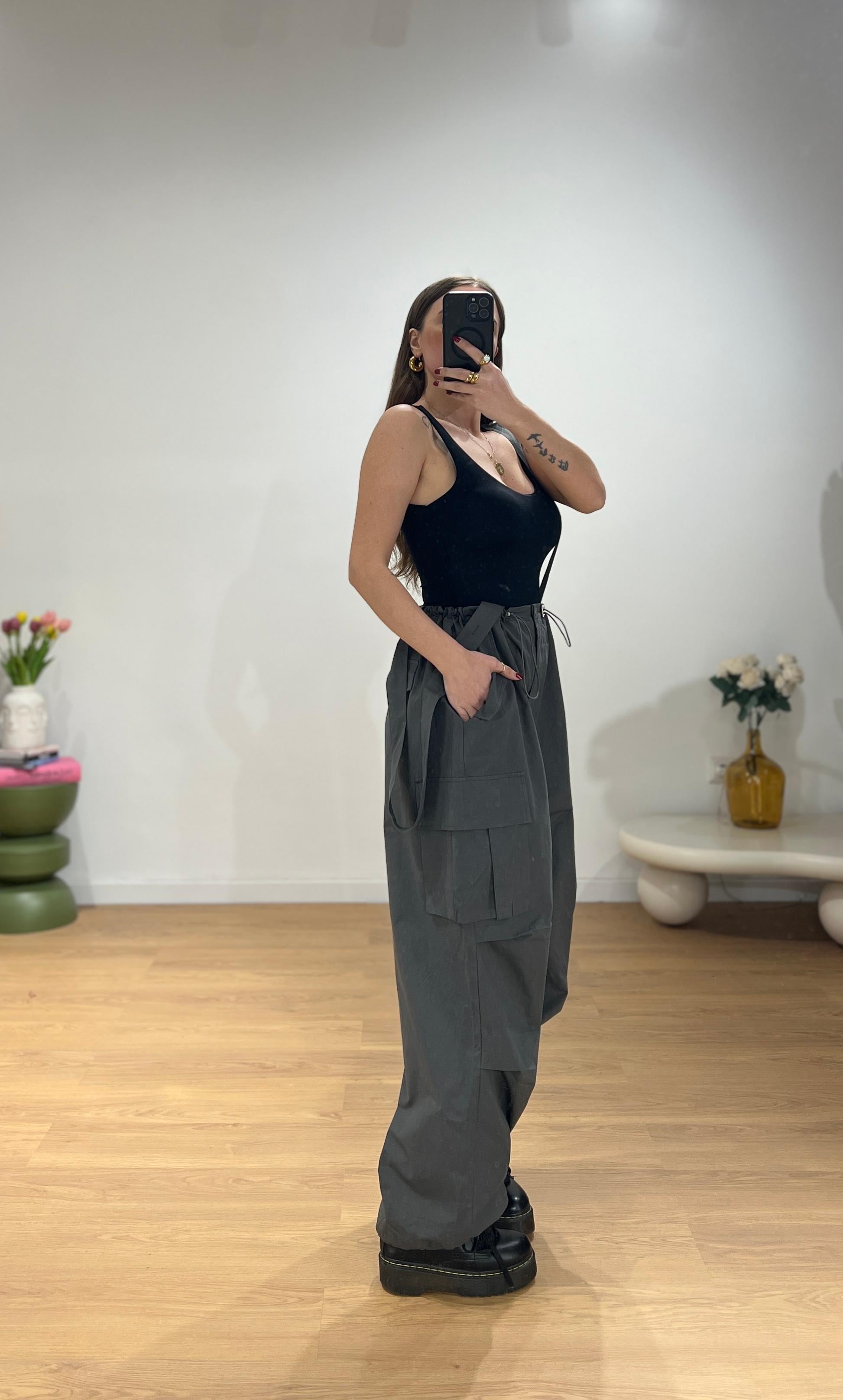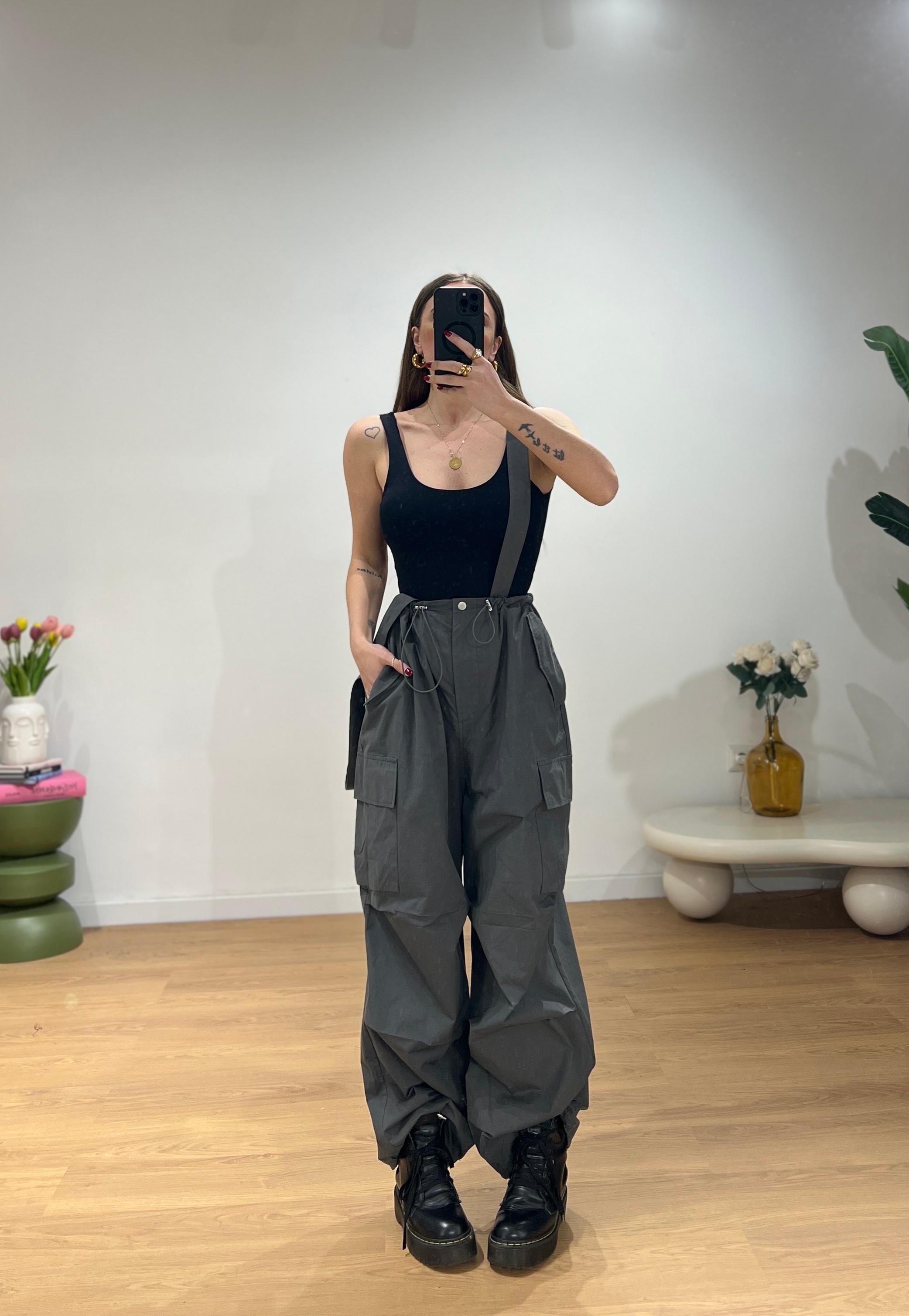 Salopette da donna modello cargo con coulisse regolabile sul finale ma veste regolarmente la propria taglia e Giusy indossa taglia S/M