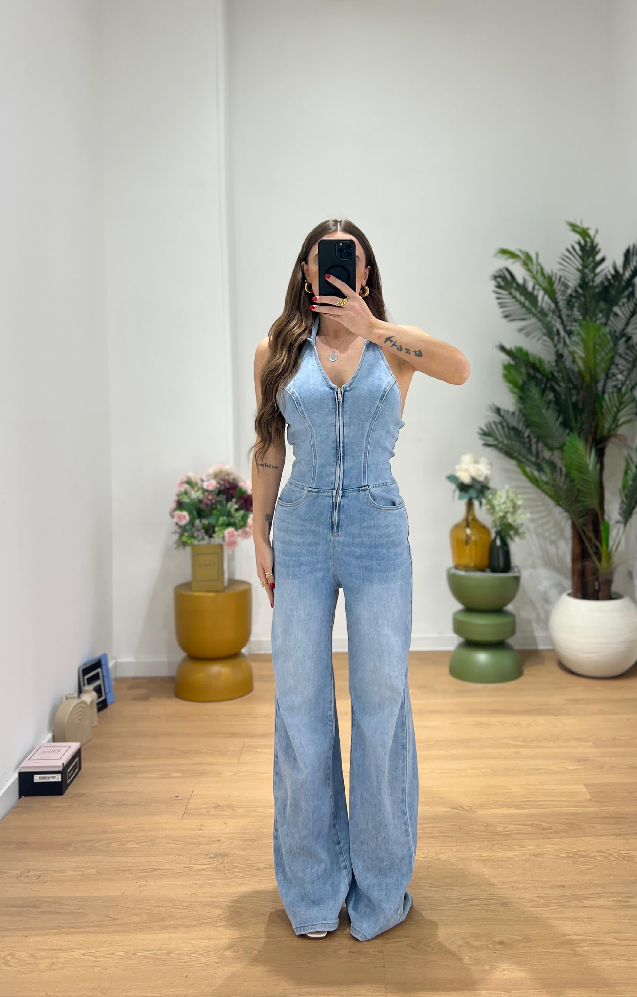 Tuta da donna a palazzo in denim chiaro tessuto elasticizzato con zip sul davanti e veste regolarmente la propria taglia e Giusy indossa taglia S