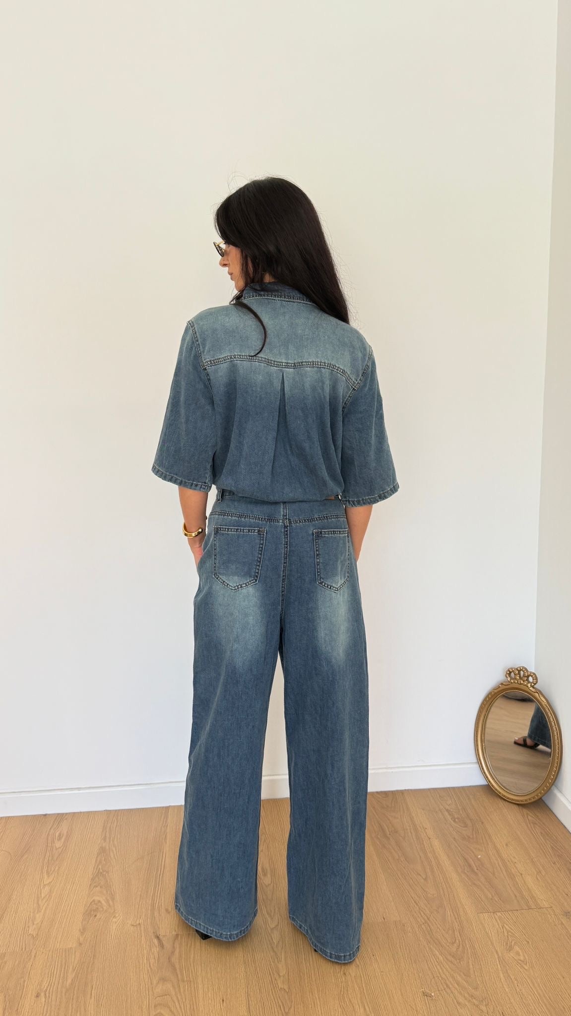 Tuta da donna in denim, tessuto in tela rigida con chiusura bottoni sul davanti e veste regolarmente la propria taglia e Giusy indossa taglia S/M