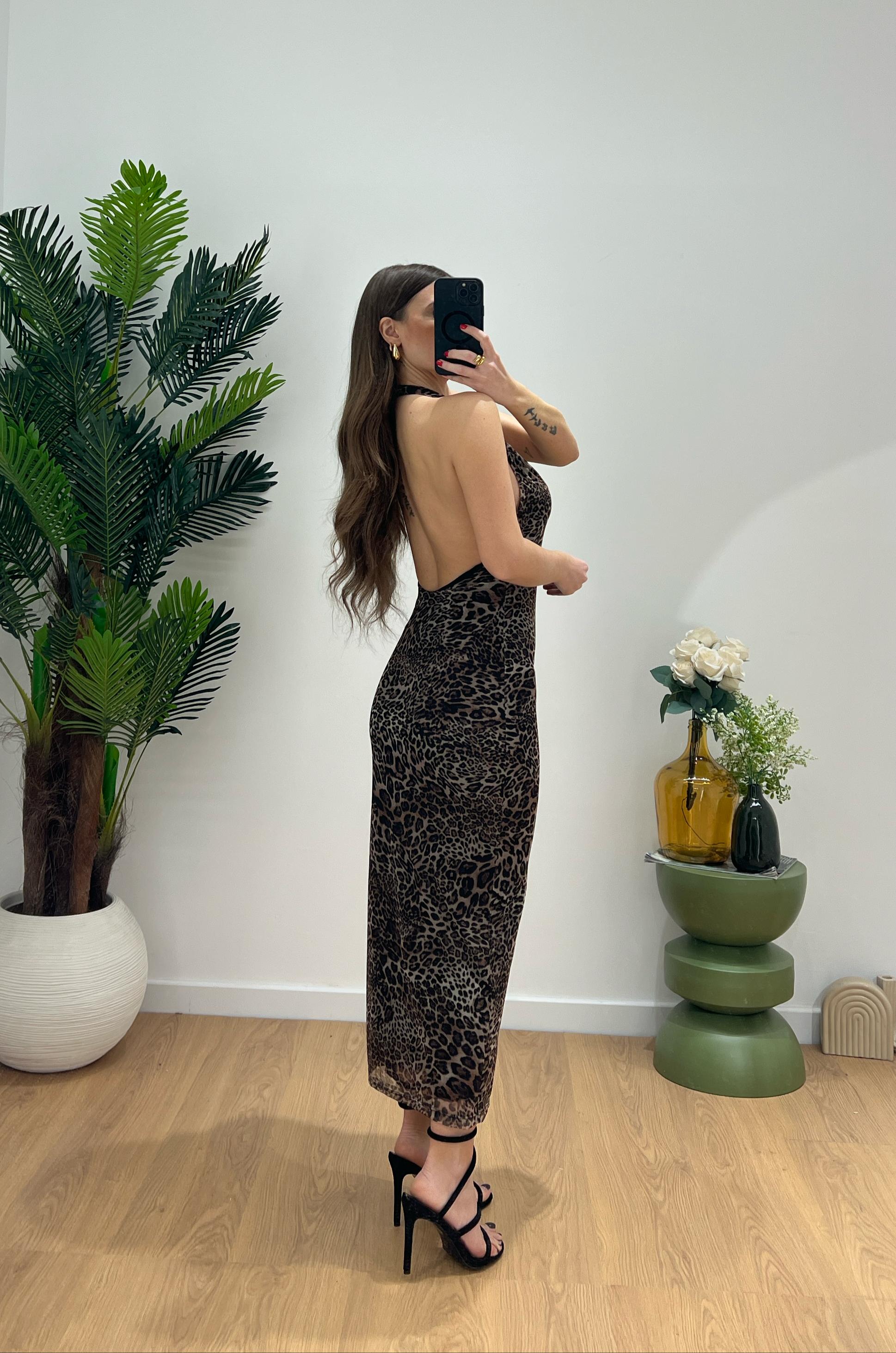 Abito da donna fantasia animalier,tessuto elasticizzato con fodera interna, non traspare e con schiena scoperta. Vestibilita fino ad una M/L
