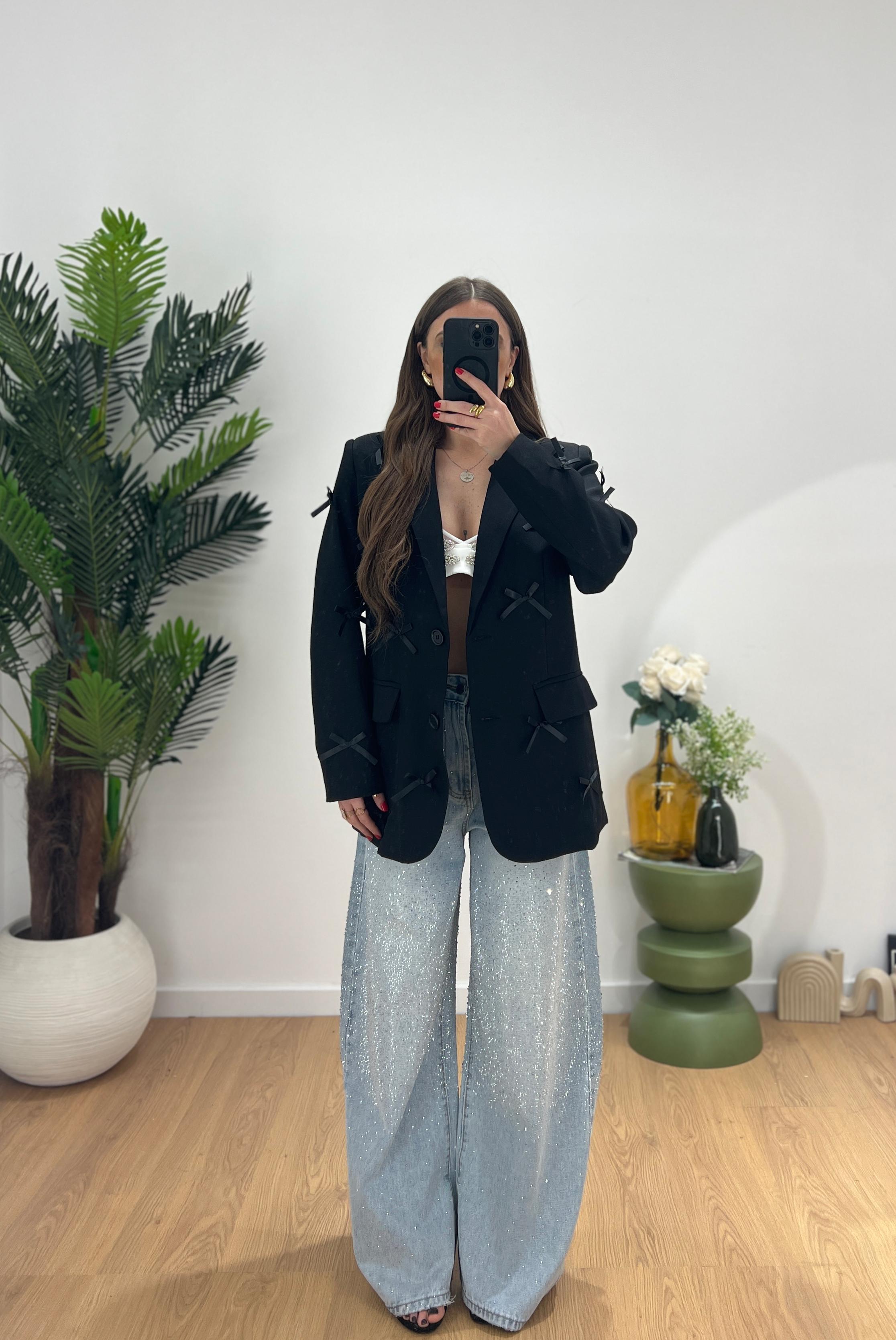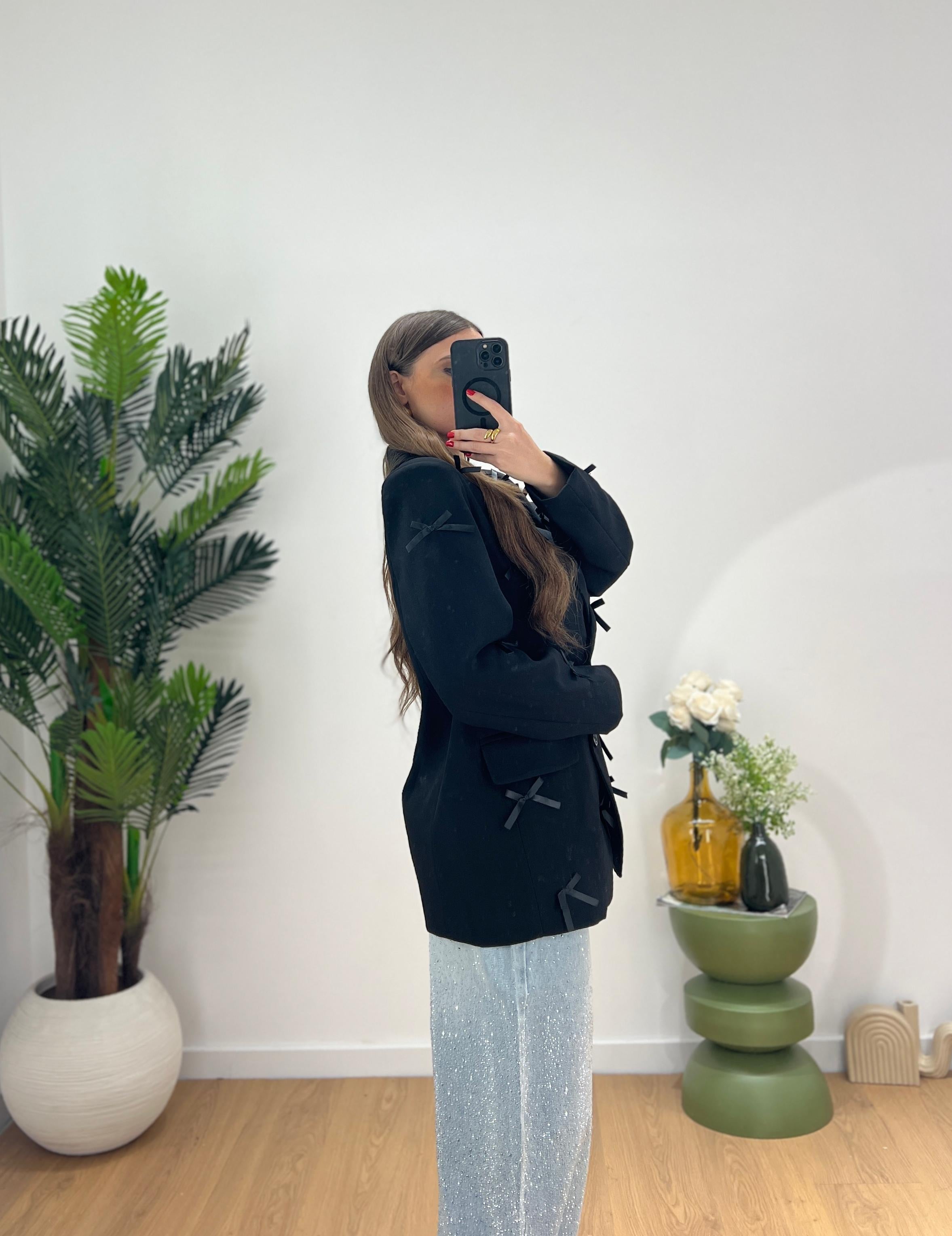 Blazer da donna top quality foderata internamente e con spalline imbottite e applicazione fiocchi non rimovibili. Veste regolarmente la propria taglia e Giusy indossa taglia S
