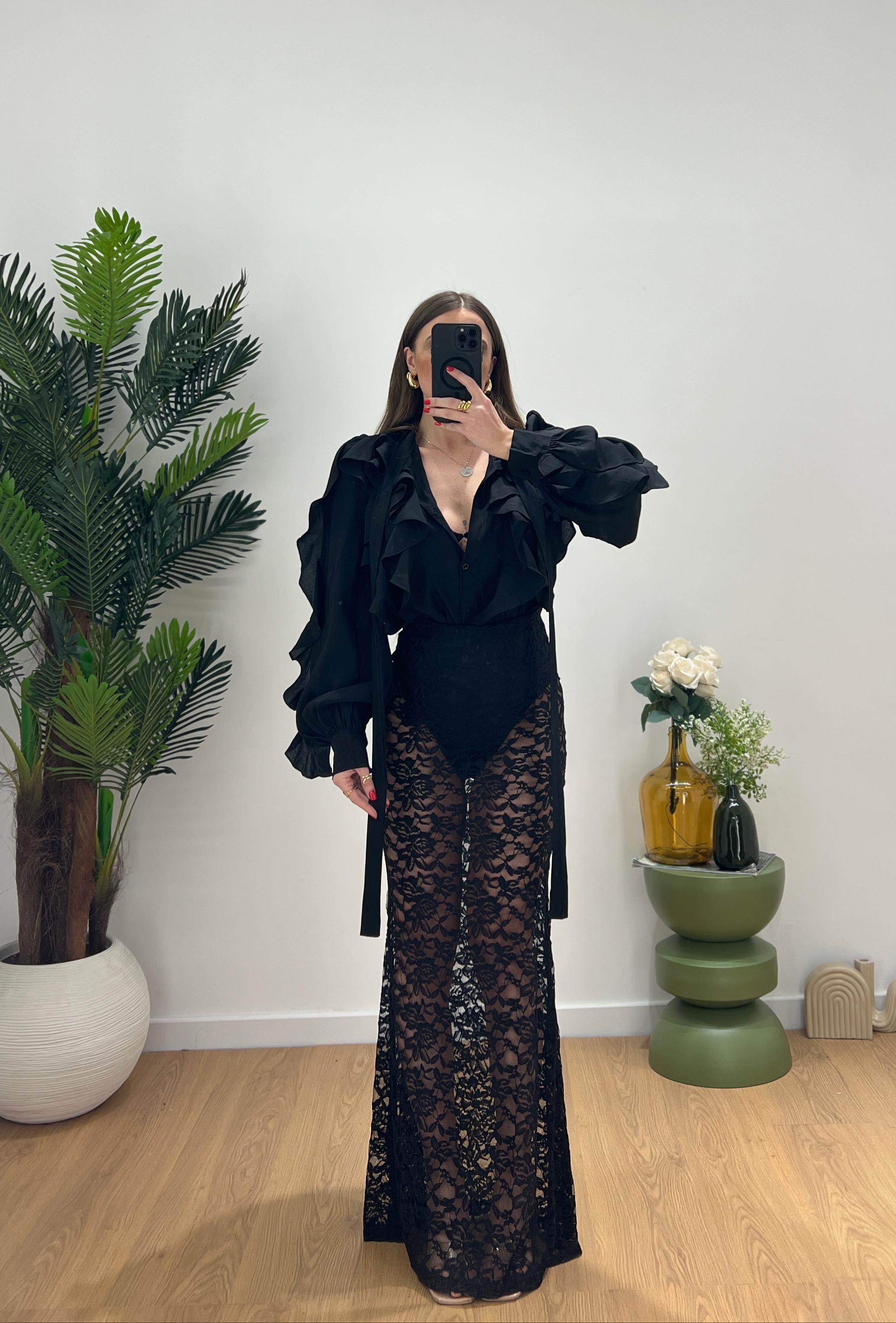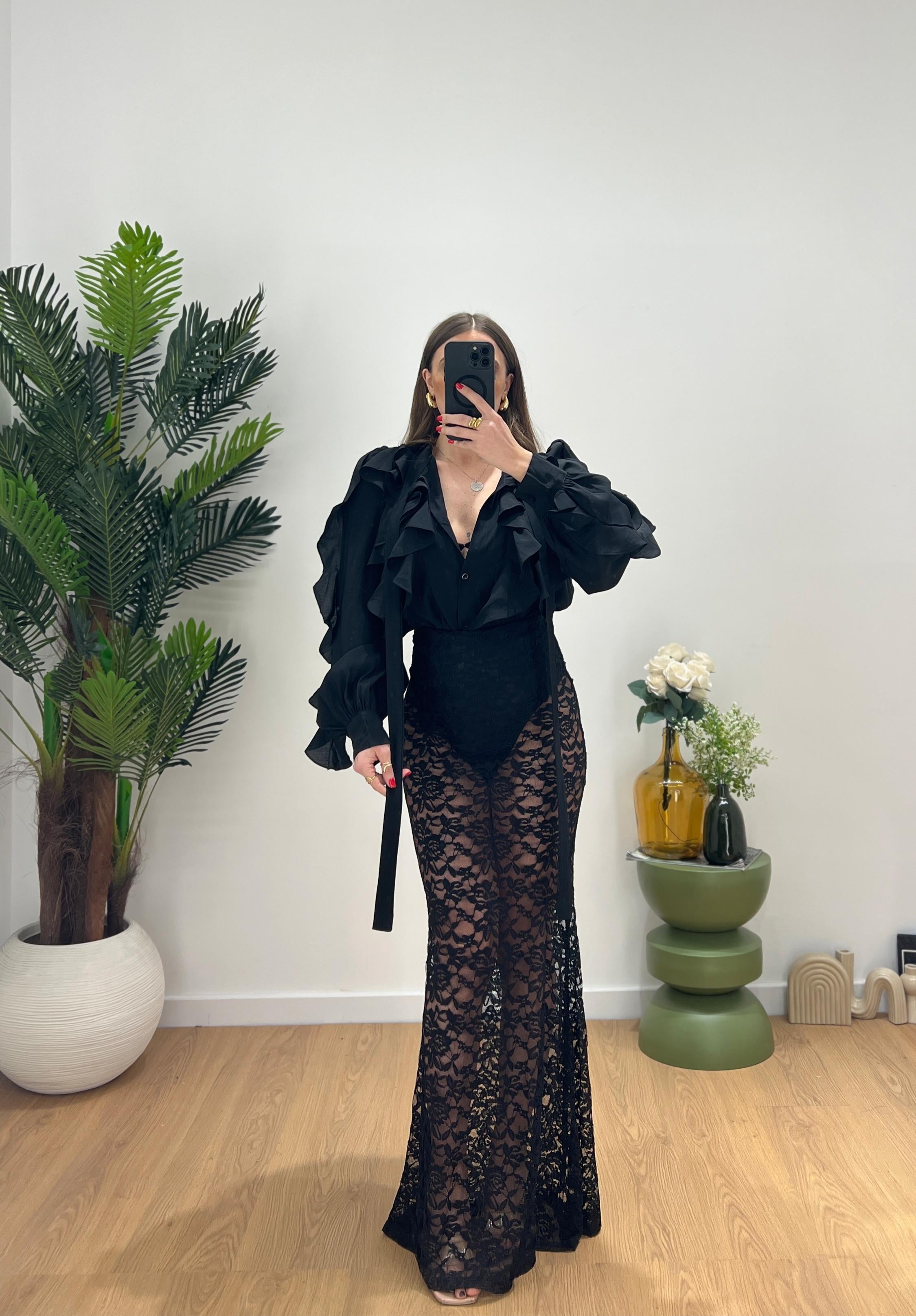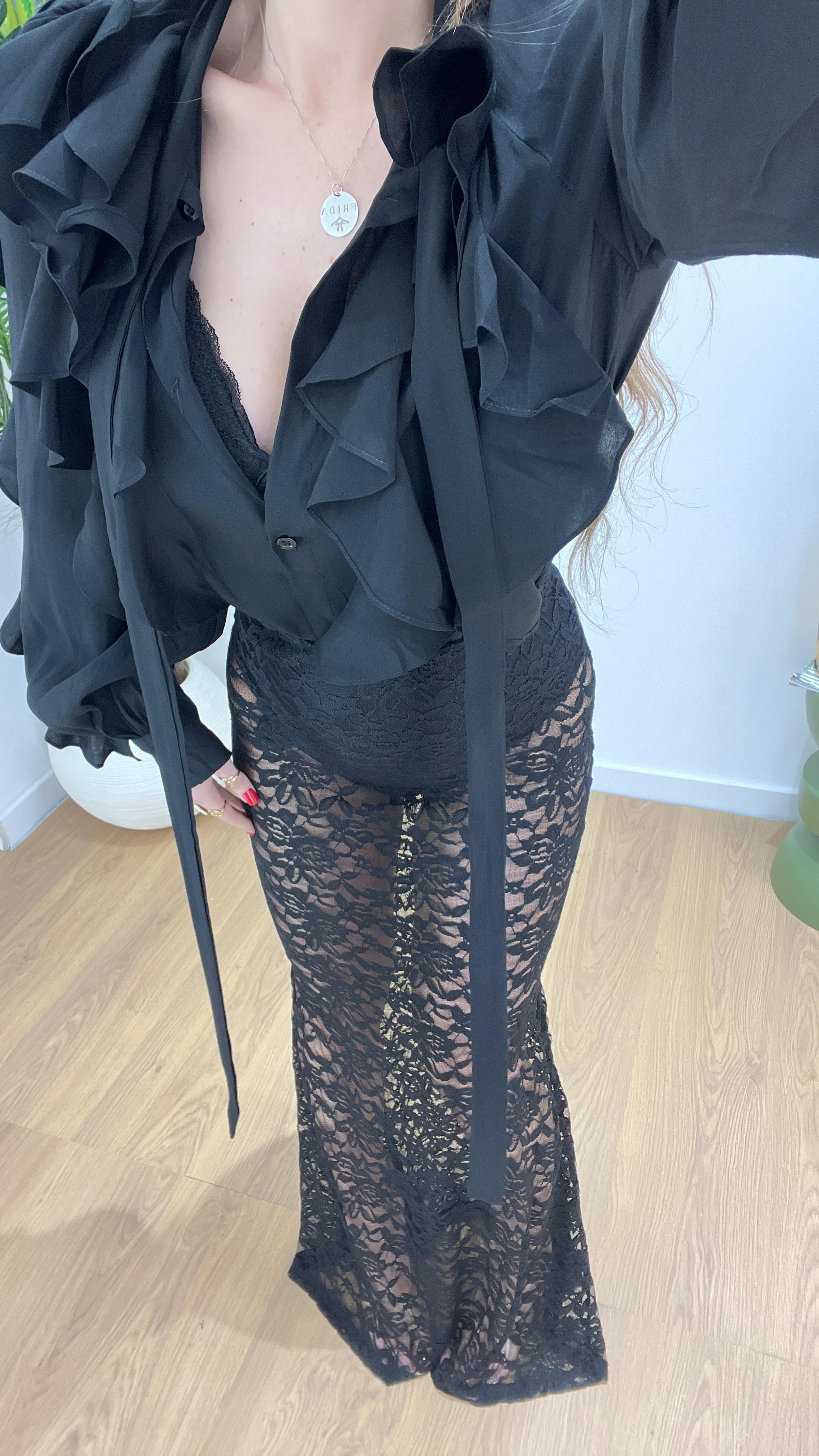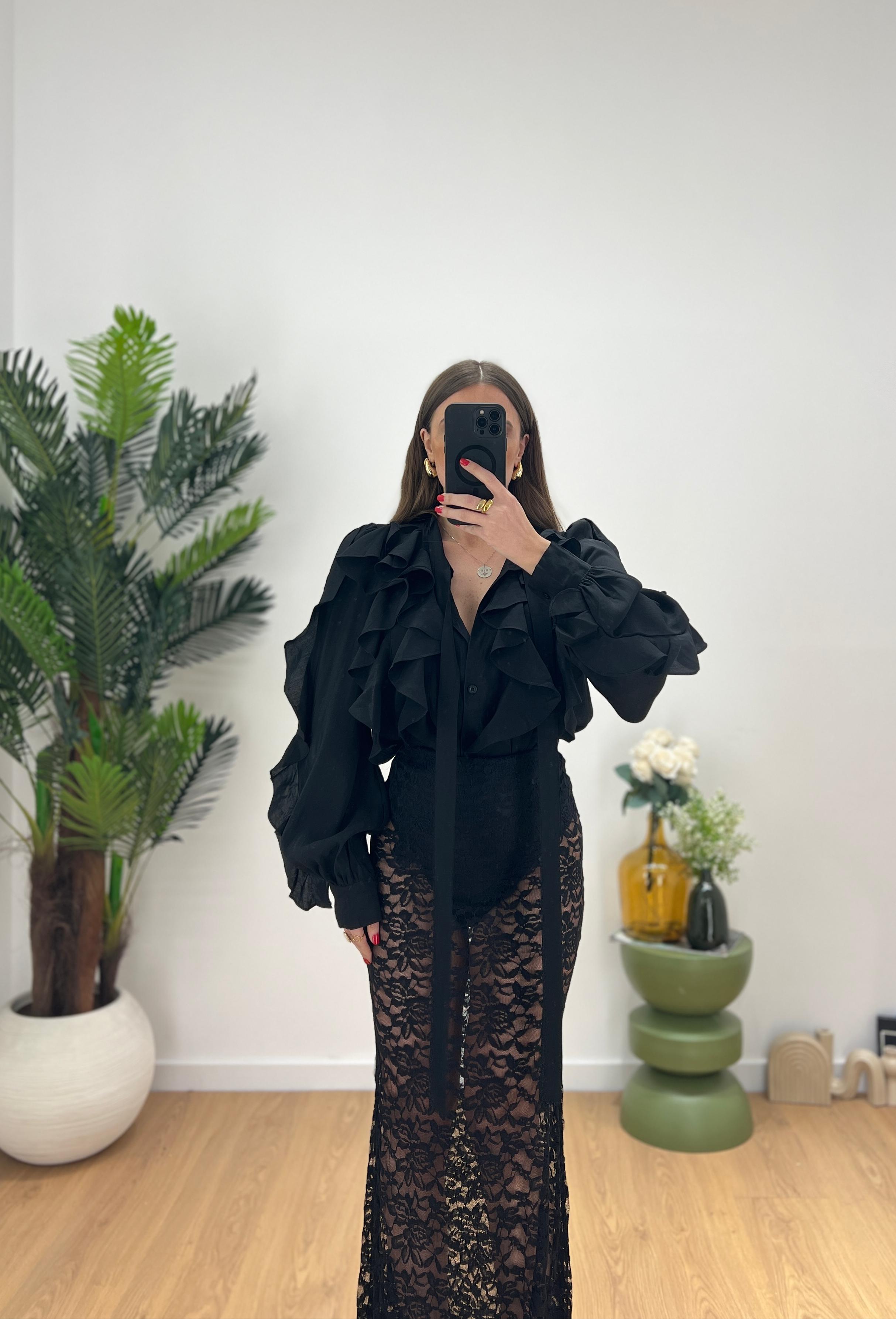 Camicia da donna in cotone leggero con particolarià rouche, chiusura bottoncini e veste regolarmente la propria taglia e giusy indossa taglia S/M