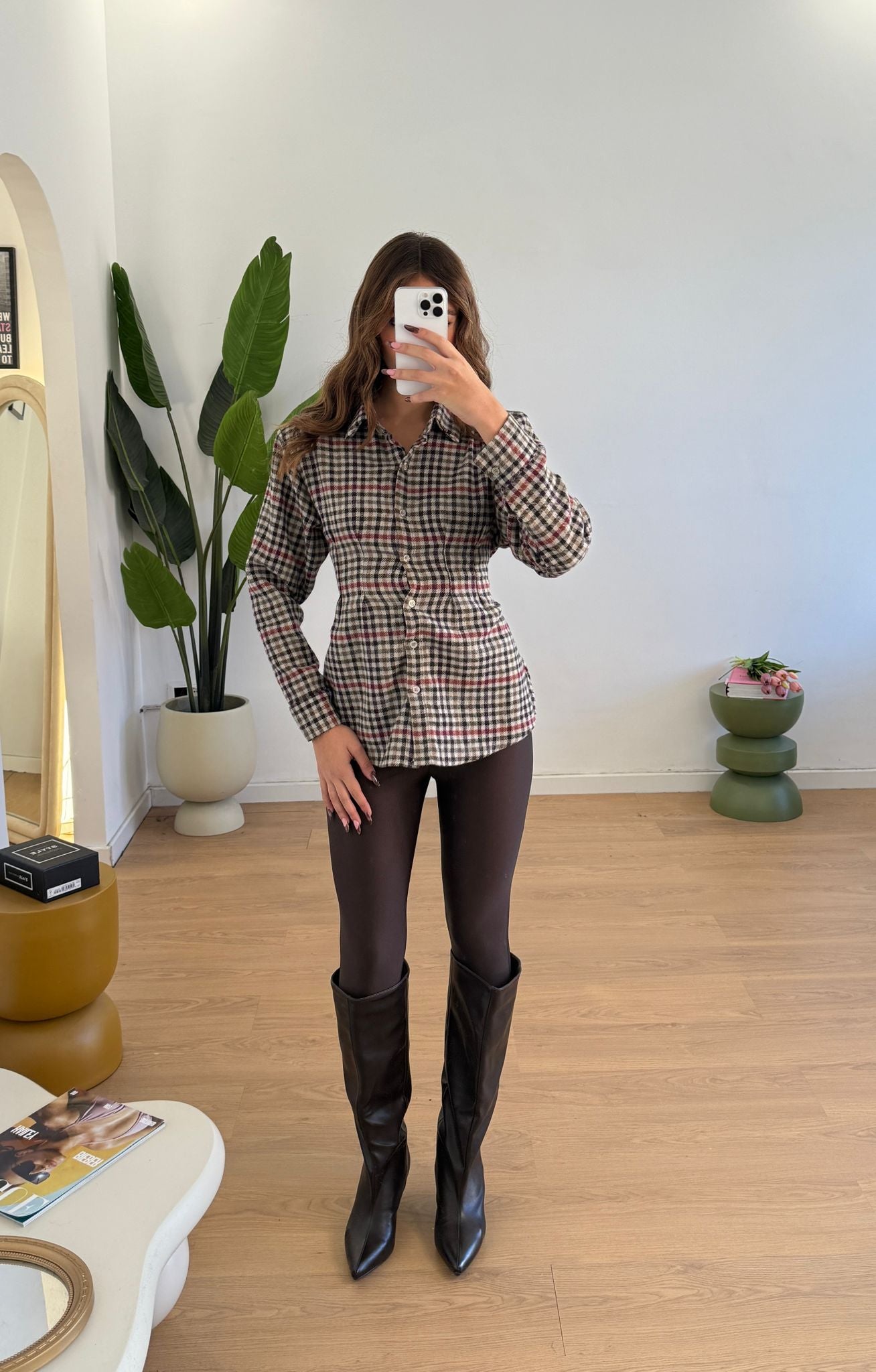 Camicia da donna in flanella, con coppe imbottite, chiusura a bottoni e fiocco sul retro.