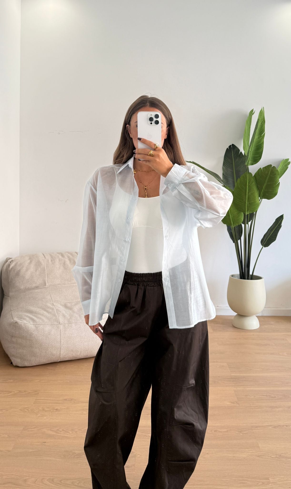 Camicia semitrasparente, tessuto leggero, vestibilità over, veste regolarmente la propria taglia.