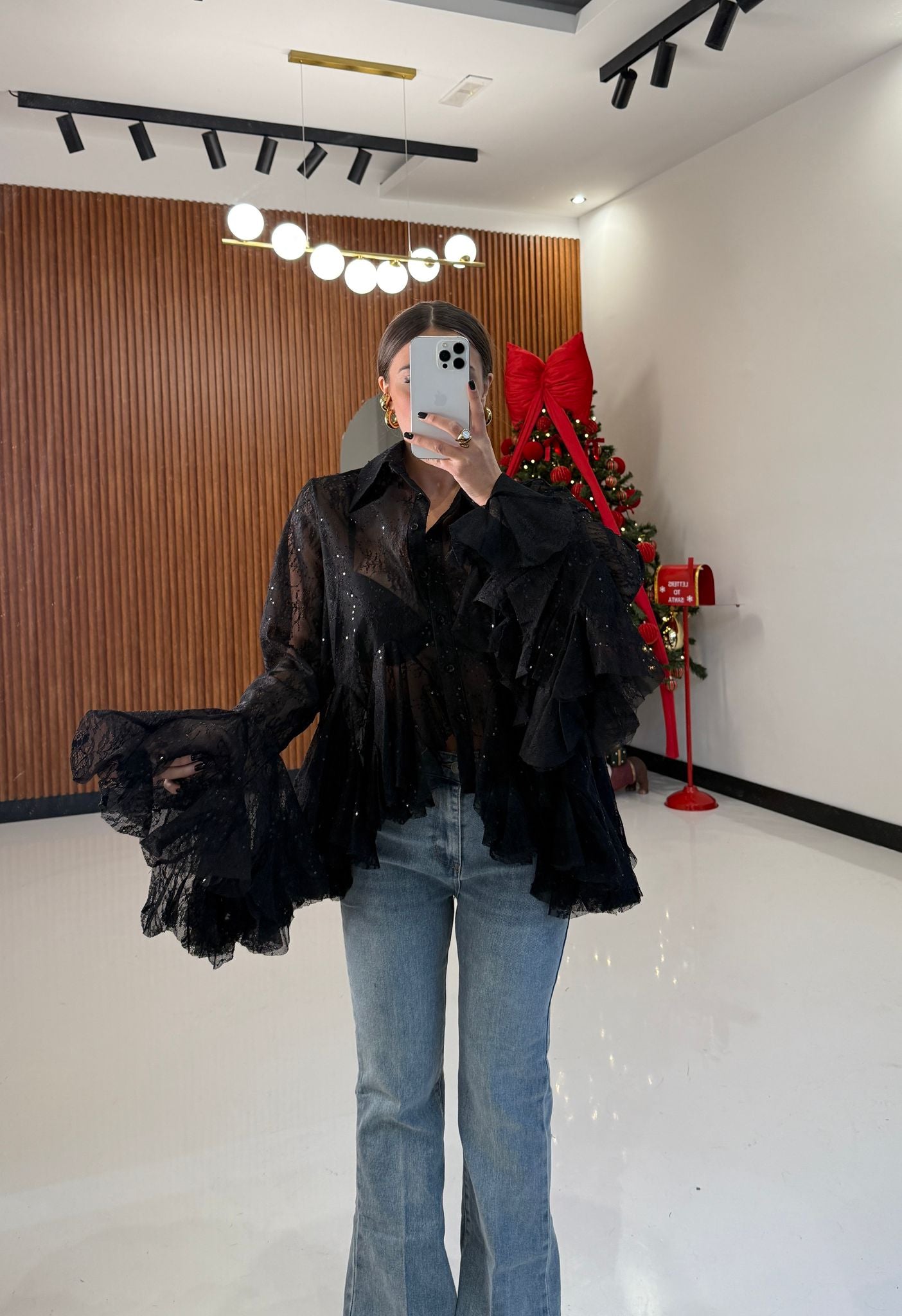 Camicia da donna velata con paillettes, vestibilità oversize e vestirà bene fino ad una M/L piena