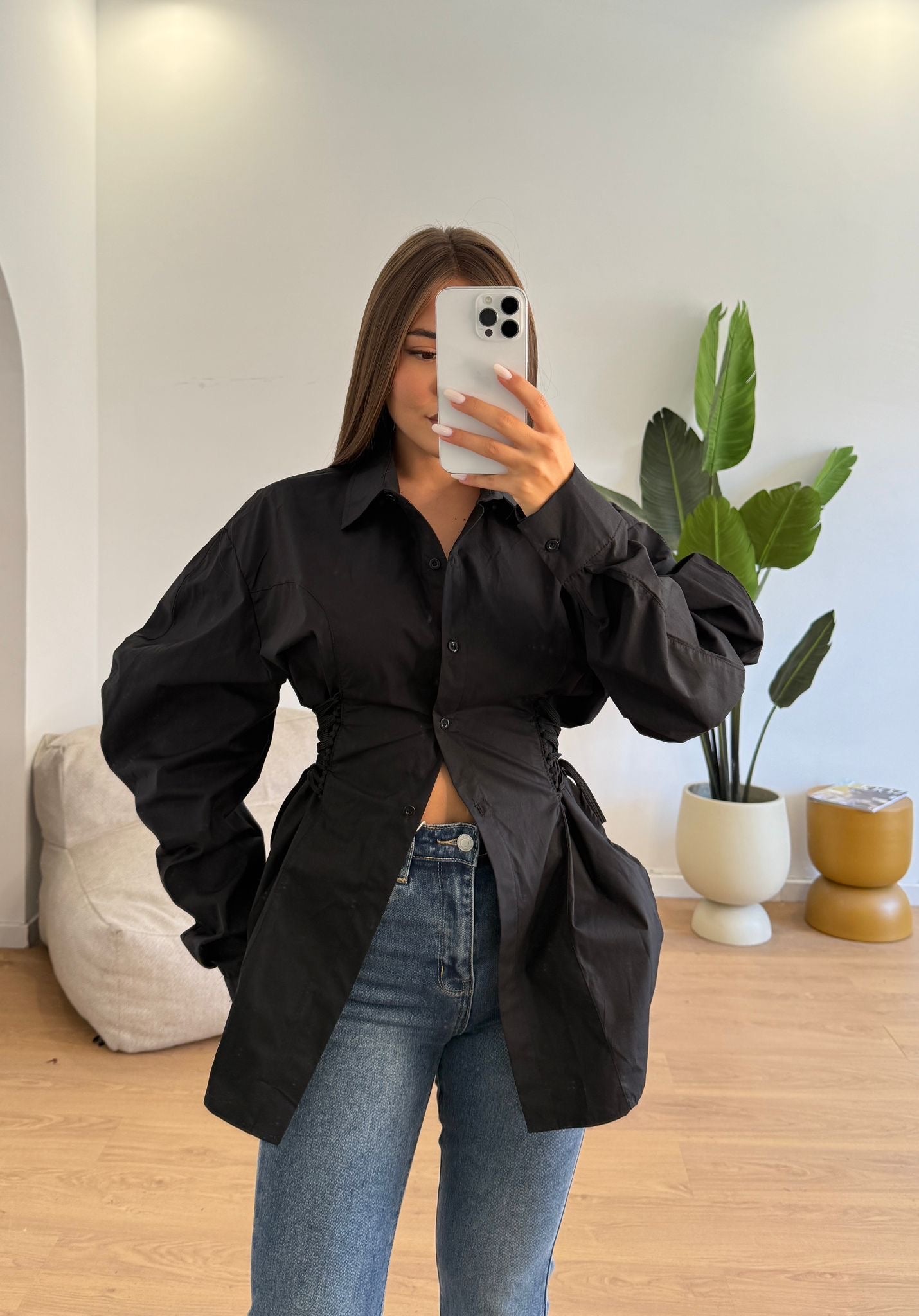 Camicia da donna con intreccio laccio ai lati regolabili. Taglia unica, veste bene fino ad una taglia M.