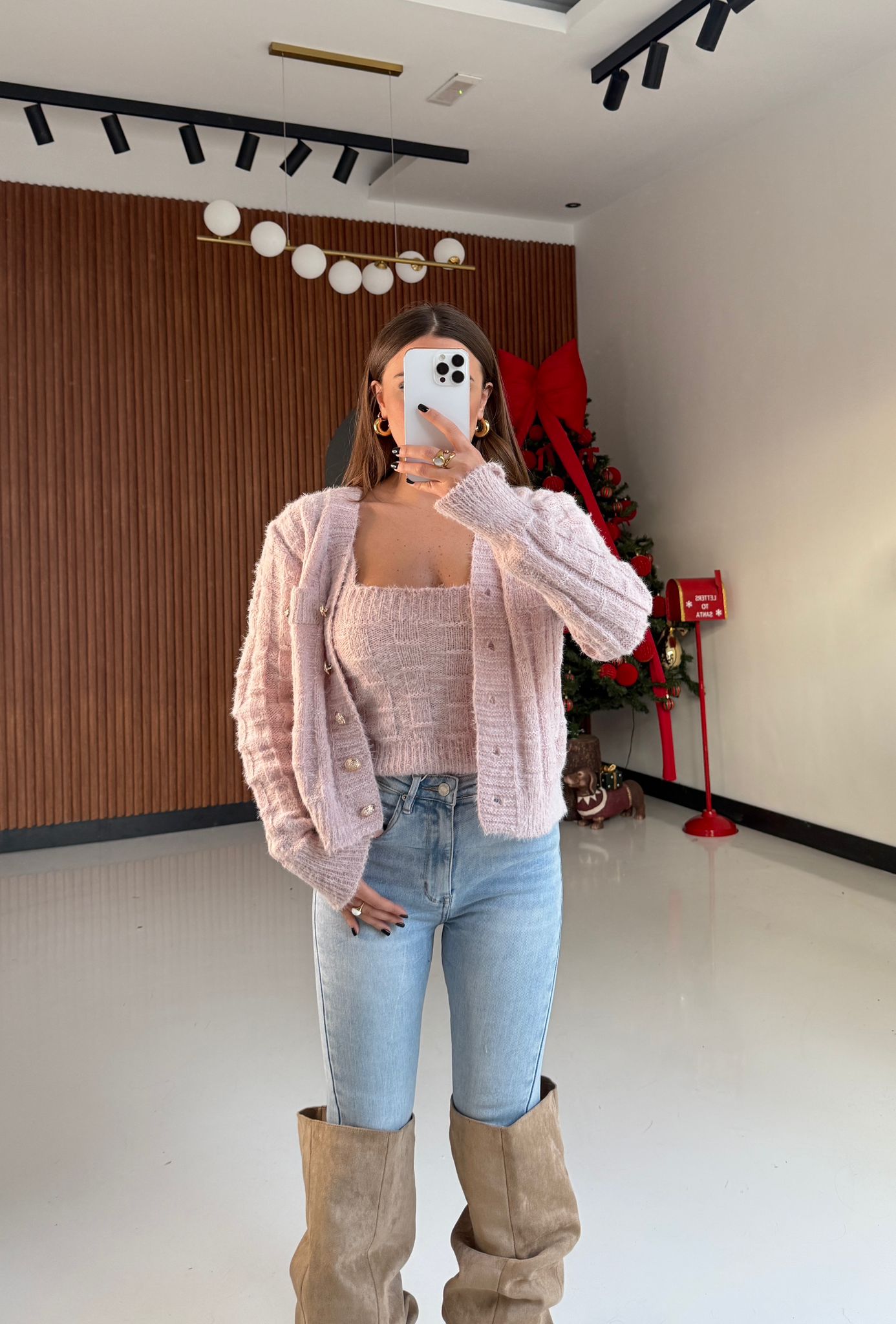 Coord.set da donna in lana rasata composto da top e cardigan con polsini, tessuto elasticizzato. Taglia unica, veste bene fino ad una M piena.