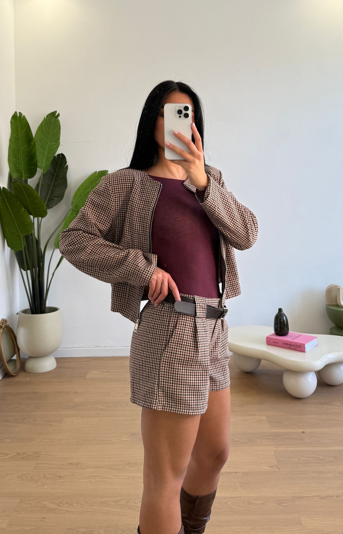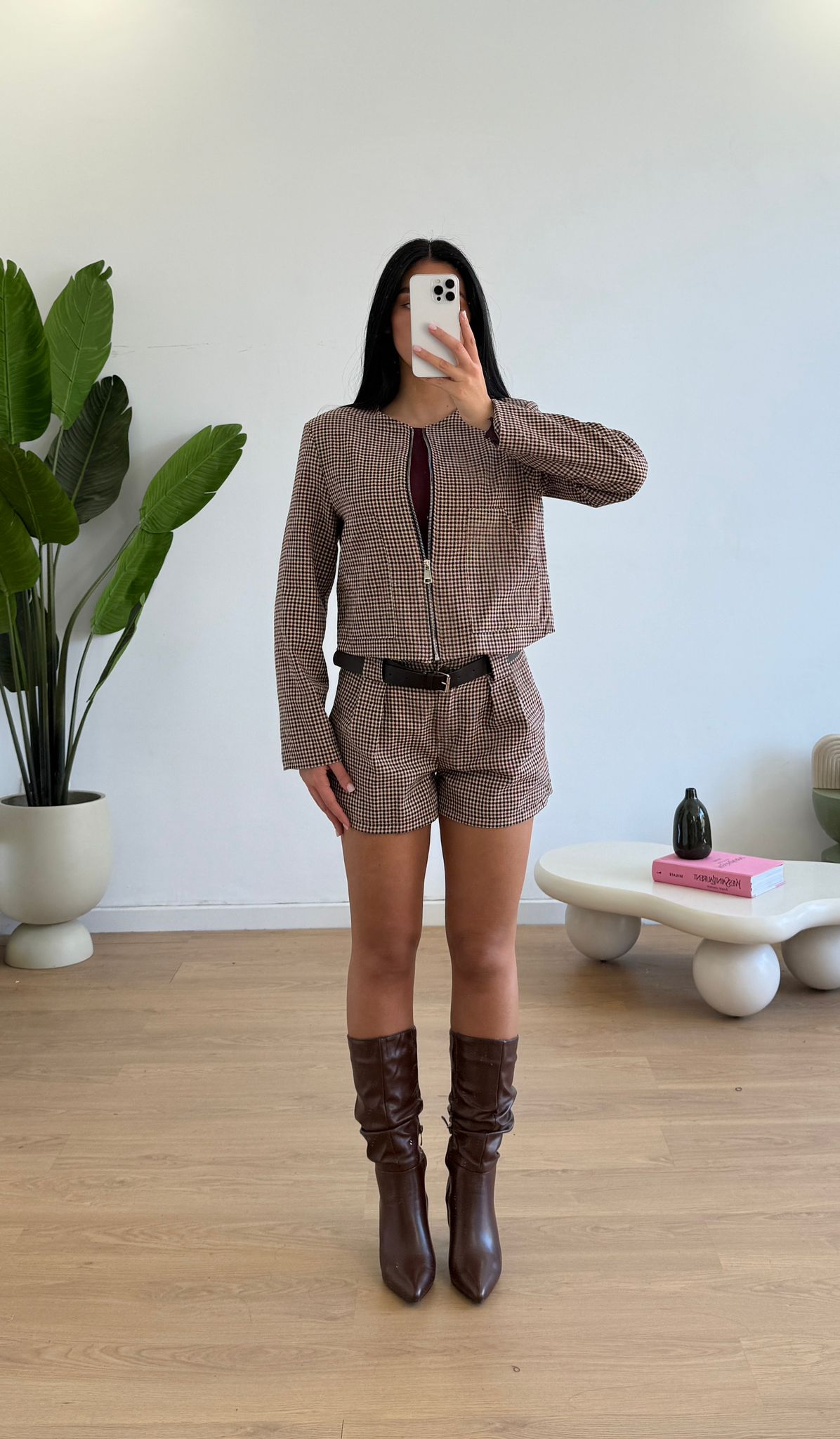 Coordinato da donna composto da giacca crop con spalline imbottite e gonna a pantaloncino con cintura inclusa e veste bene fino ad una M piena