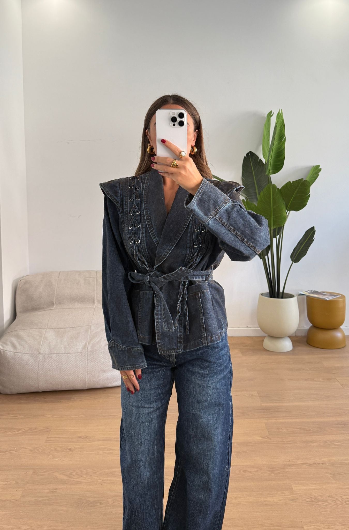 Giacca da donna in denim con cintura compresa e veste regolarmente la propria taglia e al modella indossa taglia S/M