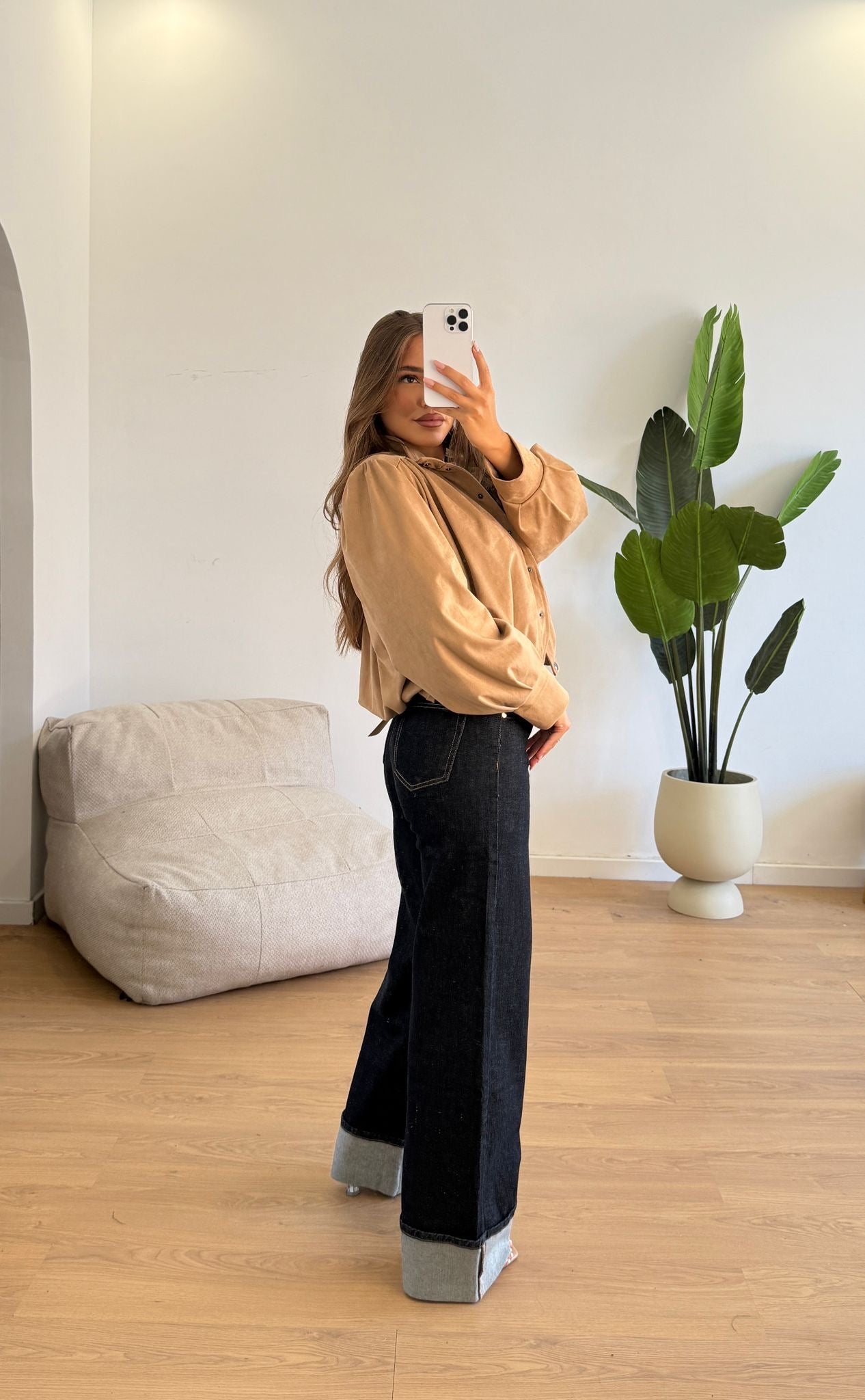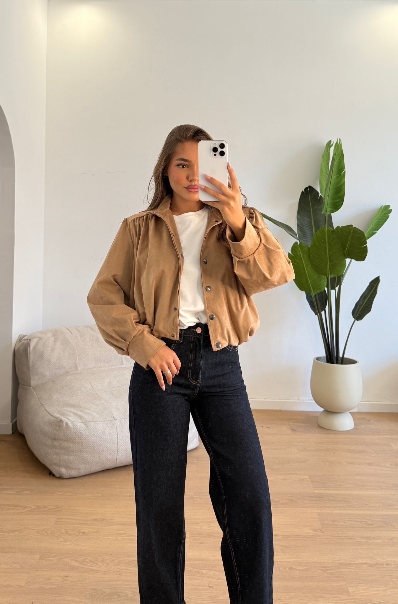 Giubbino da donna con spalline imbottite, tessuto camoscio e vestita bene fino ad una M/L