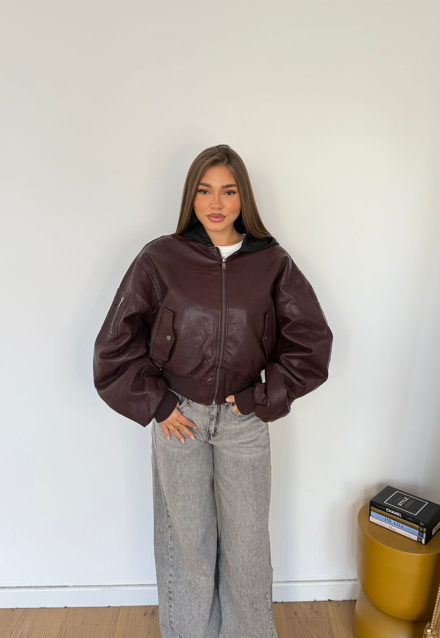 Giubbino da donna in ecopelle, foderato internamente con cappuccio in polsini, top quality e veste regolarmente la propria taglia e la modella indossa taglia S/M
