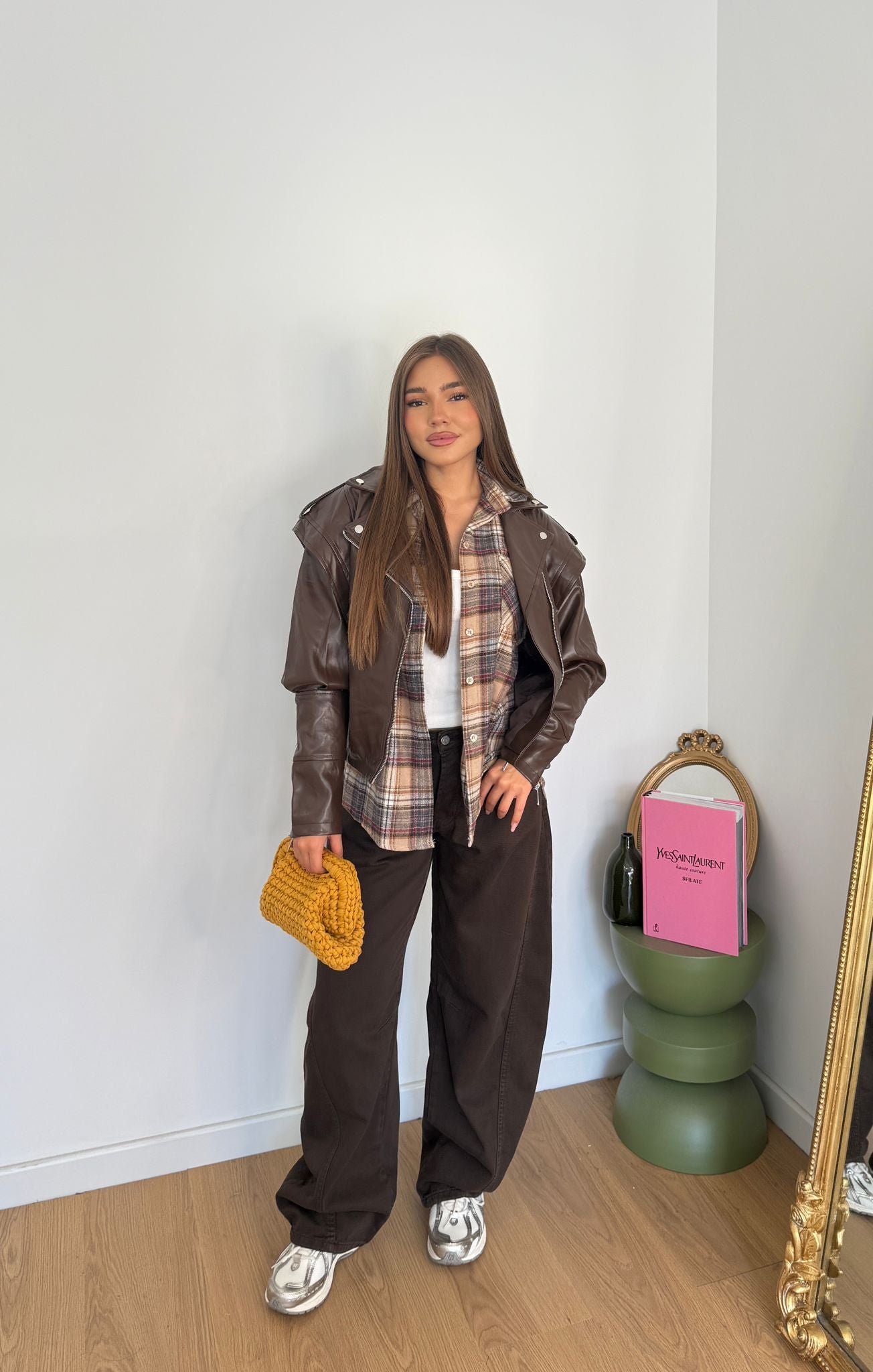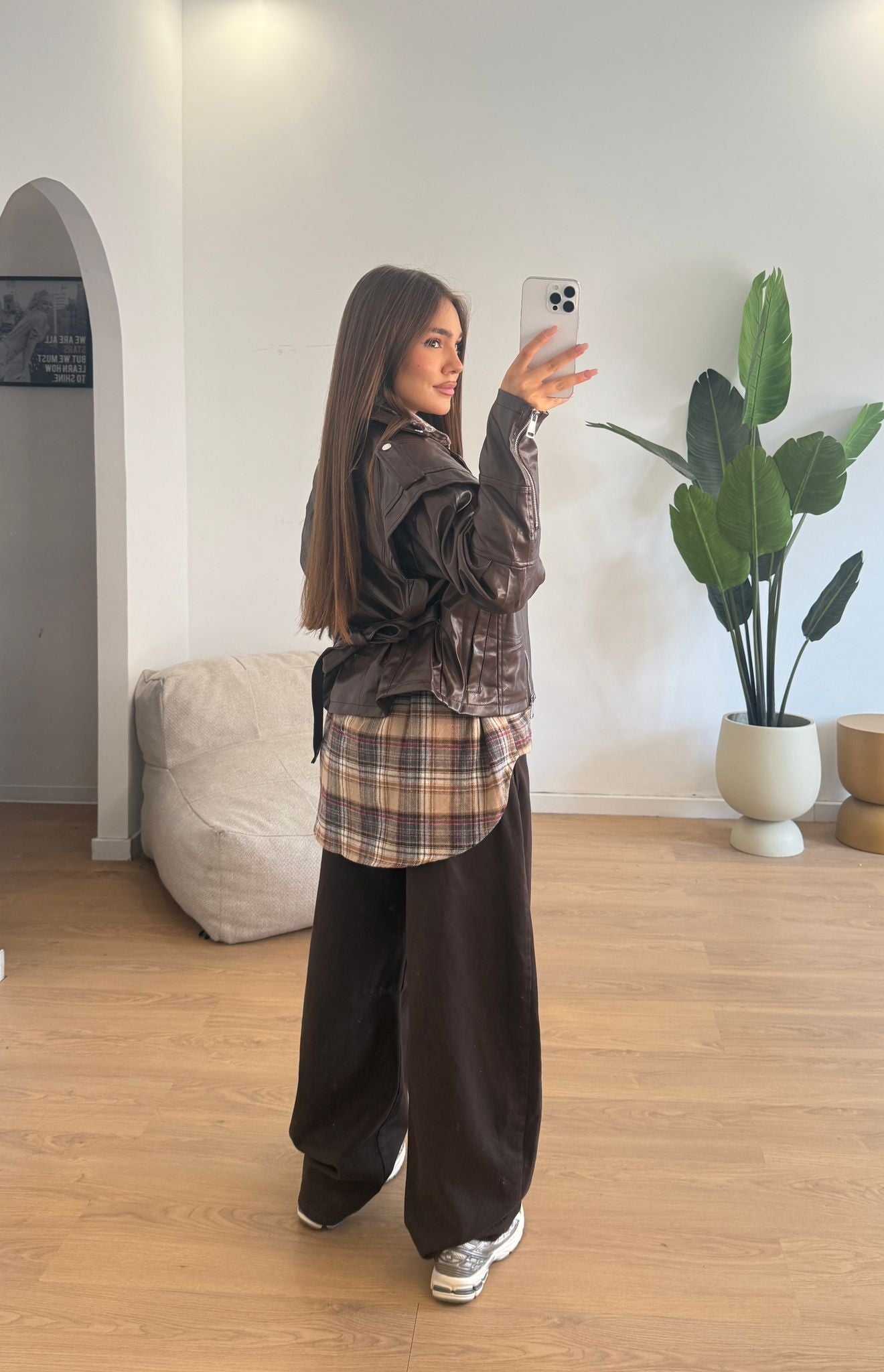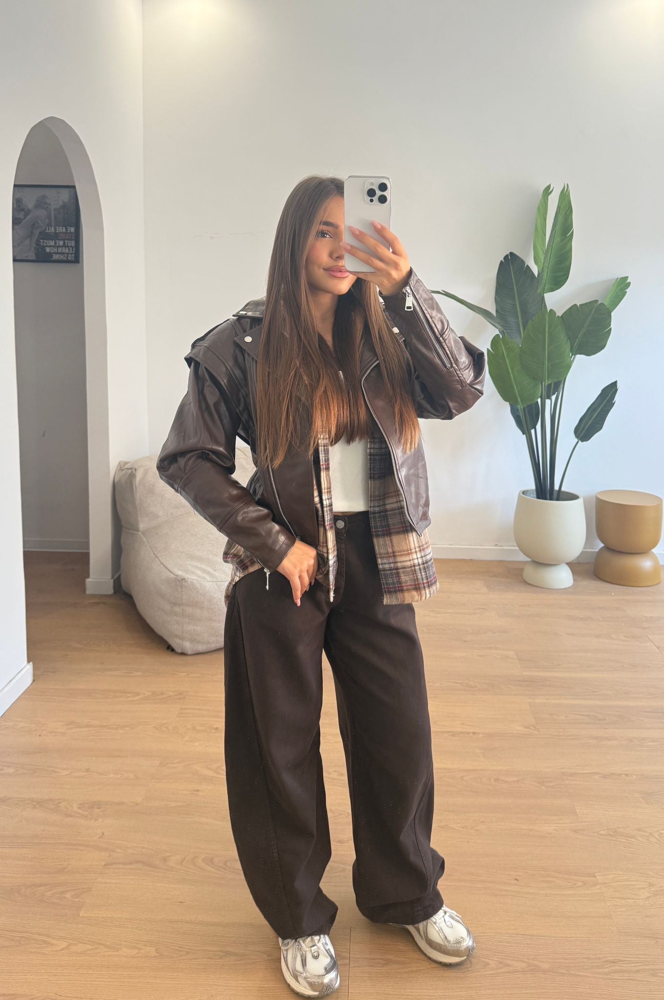Giubbino da donna in ecopelle foderato internamente e veste regolarmente la propria taglia e la modella indossa taglia S/M