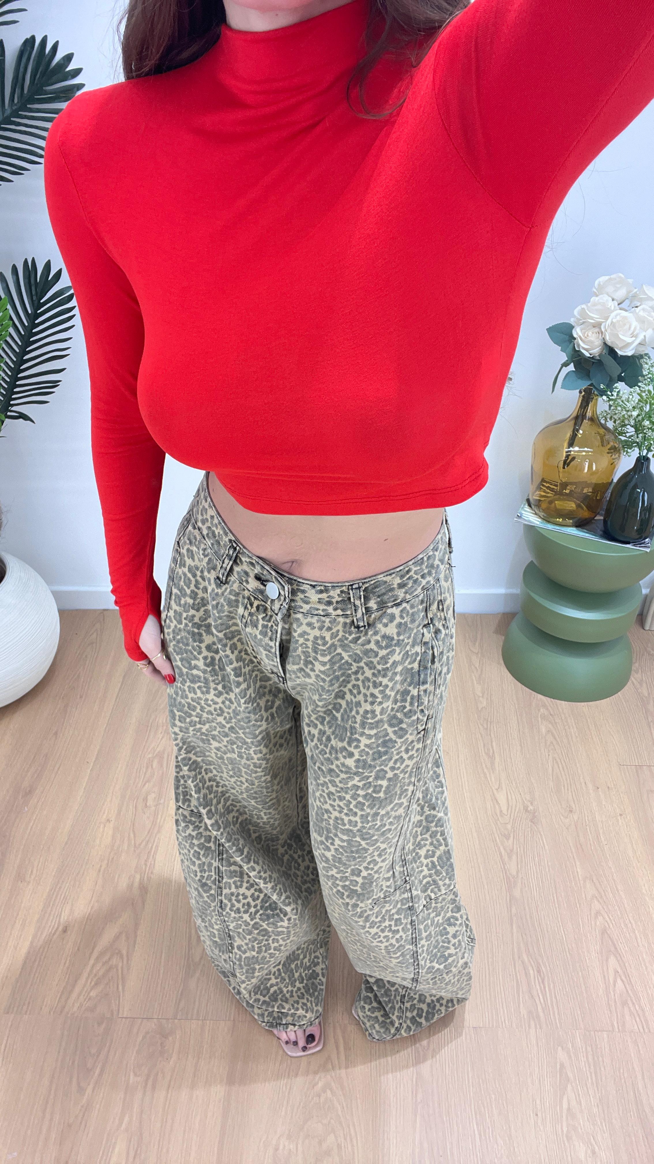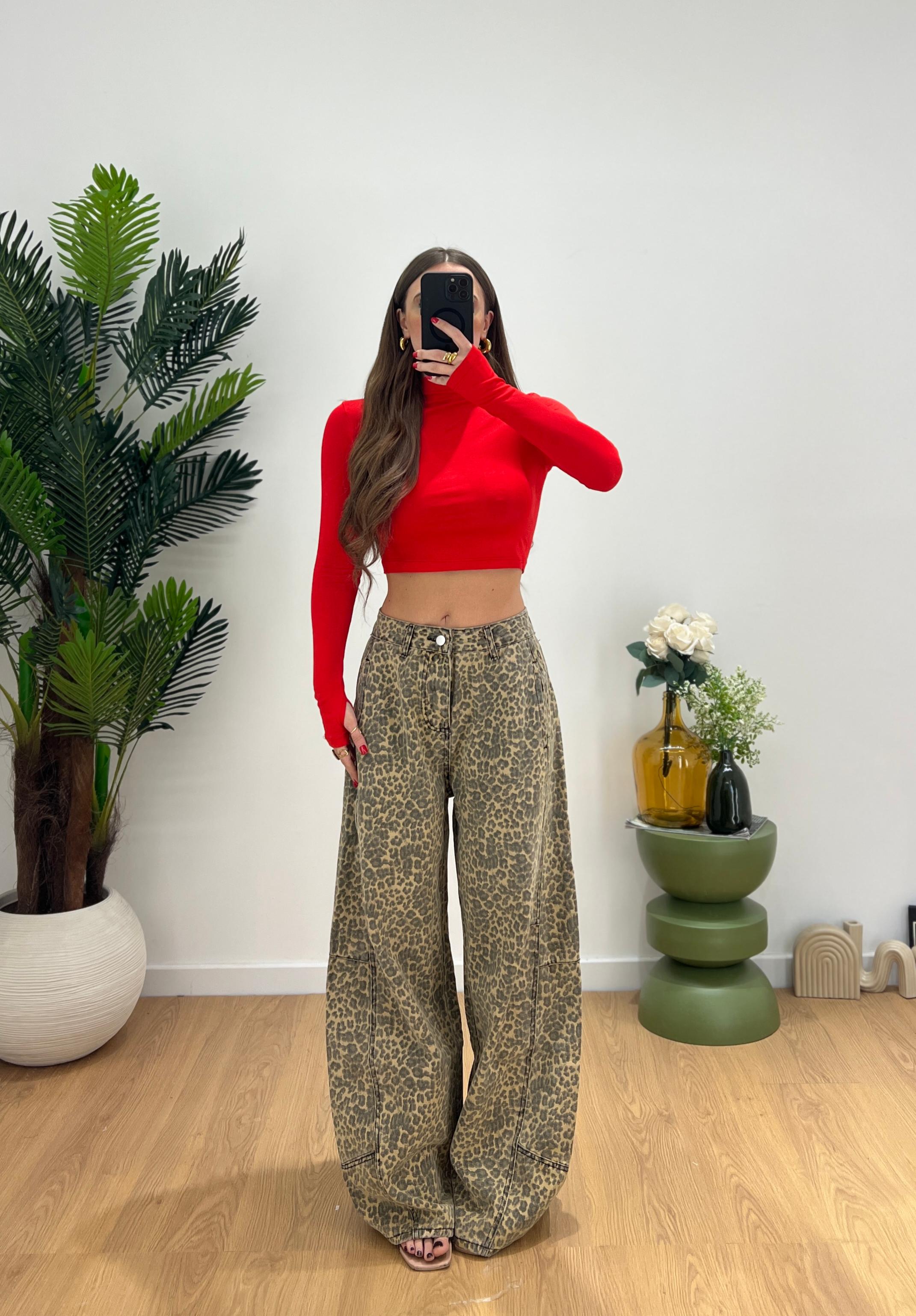 Jeans da donna in tela fissa modello ballon fit fantasia leopradata, veste regolarmente la propria taglia e giusy indossa taglia XS