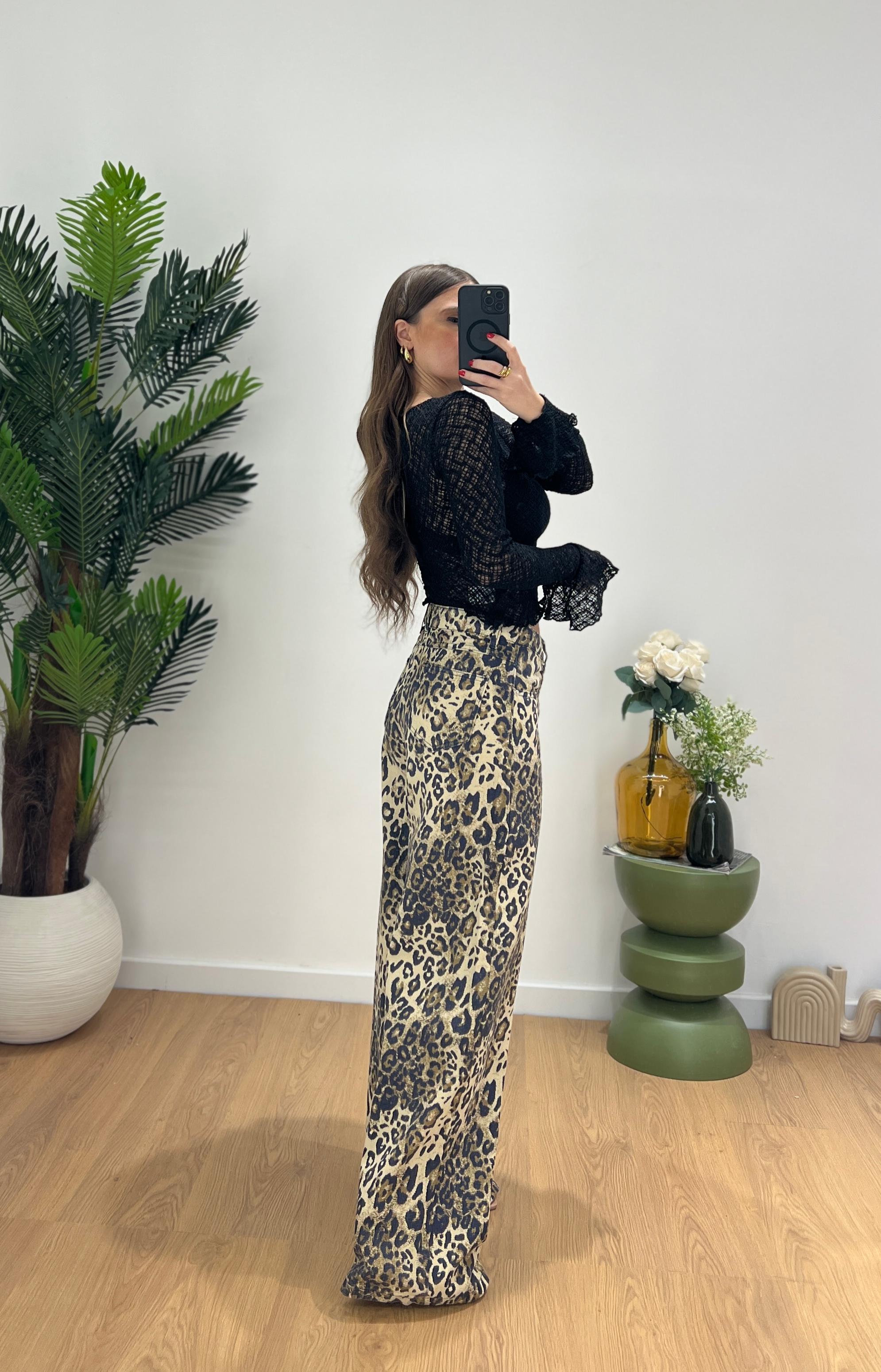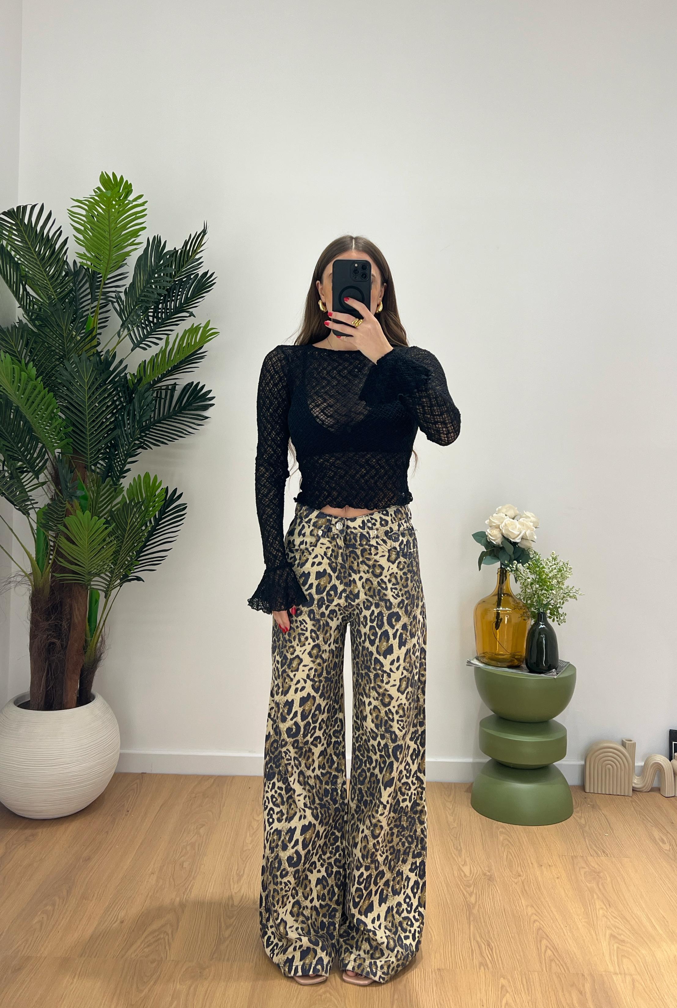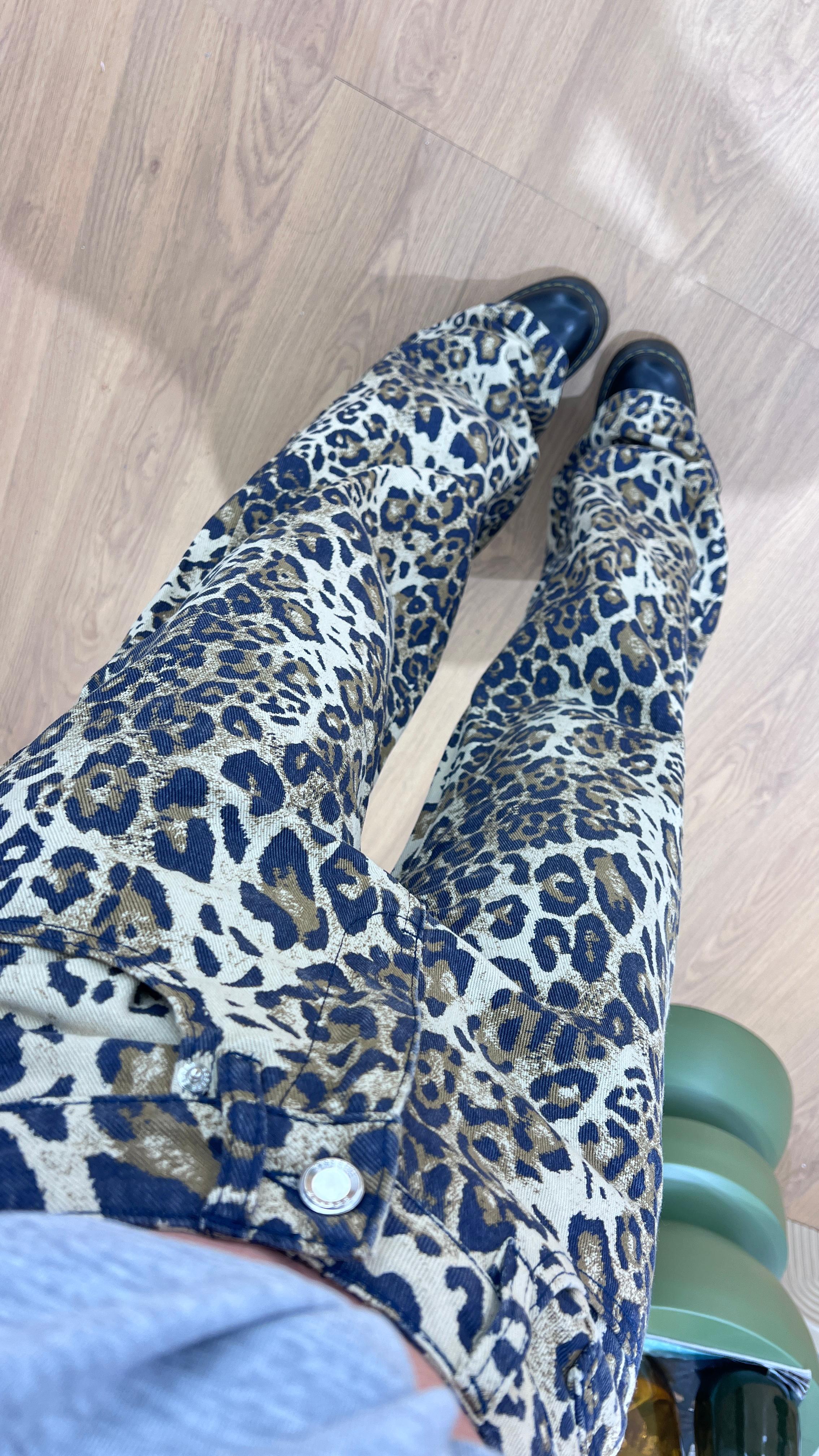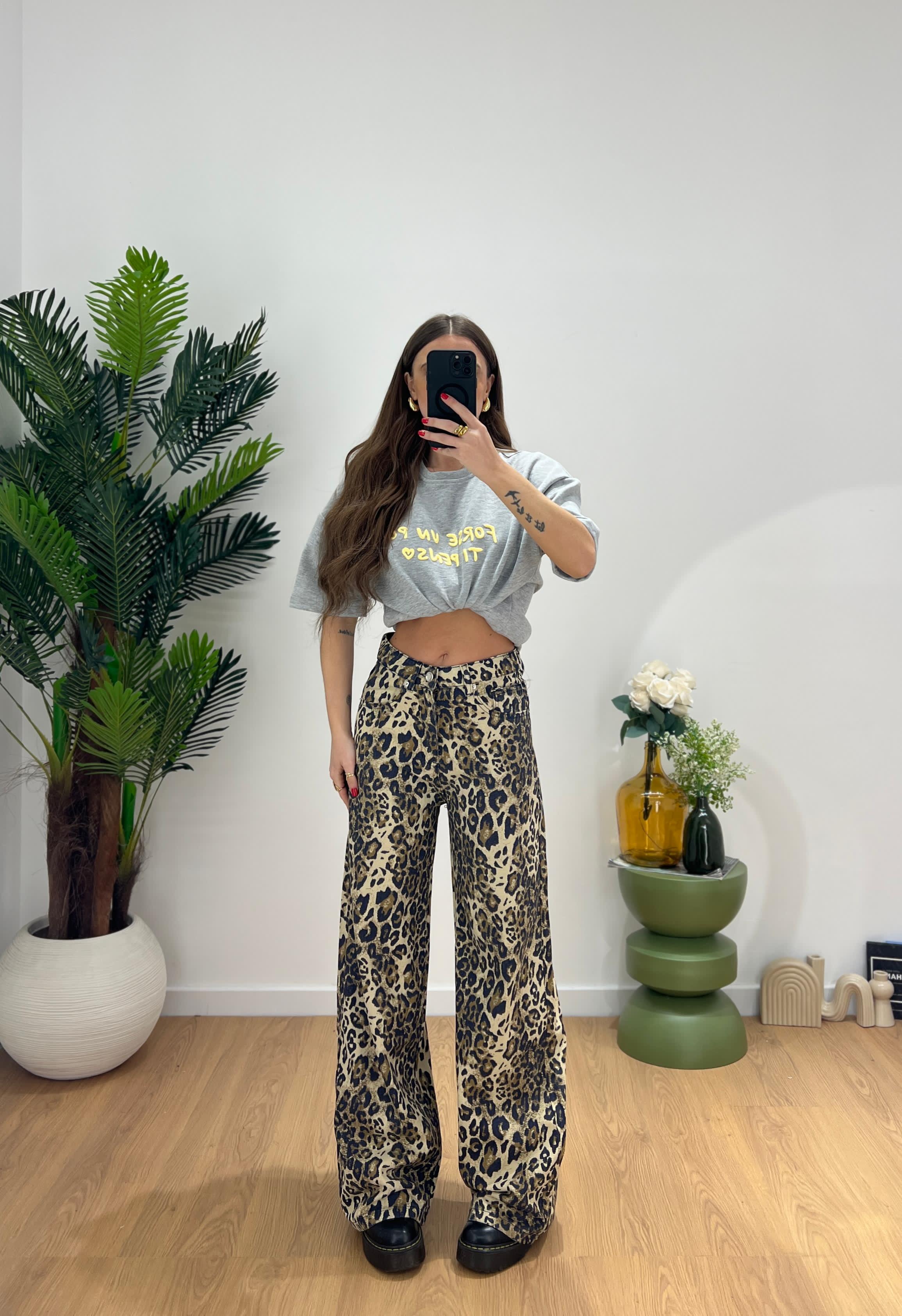 Jeans da donna fantasia leopardata modello wide leg in tela fissa non elasticizzato ma veste regolarmente la propria taglia e giusy indossa taglia XS