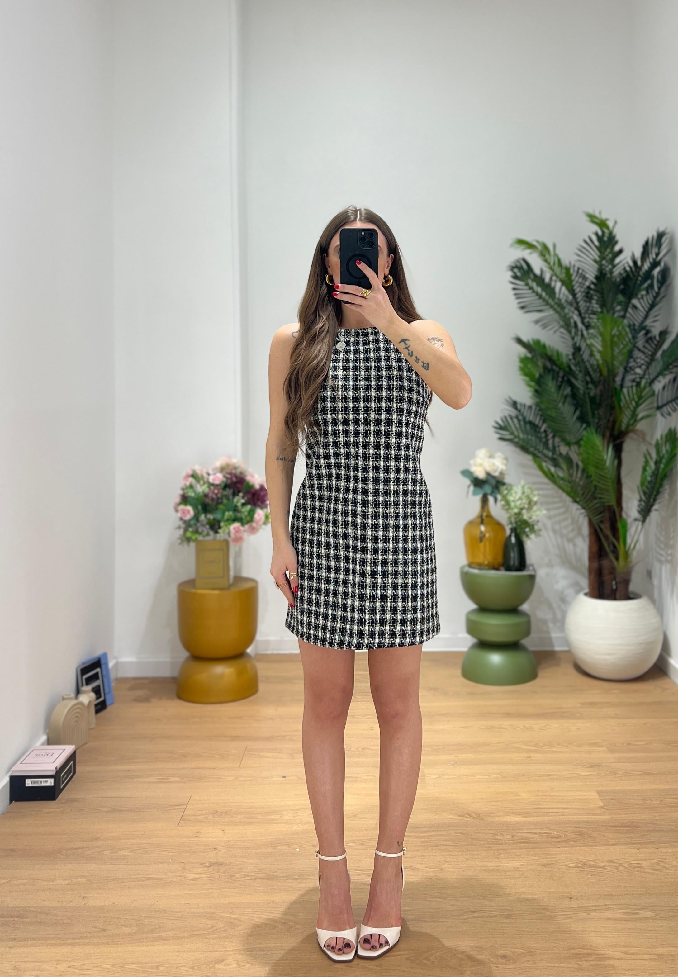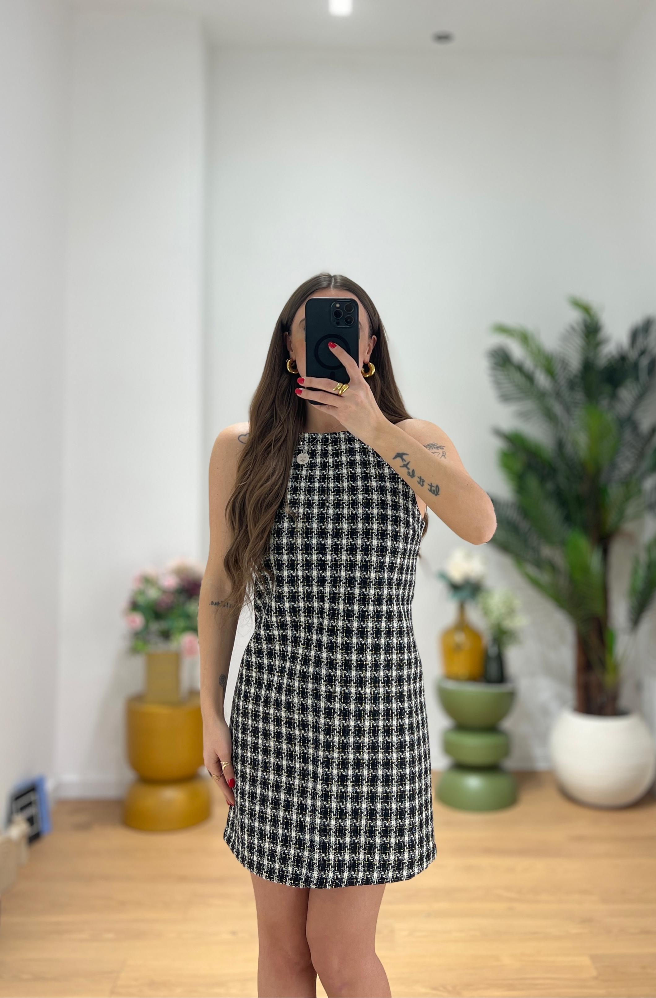 Abitino da donna by Lumina top quality modello tweed con scollo squadrato e chiusura zip sul retro, veste regolarmente la propria taglia e Giusy indossa taglia S