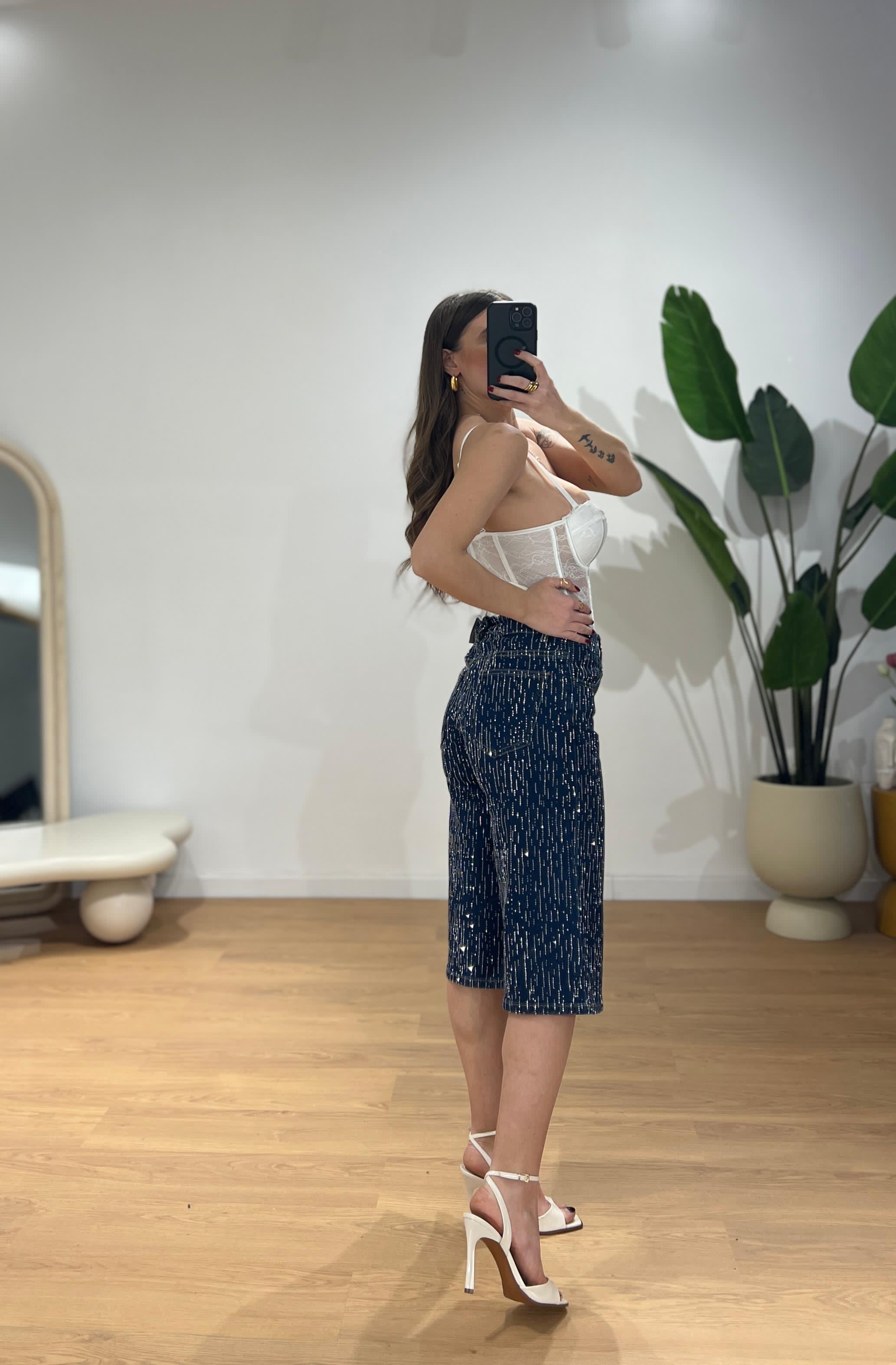 Bermuda da donna in denim scuro, tessuto elasticizzato e ricoperto completamente di strass sia sul davanti che sul retro. Veste regolarmente la propria taglia e Giusy indossa la taglia XS.