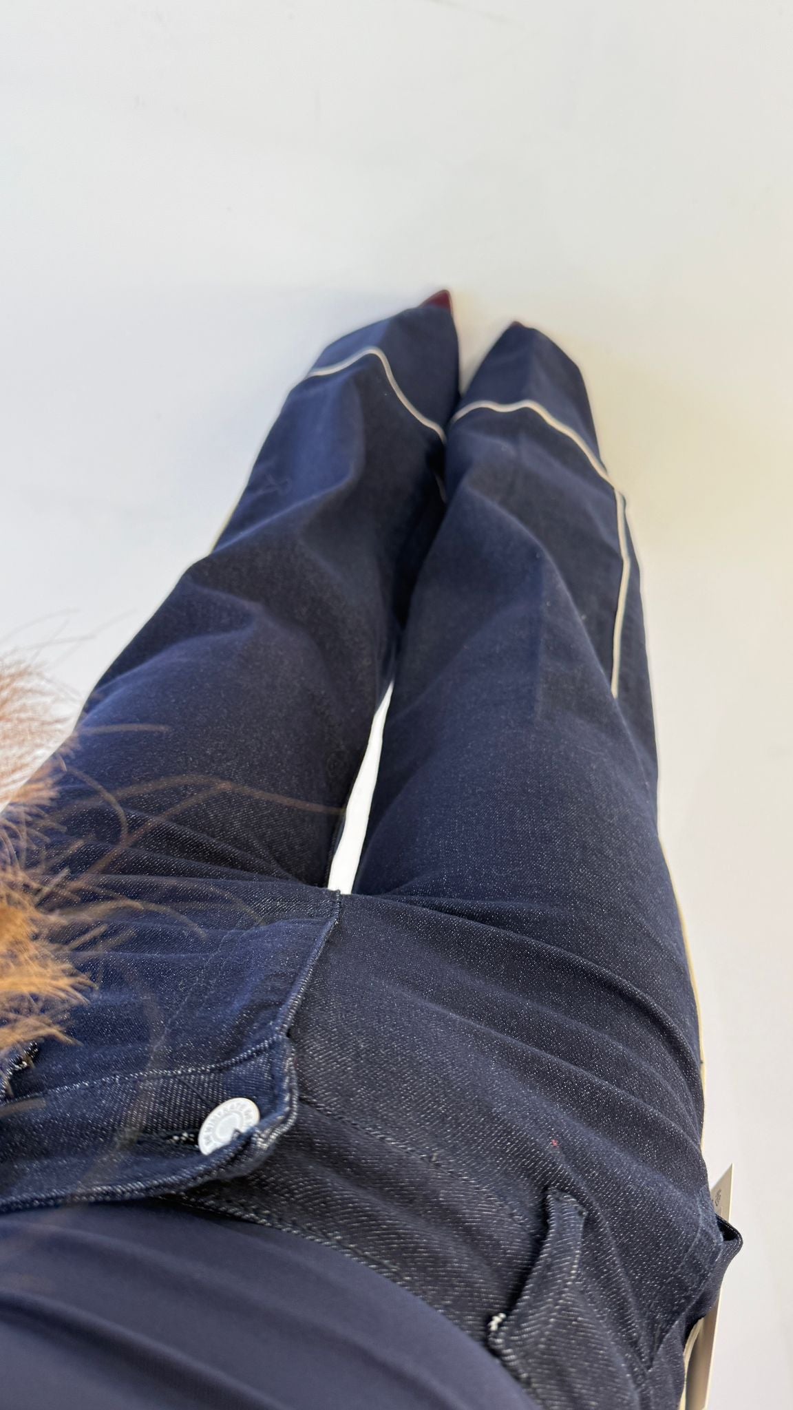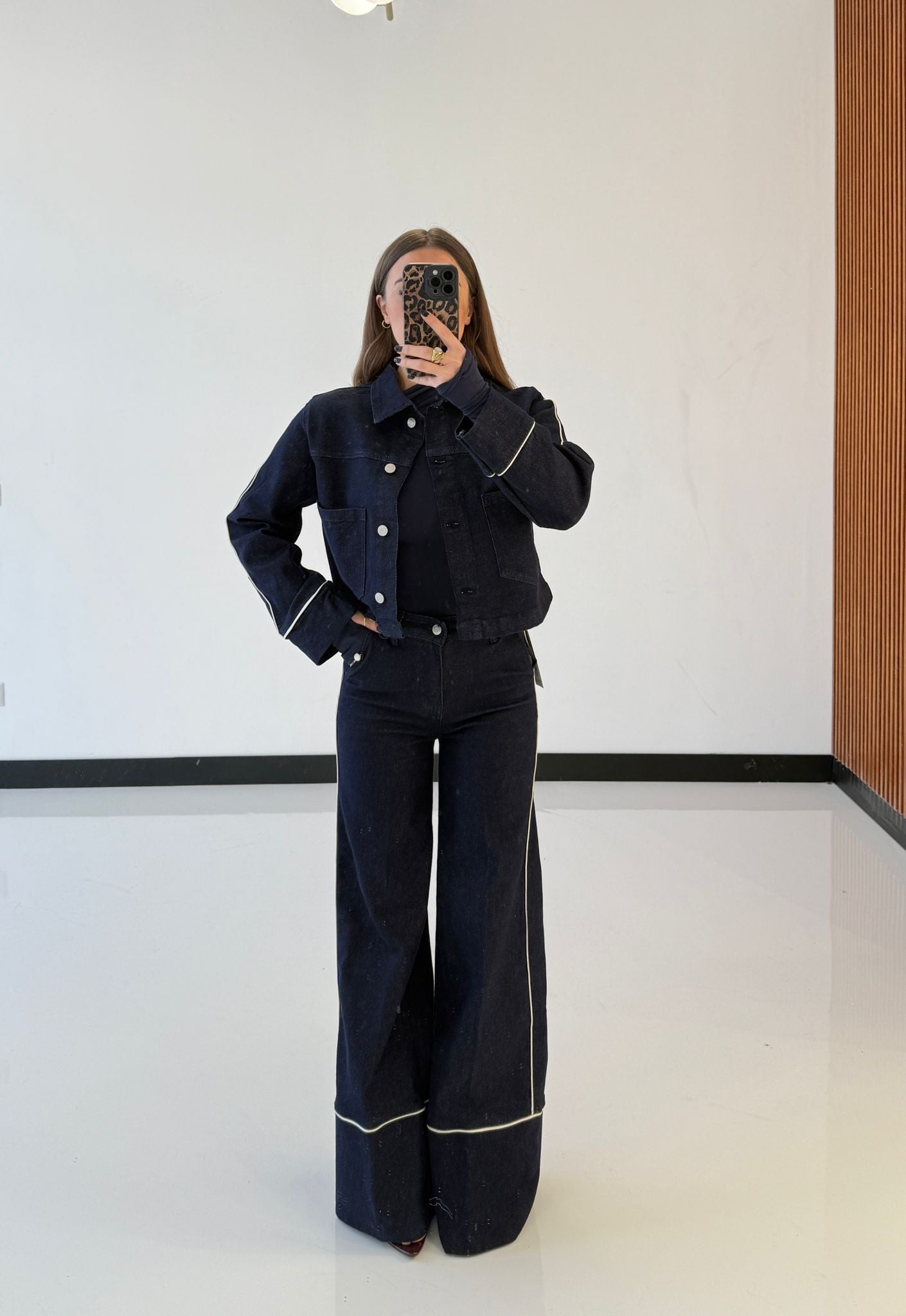 Coordinato da donna in denim composto da gena vita alta e giubbino crop tessuto elasticizzato e veste bene la propria taglia e la modella indossa taglia S