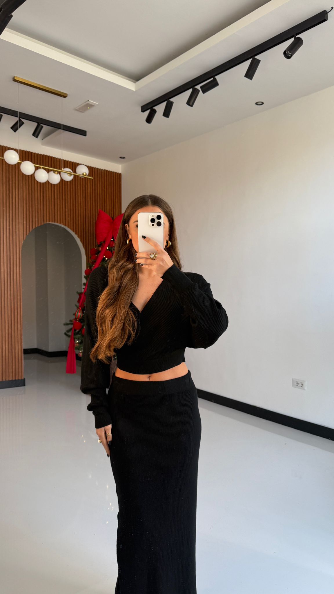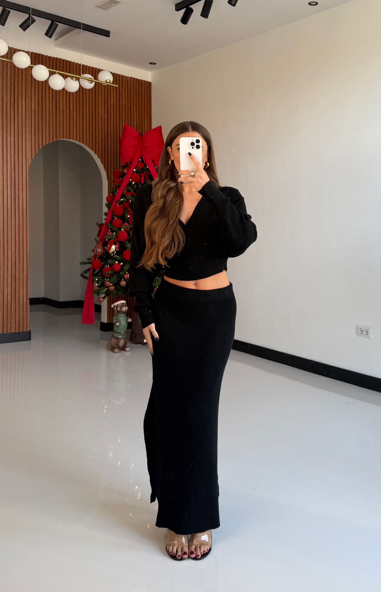 Coordinato da donna composto da maglia crop e gonna con spacco laterale, tessuto elasticizzato in caldo cotone e vestirà bene fino ad una M/L