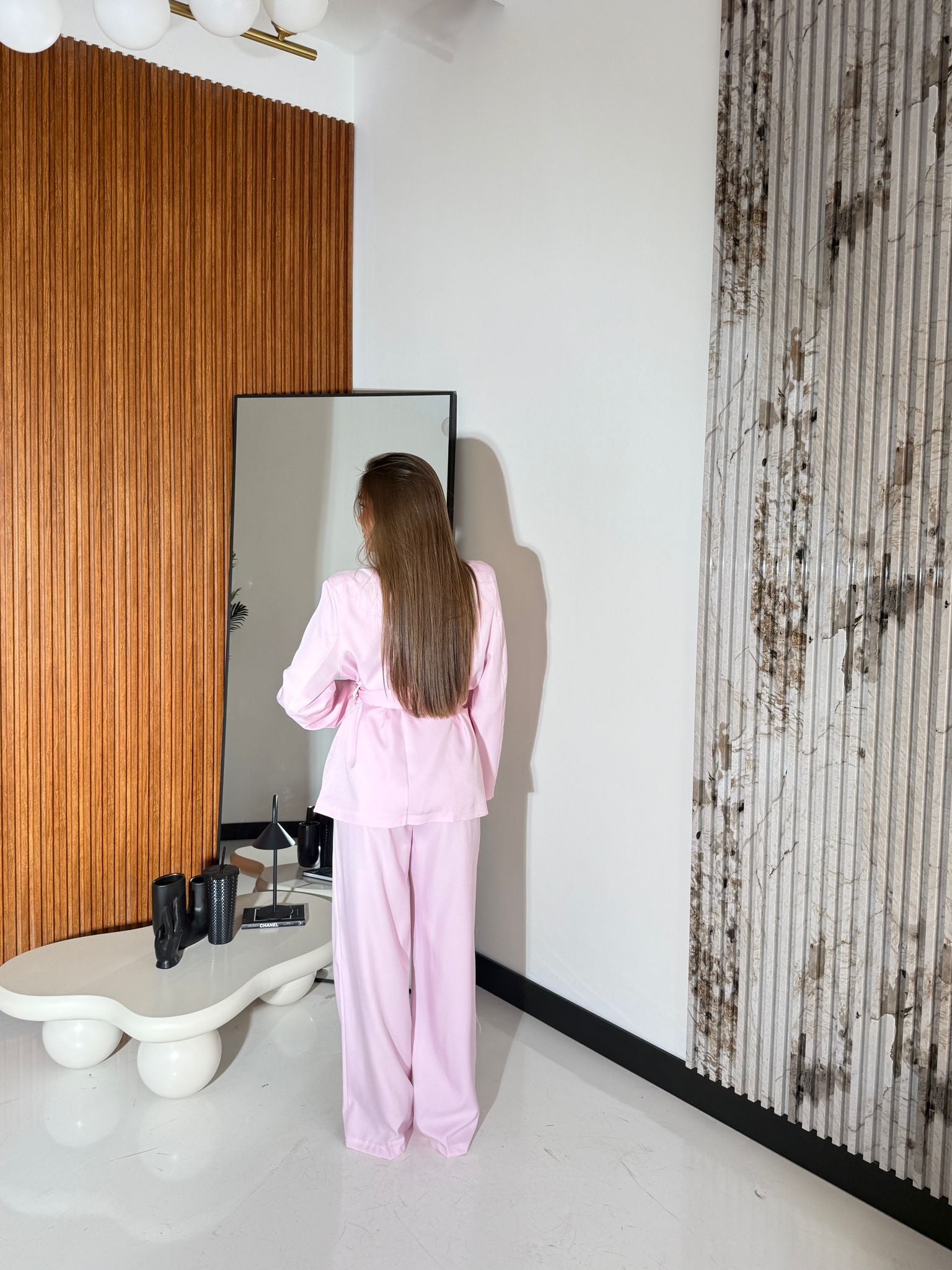 Coordinato composto da giacca foderata internamente, con spallina imbottita e tasche sul davanti, e da pantalone con gamba dritta e morbida, bottone sul davanti ed elastico sul retro. Taglia unica, e veste bene fino ad una M/L. La modella è alta 1,65 e pesa 52/53kg.